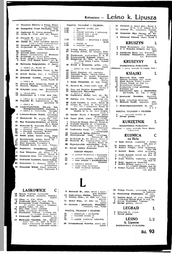 Kotomierz 17 90 14 11 41 64 99 46 82 78 27 48 34 9 36 30 61 83 97 45 18 12 13 50 52 6 5 51 32 95 81 75 60 8 57 54 63 1 9 9 85 70 Elewatory Zbożowe w Polsce, Elewa tor Kruszwica Ewangelicki Urząd Parafialny, Kole jowa 36 Gąslorowa R., Interes zbożowy Gierkę H., właśc. dóbr r y c , Polanowlce Olżewsld W., tow. kolon. — (dod.) m.. Rynek 14 Gliński St., skład wyrobów tytonio wych i wódek monopolowych Głowacki Jarosław, budowniczy Grojnowska N., wymiana mąki na zboże, Poznańska 19 Gustafowo Gutorskl Józef, rzeżnictwo HlnscJi, Lachmlrowice, p. Włostowo Hofmańskl, dr, lekarz prakt. Hotel „ G o p l o " , Marla Daleszyńska Hotel „ P o d Białym Orłem", wł. W. Ruciński Hurtownia Nadgoplańska, A l . Jaskól— (dod.) m., Rynek 20 Jaczyński Władysław, Plaski, p. Bachorce Janicki Marian, kier., J. Kasprowi cza 10 Jankowski Czesław, Drogeria pod Lwem, Rynek 19 — (dod.) m. Jańczak Józef, księgarnia. Rynek 21 Kanarek Marian, rzeżnictwo. Ry nek 15 KobylniH - pałac, bar. WilamowitzMoeilenuorit — zarząd dóbr Koczorowicz A. 1 S-ka, dom roln.handl. — (dod.) m., J. Kasprowicza 11 Kopański M . , budownictwo, J. Ka- I sprowicza 10 — (dod.) m. Landwirtschaftllche Eln-und Verkaufsgenossenschaft, Zamkowa 2 — (dod.) m. kierownika, Kazimie rza W. 2 Lehmann-Nitsche Rudolf, Oocanowo, majętność Maciejowski St., prezes Zw. Zaw. Prac. Cukrowni Maj. Kruszwica-Orodztwo, wł. Elżbie ta v. Heyne Makowski H., Kujawska Wytw. Win — (dod.) m. dyr. — plantacje owocowe, Potrzymiech — plantacje owocowe, Wróble — m. właśc, Poznańska 3-4 Malak Julian, handel zboża, Stary Rynek 1 Marcinkowski, apteka. Rynek 18 Mazalon Tadeusz, Gocanowo Młyn Kujawski, Poznańska 9 Panieński Karol, ks. prob., Polanowice Państwowe Gospodarstwo Rybne, Zamkowa 8 Paul Władysław, skł. żelaza i art. budowl.. Rynek 8 Pawłowski Artur, insp. plantacji 1 ko lejek Piotrowski Kazimierz, handel bydłem, Rynek 11 Plotroslńskl T . , Maszyny rolnicze I przemysłowe Ploszyńskl Witold, lekarz weteryna ryjny, Fabryczna 8 LASKOWICE 18 10 C Bctyna Tadeusz, restaurator Bloch Herbert, ziemianin, Grabowa Buchta 15 Claus, w l . dóbr, Dolsk 8 Czajkowski Józef, w l . maj. Belno 23 Ewangelicki Urząd Parafialny; Wol ter, pastor, Jeżewo k. Laskowic 1 Gordon Franc, w l . dóbr 21 Hlnz Emil, mistrz rzeżnlckl 7 Kolej, ekspedycja towarowa 22 Kosobudzkl Tadeusz, wymiana mą ki i handel zboża, Jeżewo 4 Liszkowski Zygmunt, ziemianin, L l plenkl 13 Markowski Stanisław, Inż., delegat zjedn. fabr. zw. azot. w Mosclcach I Chorzowie na wojew. po morskie, Laskowice—osady Leśno POCZTA, TELEGRAF I TELEFON: 124 — naczelnik urzędu, gab. 103 — m. 121 — oddział kontrolny I techniczny — oddział rent i gazet — oddział wekslowy — telegral 123 — okienko — dekartacja I ekspe dycja 127 — monter, m. 126 — warsztat napraw 42 Policja Państw., posterunek 87 Posadzy Antoni, wł. ziemski, Sław sko-'rórne 79 Prusinowski, spedytorstwo P. K. P. 26 Przybyszewski Zygmunt, Olżewo 35 Radajewski St., nast., wł. Kocimskl T., skład żelaza I artyk. budowl — (dod.) m. 38 . Rolnik w Kruszwicy, spółdz. roln.handl. — (dod.) m. kler. Głowińskiego 68 — 43 Ruttie Zbigniew, dyr. cukrowni 59 Schneider Eugen., Sławsko-Górne 84 Schoenborn, ks. prałat, Koleglacka 65 Schwarfz, ks. dziekan, SlawskoWle'kle 3 Seyda Władysław, wł. maj. Tarno wo 71 Skowron M., mistrz rzeźn.-wędl., Ko lejowa 2 52 Spar und Darlehns Kassenverein 74 Spółdzielnia Mleczarska — (dod.) m. kier. 86 Stankiewicz Michał, hurt. t y t . . Ry nek 19 29 Sukowy, pow. Mogilno, zarząd ma jętności 98 Sytek Czesław, m. rzeźn.. Rynek 20 31 Szeliga St., wlaśc. St. Koluśniewskl, tow. kol. I restauracja. Rynek 21 91 Szkoła powszechna publiczna I I I stopnia nr 1 , im. Jana Kaspro wicza 4 20 Szkółki Drzew 1 Krzewów Józefa Kossowskiego 1 0 2 Tanaś Józef, mistrz rzeżn.-wędlin.. Kolejowa 29 7 Teikowski Roman, bławaty, Rvnek 11 4 Trzciński Edward, dr, Gocanówko 55 Tymltowski M., handel zboża i prze tworów zbożowych 55 Tymkowska Łucja, skł. tow. kolon. i delikatesów 16 Twardowski Stefan, Głębokie 89 Wletrzykowskl Leon, rzeżnictwo, Sławsko-W. 36 39 WolkowskI B., skł. bławat.. Rynek 8 88 Wojtczak M . , wypożyczalnia samo chodów. Rynek 10 4 8 Wypożyczalnia samochodów, Wojt czak M , Rynek 10 81 Zarząd Gminny Kruszwica 24 56 94 22 ZARZĄD MIEJSKI: — gabinet burmistrza 1 mieszkanie prywatne — gazownia miejska, Goplańska 9 — kasa miejska 1 przedsiębiorstw miejskich — sekretarz miejski — urząd stanu cywilnego — biuro ewidencji ludności L 9 Murawski Br., młyn, tartak I majęt ność Bedienkl 12 Nadleśnictwo Państw., Dąbrowa 3 Nehrlng Maks., w l . dóbr r y c , Krąplewicc 1 1 Nlebof Maks., wł. dóbr r y c , Skarszewo 14 Paschalis - Jakubowicz Władysław, ziemianin, maj., Pólko POCZTA, TELEGRAF I TELEFON: 30 — ekspedycja I paczkarnla 39 — naczelnik urzędu, b. 37 — ,. ,. m. 38 — oddział nadawczy (okienko) 20 Poćwlardowsld Walerian, mistrz pie karski 33 72 23 2 k. Lipusza Zawadzki J., lekarz dent., Rynek 8, 9—1; 4—6, soboty 9—1 Zieliński Fr., rzeżnictwo, Poznań ska 17 Ziemiański Mtyn Parowy, w l . Ele onora Twardowska Zientarski Edmund, lekarz, Rynek 8 KRUSZYN 2 3 6 4 L Haack Włodzimierz, maj, Demblce S. S. Wilhelma Kriegera, maj. śwlcsław Sulimierska Marla, maj. Kruszynek Zawadzka Władysława, ziemianka, maj. Wlcbrowlce KRUSZYNY ROZMÓWNICA PUBLICZNA (Abonenci — patrz centrala Konojady L Pom.) KSIĄŻKI L 12 Baczewski Oton, rolnik 13 Baliński Stanisław, kier. szkoły 15 Blank Helmut, Polskie Łopatki 6 Cleinow Pa wet, wł. dóbr ryc. 8 Deutschmann Ksawery 10 Ewangelicki Urząd parafialny 5 Hoffmann Jan 9 Hohenkirchcr Spar- u. Darlehnskassen-Verein, Sp. zap. z nieogr. odp. 2 Jaranowski Bronisław, oberżysta, Osieczek 11 Kolej, ekspedycja towarowa 7 Michaells Ewald, wypożycz, młoc karni 3 Molkereigenossenschaft, Sp. zap. z o. o. POCZTA, TELEGRAF I TELEFON: 1 — nacz