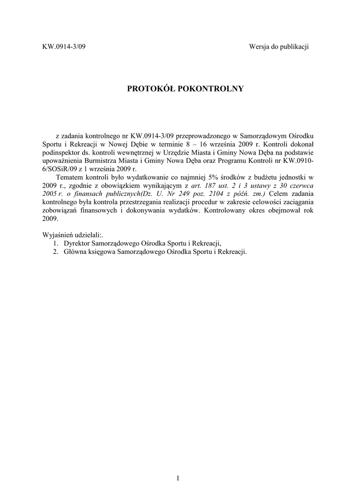 KW.0914-3/09 Wersja do publikacji PROTOKÓŁ POKONTROLNY z zadania kontrolnego nr KW.0914-3/09 przeprowadzonego w Samorządowym Ośrodku Sportu i Rekreacji w Nowej Dębie w terminie 8 – 16 września 2009 r. Kontroli dokonał podinspektor ds. kontroli wewnętrznej w Urzędzie Miasta i Gminy Nowa Dęba na podstawie upowaŜnienia Burmistrza Miasta i Gminy Nowa Dęba oraz Programu Kontroli nr KW.09106/SOSiR/09 z 1 września 2009 r. Tematem kontroli było wydatkowanie co najmniej 5% środków z budŜetu jednostki w 2009 r., zgodnie z obowiązkiem wynikającym z art. 187 ust. 2 i 3 ustawy z 30 czerwca 2005 r. o finansach publicznych(Dz. U. Nr 249 poz. 2104 z późń. zm.) Celem zadania kontrolnego była kontrola przestrzegania realizacji procedur w zakresie celowości zaciągania zobowiązań finansowych i dokonywania wydatków. Kontrolowany okres obejmował rok 2009. Wyjaśnień udzielali:. 1. Dyrektor Samorządowego Ośrodka Sportu i Rekreacji, 2. Główna księgowa Samorządowego Ośrodka Sportu i Rekreacji. 1 I. Wewnętrzne procedury kontroli i polityka rachunkowości Przedmiotem zadania kontrolnego było przestrzeganie w Samorządowym Ośrodku Sportu i Rekreacji, zwanym dalej Ośrodkiem, procedur kontroli, o których mowa w art. 47 ustawy z 30 czerwca 2005 r. o finansach publicznych(Dz. U. Nr 249, poz. 2104, z późń. zm.), przy zaciąganiu zobowiązań i dokonywaniu wydatków. Ostatnia kontrola w tym zakresie przeprowadzona była w Ośrodku w okresie 15 – 31 grudnia 2008 r. W poprzedniej kontroli wytknięto brak procedur kontroli wewnętrznej w Ośrodku. W wyniku bieŜących czynności kontrolnych stwierdzono, Ŝe procedury kontroli wewnętrznej zawarte są w instrukcji w sprawie obiegu dokumentów i kontroli wewnętrznej dowodów księgowych w ramach rachunkowości prowadzonej przez Samorządowy Ośrodek Sportu i Rekreacji w Nowej Dębie. Analiza przepisów wymienionego aktu prawa wewnętrznego pozwala stwierdzić, Ŝe nie wyczerpują one obowiązkowych uregulowań wymienionych w art. 47 ust. 2 ustawy o finansach publicznych. Brakuje, w szczególności, procedur dotyczących procesów badania i porównanie stanu faktycznego ze stanem wymaganym w zakresie dotyczącym procesów pobierania i gromadzenia środków publicznych oraz udzielania zamówień publicznych oraz zwrotu środków publicznych. Zapisy instrukcji zawierają jedynie bardzo ogólne procedury dotyczące zaciągania zobowiązań finansowych i dokonywania wydatków oraz dodatkowo określają pracowników odpowiedzialnych za rzeczowe składniki środków trwałych. Tym samym obowiązek kierownika jednostki sektora finansów publicznych ustalenia pisemnych procedur kontroli wewnętrznej, wynikający z art. 47 ust. 3 ustawy o finansach publicznych nie został w pełni zrealizowany. Odpowiedzialność za to ponosi Dyrektor Ośrodka. W ramach czynności kontrolnych sprawdzono równieŜ dokumentację opisującą w języku polskim przyjęte w Ośrodku zasady rachunkowości. Zasady te zawarto w zarządzeniu nr 3/2008 Dyrektora Ośrodka z 22 września 2008 r. w sprawie zasad prowadzenia rachunkowości i ustalenia planu kont. Nie było zmian od poprzedniej kontroli przeprowadzonej z inicjatywy Burmistrza w 2008 r. Nie uwzględniono zaleceń pokontrolnych nr KW.0914-5/SOSiR/08 wydanych 26 stycznia 2009 r. w zakresie rachunkowości, o których mowa w pkt 1 – 3, a mianowicie: 1) wykaz kont księgi głównej nie został uzupełniony o wykaz kont ksiąg pomocniczych, które mają być prowadzone do poszczególnych kont księgi głównej, wykaz ten jest wymagany zgodnie z § 12 ust. 1 pkt. 2 rozporządzenia Ministra Finansów z 28 lipca 2006 r. w sprawie szczególnych zasad rachunkowości oraz planów kont dla budŜetu państwa, budŜetów jednostek samorządu terytorialnego oraz niektórych jednostek sektora finansów publicznych(Dz. U. Nr 142, poz. 1020, z późń. zm.). 2) Brak opisu systemu informatycznego, zawierającego wykaz programów, procedur lub funkcji w zaleŜności od struktury oprogramowania, wraz z opisem algorytmów i parametrów oraz programowych zasad ochrony danych, w tym w szczególności metod zabezpieczenia dostępu do danych i systemu ich przetwarzania, a ponadto określenia wersji oprogramowania i daty rozpoczęcia jego eksploatacji – co jest niezgodne z art. 10 ust. 1 pkt. 3 lit c ustawy z 29 września 1994 r. o rachunkowości(tekst jednolity: Dz. U. z 2002 r. Nr 76, poz. 694, z późń. zm.). 3) W aktach wewnętrznych Ośrodka brak instrukcji inwentaryzacyjnej oraz kasowej, o których mowa w pkt 9 i 7 zarządzeniu nr 3/2008 Dyrektora Ośrodka. W Ośrodku nie ma pomieszczenia kasy więc zapis o instrukcji kasowej jest zbyteczny. W Ośrodku nie prowadzi się dodatkowej klasyfikacji wydatków dotyczącej obszarów, kategorii i podkategorii wydatków strukturalnych, opisanych w rozporządzeniu Ministra Finansów z 26 października 2007 r. w sprawie szczegółowej klasyfikacji wydatków 2 strukturalnych(Dz. U. Nr 209, poz. 1511). Jest to naruszenie obowiązku wynikającego z art. 16 ust.2 ustawy o finansach publicznych Odnotowano równieŜ pozytywne zmiany w prowadzeniu rachunkowości do których moŜna zaliczyć księgowanie w księgach rachunkowych, zobowiązań wobec kontrahentów Ośrodka na podstawie wystawionych przez nich zewnętrznych obcych dowodów księgowych(faktury, rachunki), zgodnie z art. 20 ust. 2 ustawy o rachunkowości oraz sporządzanie na koniec kaŜdego miesięcznego okresu sprawozdawczego zestawienia obrotów i sald kont księgi głównej, zgodnie z art. 18 ust. 1 ustawy o rachunkowości, jak równieŜ kont ksiąg pomocniczych. Zmiany te wprowadzono zgodnie z zaleceniami pokontrolnymi Burmistrza z 26 stycznia 2009 r. II. Porównanie stanu faktycznego ze stanem wymaganym Badaniu poddano sprawozdanie RB 28 s z wykonania wydatków Ośrodka za okres od stycznia do końca lipca 2009 r. Zgodnie z jego treścią plan wydatków wynosi 492 700 zł., zaangaŜowanie 376 174,08 zł, wydatki wykonane 