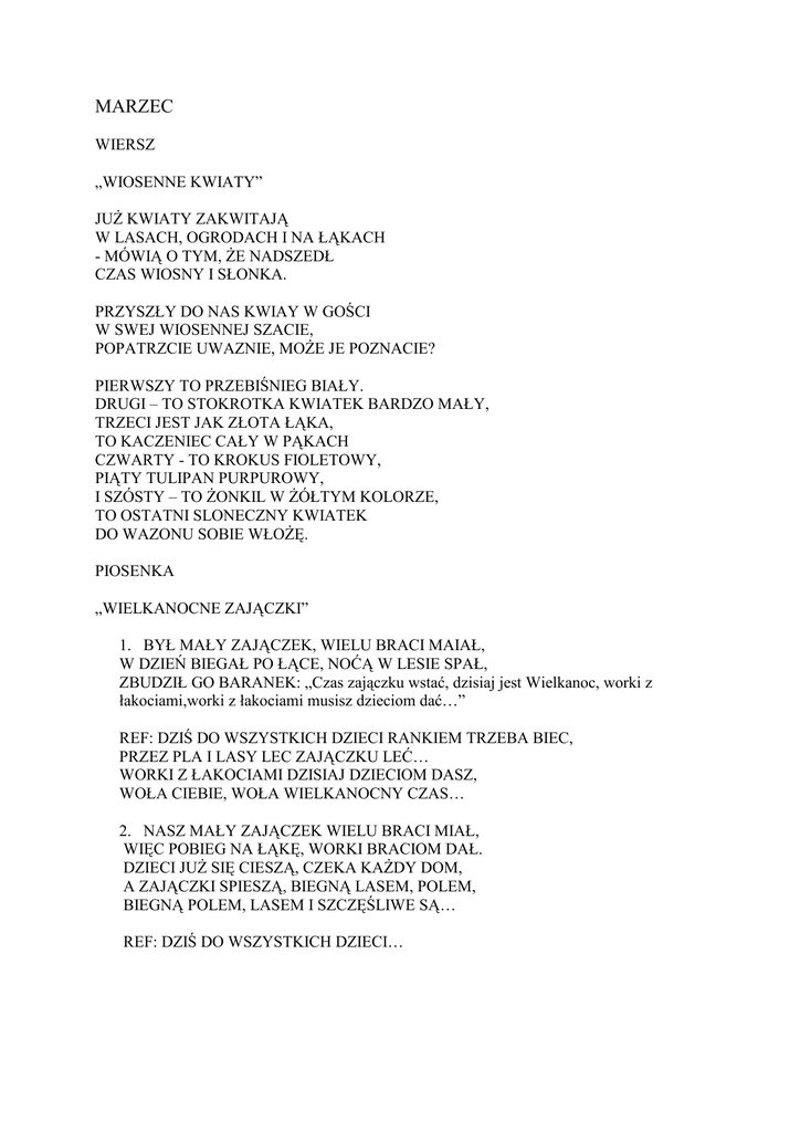 MARZEC WIERSZ „WIOSENNE KWIATY” JUś KWIATY ZAKWITAJĄ W LASACH, OGRODACH I NA ŁĄKACH - MÓWIĄ O TYM, śE NADSZEDŁ CZAS WIOSNY I SŁONKA. PRZYSZŁY DO NAS KWIAY W GOŚCI W SWEJ WIOSENNEJ SZACIE, POPATRZCIE UWAZNIE, MOśE JE POZNACIE? PIERWSZY TO PRZEBIŚNIEG BIAŁY. DRUGI – TO STOKROTKA KWIATEK BARDZO MAŁY, TRZECI JEST JAK ZŁOTA ŁĄKA, TO KACZENIEC CAŁY W PĄKACH CZWARTY - TO KROKUS FIOLETOWY, PIĄTY TULIPAN PURPUROWY, I SZÓSTY – TO śONKIL W śÓŁTYM KOLORZE, TO OSTATNI SLONECZNY KWIATEK DO WAZONU SOBIE WŁOśĘ. PIOSENKA „WIELKANOCNE ZAJĄCZKI” 1. BYŁ MAŁY ZAJĄCZEK, WIELU BRACI MAIAŁ, W DZIEŃ BIEGAŁ PO ŁĄCE, NOĆĄ W LESIE SPAŁ, ZBUDZIŁ GO BARANEK: „Czas zajączku wstać, dzisiaj jest Wielkanoc, worki z łakociami,worki z łakociami musisz dzieciom dać…” REF: DZIŚ DO WSZYSTKICH DZIECI RANKIEM TRZEBA BIEC, PRZEZ PLA I LASY LEC ZAJĄCZKU LEĆ… WORKI Z ŁAKOCIAMI DZISIAJ DZIECIOM DASZ, WOŁA CIEBIE, WOŁA WIELKANOCNY CZAS… 2. NASZ MAŁY ZAJĄCZEK WIELU BRACI MIAŁ, WIĘC POBIEG NA ŁĄKĘ, WORKI BRACIOM DAŁ. DZIECI JUś SIĘ CIESZĄ, CZEKA KAśDY DOM, A ZAJĄCZKI SPIESZĄ, BIEGNĄ LASEM, POLEM, BIEGNĄ POLEM, LASEM I SZCZĘŚLIWE SĄ… REF: DZIŚ DO WSZYSTKICH DZIECI…