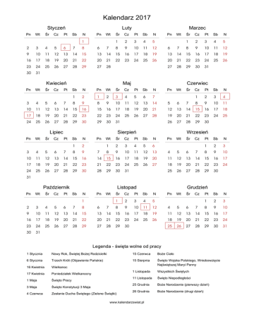 Kalendarz 2017 Styczeń Pn 2 9 16 23 30 Wt Śr 3 10 17 24 31 4 11 18 25 Cz 5 12 19 26 Pt 6 13 20 27 Luty Sb N 7 14 21 28 1 8 15 22 29 Pn 6 13 20 27 Wt 7 14 21 28 Śr Cz Pt Sb N 1 8 15 22 2 9 16 23 3 10 17 24 4 11 18 25 5 12 19 26 Kwiecień Pn 3 10 17 24 Wt Śr 4 11 18 25 5 12 19 26 Cz 6 13 20 27 3 10 17 24 31 Wt Śr 4 11 18 25 5 12 19 26 Cz 6 13 20 27 2 9 16 23 30 Wt 3 10 17 24 31 Śr 4 11 18 25 Cz 5 12 19 26 6 13 20 27 Wt Śr Cz Pt Sb N 7 14 21 28 1 8 15 22 29 2 9 16 23 30 3 10 17 24 31 4 11 18 25 5 12 19 26 Czerwiec Pt Sb N Pn Wt Śr Cz Pt Sb N 7 14 21 28 1 8 15 22 29 2 9 16 23 30 1 8 15 22 29 2 9 16 23 30 3 10 17 24 31 4 11 18 25 5 12 19 26 6 13 20 27 7 14 21 28 Pn 5 12 19 26 Wt 6 13 20 27 Sierpień Pt Sb N 7 14 21 28 1 8 15 22 29 2 9 16 23 30 Pt Wt Śr Cz Pt Sb N 7 14 21 28 1 8 15 22 29 2 9 16 23 30 3 10 17 24 31 4 11 18 25 5 12 19 26 6 13 20 27 6 13 20 27 Pn 4 11 18 25 Wt 5 12 19 26 Listopad Sb N 7 14 21 28 1 8 15 22 29 Pn 6 13 20 27 Śr Cz Pt Sb N 7 14 21 28 1 8 15 22 29 2 9 16 23 30 3 10 17 24 4 11 18 25 Wrzesień Pn Październik Pn Pn Maj Lipiec Pn Marzec Śr 6 13 20 27 Cz Pt Sb N 7 14 21 28 1 8 15 22 29 2 9 16 23 30 3 10 17 24 Grudzień Wt Śr Cz Pt Sb N 7 14 21 28 1 8 15 22 29 2 9 16 23 30 3 10 17 24 4 11 18 25 5 12 19 26 Pn 4 11 18 25 Wt 5 12 19 26 Śr 6 13 20 27 Cz Pt Sb N 7 14 21 28 1 8 15 22 29 2 9 16 23 30 3 10 17 24 31 Legenda - święta wolne od pracy 1 Stycznia Nowy Rok, Świętej Bożej Rodzicielki 15 Czerwca Boże Ciało 6 Stycznia Trzech Króli (Objawienie Pańskie) 15 Sierpnia 16 Kwietnia Wielkanoc Święto Wojska Polskiego, Wniebowzięcie Najświętszej Maryi Panny 17 Kwietnia Poniedziałek Wielkanocny 1 Listopada Wszystkich Świętych 1 Maja Święto Pracy 11 Listopada Święto Niepodległości 3 Maja Święto Konstytucji 3 Maja 25 Grudnia Boże Narodzenie (pierwszy dzień) 4 Czerwca Zesłanie Ducha Świętego (Zielone Świątki) 26 Grudnia Boże Narodzenie (drugi dzień) www.kalendarzswiat.pl