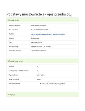 Podstawy mostownictwa - opis przedmiotu Informacje ogólne Nazwa przedmiotu Podstawy mostownictwa Kod przedmiotu 06.4-WI-BUDP-Podstmost-S16 Wydział Wydział Budownictwa, Architektury i Inżynierii Środowiska Kierunek Budownictwo Profil ogólnoakademicki Rodzaj studiów pierwszego stopnia z tyt. inżyniera Semestr rozpoczęcia semestr zimowy 2016/2017 Informacje o przedmiocie Semestr 5 Liczba punktów ECTS do zdobycia 3 Typ przedmiotu obowiązkowy Język nauczania polski Sylabus opracował Formy zajęć dr hab. inż. Adam Wysokowski, prof. UZ Forma Liczba godzin w Liczba godzin w Liczba godzin w Liczba godzin w Forma zajęć semestrze tygodniu semestrze tygodniu zaliczenia (stacjonarne) (stacjonarne) (niestacjonarne) (niestacjonarne) 30 2 18 1,2 Wykład Zaliczenie na ocenę Projekt 15 1 9 ,6 Zaliczenie na ocenę Cel przedmiotu Celem przedmiotu jest wprowadzenie studentów w zagadnienie konstrukcji mostowych. Wymagania wstępne Podstawy mechaniki i wytrzymałości materiałów, materiałoznawstwo budowlane, podstawy konstrukcji betonowych i stalowych, podstawy geotechniki i fundamentowania, geodezja inżynierska, podstawy informatyki. Zakres tematyczny Wykład Cele i warunki budowy mostów. Konstrukcje mostowe, a budownictwo ogólne. Historia budowy mostów. Klasyfikacja mostów. Elementy budowli mostowych. Dane opisujące mosty. Obciążenia działające na mosty. Fundamenty podpór. Podpory skrajne (przyczółki). Podpory pośrednie. Konstrukcja niosąca przęseł. Mosty drewniane. Mosty stalowe. Mosty betonowe i ceglane. Pomost. Łożyska. Urządzenia dylatacyjne. Hydroizolacja. Nawierzchnia na mostach. Elementy systemu odwodnienia. Elementy bezpieczeństwa ruchu. Przepusty tradycyjne i nowoczesne. Skrajnia – przepustowość. Obliczenia światła mostów i przepustów. Etapy projektowania mostów. Estetyka obiektów mostowych. Ewidencjonowanie i ocena stanu technicznego obiektów mostowych Utrzymanie mostów. Projekt Zajęcia projektowe obejmują: wykonanie projektu prostej konstrukcji mostowej Metody kształcenia Efekty kształcenia i metody weryfikacji osiągania efektów kształcenia Opis efektu Symbole Metody weryfikacji Forma zajęć efektów Student ma podstawową wiedzę w zakresie prostych K_W02 komunikacyjnych obiektów inżynierskich takich jak K_W07 kolokwium Wykład kolokwium Wykład mosty, wiadukty, estakady, przepusty i tunele (K_W02). Ma wiedzę o trendach rozwojowych w zakresie mostownictwa (K_W07). Student potrafi pozyskiwać informacje z literatury K_U01 (K_U01). Potrafi zaprojektować proste obiekty K_U02 inżynierskie i potrafi zaplanować organizację budowy i K_U03 przeprowadzić nadzór nad robotami budowlanymi K_U04 związanymi z budową, eksploatacją i utrzymaniem infrastruktury mostowej (K_U02, K_U03, K_U04). Opis efektu Symbole Metody weryfikacji Forma zajęć efektów Student ma świadomość skutków i odpowiedzialności K_K02 kolokwium Wykład za podjęte decyzje projektowe i technologiczne w zakresie podstaw konstrukcji mostowych (K_K02). Warunki zaliczenia Wykład: Warunkiem zaliczenia jest regularne uczęszczanie na wykłady oraz uzyskanie pozytywnej oceny z kolokwium zaliczeniowego. Projekt Warunkiem zaliczenia jest wykonanie projektu prostej konstrukcji mostowej, w tym regularne konsultacje wykonywanego projektu podczas semestru. Obciążenie pracą Obciążenie pracą Studia Studia niestacjonarne stacjonarne (w godz.) (w godz.) Godziny kontaktowe (udział w zajęciach; konsultacjach; egzaminie, itp.) 60 60 Samodzielna praca studenta (przygotowanie do: zajęć, kolokwium, 30 30 90 90 egzaminu; studiowanie literatury przygotowanie: pracy pisemnej, projektu, prezentacji, raportu, wystąpienia; itp.) Łącznie Punkty ECTS Studiastacjonarne Studia niestacjonarne Zajęcia z udziałem nauczyciela akademickiego 3 3 Zajęcia bez udziału nauczyciela akademickiego 0 0 Łącznie 3 3 Literatura podstawowa Literatura podstawowa: 1. Furtak K., Śliwiński J., Materiały budowlane w mostownictwie. WKiŁ 2004 2. Madaj A., Wołowicki W., Budowa i utrzymanie mostów. WKiŁ 1995, 2001 3. Karlikowski J., Madaj A.., Wołowicki W., Mostowe konstrukcje zespolone stalowobetonowe. WKiŁ 4. Madaj A., Wołowicki W., Mosty betonowe. Wymiarowanie i konstruowanie. WKiŁ, 1998, 2002 5. Madaj A., Wołowicki W., Podstawy projektowania budowli mostowych. WKiŁ, 2003 6. Furtak K., Mosty zespolone. PWN, 1999 7. Czudek H., Radomski W., Podstawy mostownictwa. PWN, Warszawa 1981 8. Cholewo J., Sznurowski M., Mosty kolejowe. WKiŁ, Warszawa 1970 9. Szczygieł J., Mosty z betonu zbrojonego i sprężonego. WKiŁ, Warszawa 1972 10. Machelski Cz., Obliczanie mostów z betonowych belek prefabrykowanych. DWE, Wrocław 2006 11. Furtak K., Wrana B., Mosty zintegrowane. WKiŁ, Warszawa 2005 Literatura uzupełniająca 1. Bliszczuk J. i inni., Projektowanie stalowych kładek dla pieszych. Dolnośląskie Wydawnictwo Edukacyjne, Wrocław 2004 2. Edel. R., Odwodnienie dróg. WKiŁ 2004 3. Czudek H., Wysokowski A., Trwałość mostów drogowych. Wyd. WKiŁ Warszawa 2005 4. Ryżyński A., Badania konstrukcji mostowych. WKiŁ, 1983 5. Zobel H., Alkhafaji T., Mosty drewniane. WKiŁ, Warszawa 2006 6. Jarominiak A., Mosty podwieszone. OWPR, Rzeszów 2002 7. Praca zbiorowa., Mosty składane projektowanie budowa i eksploatacja. GDDKiA, Warszawa 2005 8. Biliszczuk J., Mosty podwieszone projektowanie i realizacja. Arkady, Warszawa 2005 Uwagi Zmodyfikowane przez dr hab. inż. Adam Wysokowski, prof. UZ (ostatnia modyfikacja: 12-08-2016 14:58)