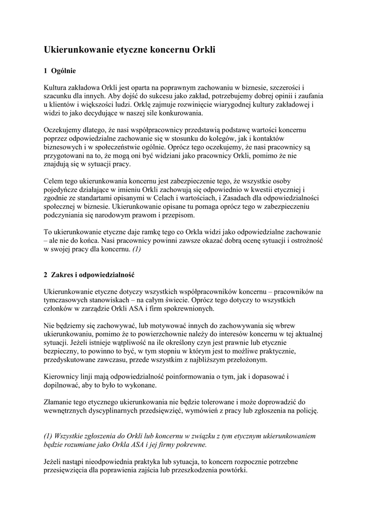 Ukierunkowanie etyczne koncernu Orkli 1 Ogólnie Kultura zakładowa Orkli jest oparta na poprawnym zachowaniu w biznesie, szczerości i szacunku dla innych. Aby dojść do sukcesu jako zakład, potrzebujemy dobrej opinii i zaufania u klientów i większości ludzi. Orklę zajmuje rozwinięcie wiarygodnej kultury zakładowej i widzi to jako decydujące w naszej sile konkurowania. Oczekujemy dlatego, że nasi współpracownicy przedstawią podstawę wartości koncernu poprzez odpowiedzialne zachowanie się w stosunku do kolegów, jak i kontaktów biznesowych i w społeczeństwie ogólnie. Oprócz tego oczekujemy, że nasi pracownicy są przygotowani na to, że mogą oni być widziani jako pracownicy Orkli, pomimo że nie znajdują się w sytuacji pracy. Celem tego ukierunkowania koncernu jest zabezpieczenie tego, że wszystkie osoby pojedyńcze działające w imieniu Orkli zachowują się odpowiednio w kwestii etyczniej i zgodnie ze standartami opisanymi w Celach i wartościach, i Zasadach dla odpowiedzialności społecznej w biznesie. Ukierunkowanie opisane tu pomaga oprócz tego w zabezpieczeniu podczyniania się narodowym prawom i przepisom. To ukierunkowanie etyczne daje ramkę tego co Orkla widzi jako odpowiedzialne zachowanie – ale nie do końca. Nasi pracownicy powinni zawsze okazać dobrą ocenę sytuacji i ostrożność w swojej pracy dla koncernu. (1) 2 Zakres i odpowiedzialność Ukierunkowanie etyczne dotyczy wszystkich współpracowników koncernu – pracowników na tymczasowych stanowiskach – na całym świecie. Oprócz tego dotyczy to wszystkich członków w zarządzie Orkli ASA i firm spokrewnionych. Nie będziemy się zachowywać, lub motywować innych do zachowywania się wbrew ukierunkowaniu, pomimo że to powierzchownie należy do interesów koncernu w tej aktualnej sytuacji. Jeżeli istnieje wątpliwość na ile określony czyn jest prawnie lub etycznie bezpieczny, to powinno to być, w tym stopniu w którym jest to możliwe praktycznie, przedyskutowane zawczasu, przede wszystkim z najbliższym przełożonym. Kierownicy linji mają odpowiedzialność poinformowania o tym, jak i dopasować i dopilnować, aby to było to wykonane. Złamanie tego etycznego ukierunkowania nie będzie tolerowane i może doprowadzić do wewnętrznych dyscyplinarnych przedsięwzięć, wymówień z pracy lub zgłoszenia na policję. (1) Wszystkie zgłoszenia do Orkli lub koncernu w związku z tym etycznym ukierunkowaniem będzie rozumiane jako Orkla ASA i jej firmy pokrewne. Jeżeli nastąpi nieodpowiednia praktyka lub sytuacja, to koncern rozpocznie potrzebne przesięwzięcia dla poprawienia zajścia lub przeszkodzenia powtórki. 3 Zachowanie bazowane na wzajemnym szacunku Pracownicy i członkowie zarządu Orkli będą w stosunku do swoich kontaków w biznesie, kolegów i innych zachowywać się bez zarzutów. Oznacza to, że będą zachowywać się biorąc pod uwagę i z szacunkiem w stosunku do obcych kultur i klientów zagranicznych, jak i równocześnie to, że będą podkreślać i przenosić ogólne standarty dotyczące Orkli. Orkla nie akceptuje żadnej formy szykany, dyskryminacji lub inne zachowanie, które koledzy czy inne kontakty w biznesie mogą zrozumieć jako grozbę lub poniżenie. 4 Konflikt interesów i integracji • Pracownicy i członkowie zarządu nie będą próbowali przywłaszczenia sobie (lub swoim bliskim) korzyści nieprzysługujących im lub mogących zaszkodzić interesom Orkli, pomimo że nie ma tutaj mowy o czynach karalnych. Informacja pomimo tej ogólnej informacji w branży, jaką otrzymali i pracownicy i członkowie zarządu w pracy dla Orkli, powinna być rozpatrywana konfidencjalnie. • Nie dozwolonym jest uczestniczenie lub próba oddziałowywania na decyzje, jeżeli może to doprowadzić do konfliktów w interesach, lub jeżeli może to być zrozumiałe jako konflikt interesów. Przykładem takiego konfliktu interesów może być to, że osoba ta ma interesy osobiste - ekonomiczne lub inne – i sprawę albo bezpośrednio albo poprzez najbliższą rodzinę. • Wszyscy ci którzy będą wiedzieli, że zaistniał potencjalny i nie do zaakceptowania konflikt interesów, powinni o tym od razu zameldować do najbliższego przełożonego. (2) Czasami jest trudno zauważyć czy faktycznie zaistniał konflikt interesów. Przy najmniejszej wątpliwości powinno skontaktować się z najbliższym przełożonym. • Unikać działalności, która może być zrozumiała jako korzystna dla konkurentów lub dostawców (lub innych interesantów) na koszt interesów Orkli. Jedna z tych działalności to na przykład przyjmowanie funkcji z zarządach w innych firmach. W przypadkach wątpliwości powinni pracownicy lub członkowie zarządu poradzić się z najbliższym przełożonym (2) Pracownicy i członkowie zarządu nie mają możliwości przeprowadzania marketingu produktów lub usług odnoszących się bezpośrednio do układów konkurencji działalności Orkli lub interesów. • Prezenty lub inne dobra podarowane przez kontakty w biznesie, powinny być odnośnie do tego co liczone jest jako dobre zachowanie w bizniesie lokalnie. Prezenty i inne dobra powinny być skromnej wartości i zasięgu, i powinny być dawane wtedy, gdy miejsce i czas jest odpowiednie. 2) Członkowie zarządu powinni radzić się przewodniczącego zarządu • Pracownicy i członkowie zarządu Orkli nie powinni przyjmować pieniędzy lub innych dóbr od swoich kontaktów w biznesie, jeżeli może to oddziałać lub sprawiać wrażenie, że może to oddziałać na ich integralność i niezależność. Prezenty i inne dobra powinny być otrzymywane tylko, jeżeli są skromnej wartości i zakresu, pod warunkiem, że czas i miejsce jest odpowiednie. • Zebrania z klientami zawsze powinny mieć cel biznesowy. Mają być skromne w wartości i dopasowane w swoim zakresie. Te same zasady dotyczą uczestnictwa w odnośnych zgromadzeniach u innych. • Jeżeli pracownikowi lub członkowi zarz