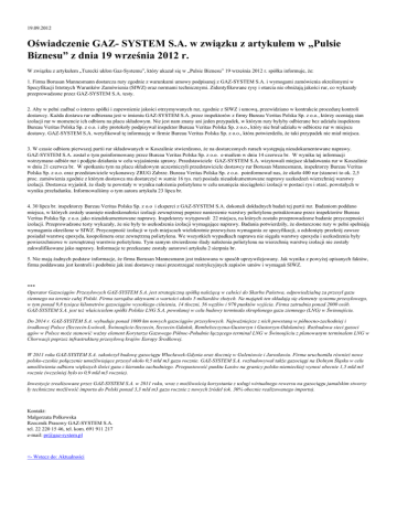 19.09.2012 Oświadczenie GAZ- SYSTEM S.A. w związku z artykułem w „Pulsie Biznesu” z dnia 19 września 2012 r. W związku z artykułem „Turecki ukłon Gaz-Systemu”, który ukazał się w „Pulsie Biznesu” 19 września 2012 r. spółka informuje, że: 1. Firma Borusan Mannesmann dostarcza rury zgodnie z warunkami umowy podpisanej z GAZ-SYSTEM S.A. i wymogami zamówienia określonymi w Specyfikacji Istotnych Warunków Zamówienia (SIWZ) oraz normami technicznymi. Zidentyfikowane rysy i otarcia nie obniżają jakości rur, co wykazały przeprowadzone przez GAZ-SYSTEM S.A. testy. 2. Aby w pełni zadbać o interes spółki i zapewnienie jakości otrzymywanych rur, zgodnie z SIWZ i umową, przewidziano w kontrakcie procedurę kontroli dostawcy. Każda dostawa rur odbierana jest w imieniu GAZ-SYSTEM S.A. przez inspektorów z firmy Bureau Veritas Polska Sp. z o.o., którzy oceniają stan izolacji rur w momencie ich odbioru na placu składowym. Nie jest nam znany ani jeden przypadek, w którym rury byłyby odbierane bez udziału inspektora Bureau Veritas Polska Sp. z o.o. i aby protokoły podpisywał inspektor Bureau Veritas Polska Sp. z o.o., który nie brał udziału w odbiorze rur w miejscu dostawy. GAZ-SYSTEM S.A. weryfikował tę informację w firmie Bureau Veritas Polska Sp. z o.o., która potwierdziła, że taki przypadek nie miał miejsca. 3. W czasie odbioru pierwszej partii rur składowanych w Koszalinie stwierdzono, że na dostarczonych rurach występują nieudokumentowane naprawy. GAZ-SYSTEM S.A. został o tym poinformowany przez Bureau Veritas Polska Sp. z o.o. e-mailem w dniu 14 czerwca br. W wyniku tej informacji wstrzymano odbiór rur i podjęto działania w celu wyjaśnienia sprawy. Przedstawiciele GAZ-SYSTEM S.A. wizytowali miejsce składowania rur w Koszalinie w dniu 21 czerwca br. W spotkaniu tym na placu składowym uczestniczyli przedstawiciele dostawcy rur Borusan Mannesmann, inspektorzy Bureau Veritas Polska Sp. z o.o. oraz przedstawiciele wykonawcy ZRUG Zabrze. Bureau Veritas Polska Sp. z o.o. poinformował nas, że około 400 rur (stanowi to ok. 2,5 proc. zamówienia zgodnie z którym dostawca ma dostarczyć w sumie 16 tys. rur) posiada nieudokumentowane naprawy uszkodzeń wierzchniej warstwy izolacji. Dostawca wyjaśnił, że ślady te powstały w wyniku nałożenia polietylenu w celu usunięcia nieciągłości izolacji w postaci rys i otarć, powstałych w wyniku przeładunku. Informowaliśmy o tym autora artykułu 23 lipca br. 4. 30 lipca br. inspektorzy Bureau Veritas Polska Sp. z o.o i eksperci z GAZ-SYSTEM S.A. dokonali dokładnych badań tej partii rur. Badaniom poddano miejsca, w których zostały usunięte niedoskonałości izolacji zewnętrznej poprzez naniesienie warstwy polietylenu potraktowane przez inspektorów Bureau Veritas Polska Sp. z o.o. jako nieudokumentowane naprawy. Inspektorzy wytypowali 22 miejsca, na których zostało przeprowadzone badanie przyczepności izolacji. Przeprowadzone testy wykazały, że nie były to uszkodzenia izolacji wymagające naprawy. Badania potwierdziły, że dostarczone rury w pełni spełniają wymagania określone w SIWZ. Przyczepność izolacji w tych miejscach wielokrotnie przewyższa wymagania ze specyfikacji, a odsłonięty przekrój zawsze posiadał warstwę epoxydu, koopolimeru oraz zewnętrzną polietylenu. We wszystkich wypadkach naprawa nie sięgała warstwy epoxydu i uszkodzenia były powierzchniowe w zewnętrznej warstwie polietylenu. Tym samym stwierdzone ślady nałożenia polietylenu na wierzchnią warstwę izolacji nie zostały zakwalifikowane jako naprawy. Informacje te przekazane zostały autorowi artykułu 2 sierpnia br. 5. Nie mają żadnych podstaw informacje, że firma Borusan Mannesmann jest traktowana w sposób uprzywilejowany. Jak wynika z powyżej opisanych faktów, firma poddawana jest kontroli i podobnie jak inni dostawcy musi przestrzegać restrykcyjnych zapisów umów i wymagań SIWZ. *** Operator Gazociągów Przesyłowych GAZ-SYSTEM S.A. jest strategiczną spółką należącą w całości do Skarbu Państwa, odpowiedzialną za przesył gazu ziemnego na terenie całej Polski. Firma zarządza aktywami o wartości około 5 miliardów złotych. Na majątek ten składają się elementy systemu przesyłowego, w tym ponad 9,8 tysiąca kilometrów gazociągów wysokiego ciśnienia, 14 tłoczni, 56 węzłów i 970 punktów wyjścia. Firma zatrudnia ponad 2000 osób. GAZ-SYSTEM S.A. jest też właścicielem spółki Polskie LNG S.A. powołanej w celu budowy terminalu skroplonego gazu ziemnego (LNG) w Świnoujściu. Do 2014 r. GAZ-SYSTEM S.A. wybuduje ponad 1000 km nowych gazociągów przesyłowych. Najważniejsze z nich powstaną w północno-zachodniej i środkowej Polsce (Szczecin-Lwówek, Świnoujście-Szczecin, Szczecin-Gdańsk, Rembelszczyzna-Gustorzyn i Gustorzyn-Odolanów). Rozbudowa sieci gazoci ągów w Polsce może stanowić ważny element Korytarza Gazowego Północ-Południe łączącego terminal LNG w Świnoujściu z planowanym terminalem LNG w Chorwacji poprzez infrastrukturę przesyłową krajów Europy Środkowej. W 2011 roku GAZ-SYSTEM S.A. zakończył budowę gazociągu Włocławek-Gdynia oraz tłocznię w Goleniowie i Jarosławiu. Firma uruchomiła również nowe polsko-czeskie połączenie umożliwiające przesył około 0,5 mld m3 gazu rocznie. GAZ-SYSTEM S.A. rozbudowywał także gazociągi na Dolnym Śląsku w celu umożliwienia odbioru większych ilości gazu z kierunku zachodniego. Przepustowość punktu Lasów na granicy polsko-niemieckiej wynosi obecnie 1,5 mld m3 rocznie (wcześniej było to 0,9 mld m3 rocznie). Inwestycje zrealizowane przez GAZ-SYSTEM S.A. w 2011 roku, wraz z możliwością korzystania z usługi wirtualnego rewersu na gazociągu jamalskim stworzy ły techniczne możliwość importu do Polski ponad 3,3 mld m3 gazu rocznie z nowych źródeł (ok. 30% obecnie realizowanego importu). Kontakt: Małgorzata Polkowska Rzecznik Prasowy GAZ-SYSTEM S.A.
