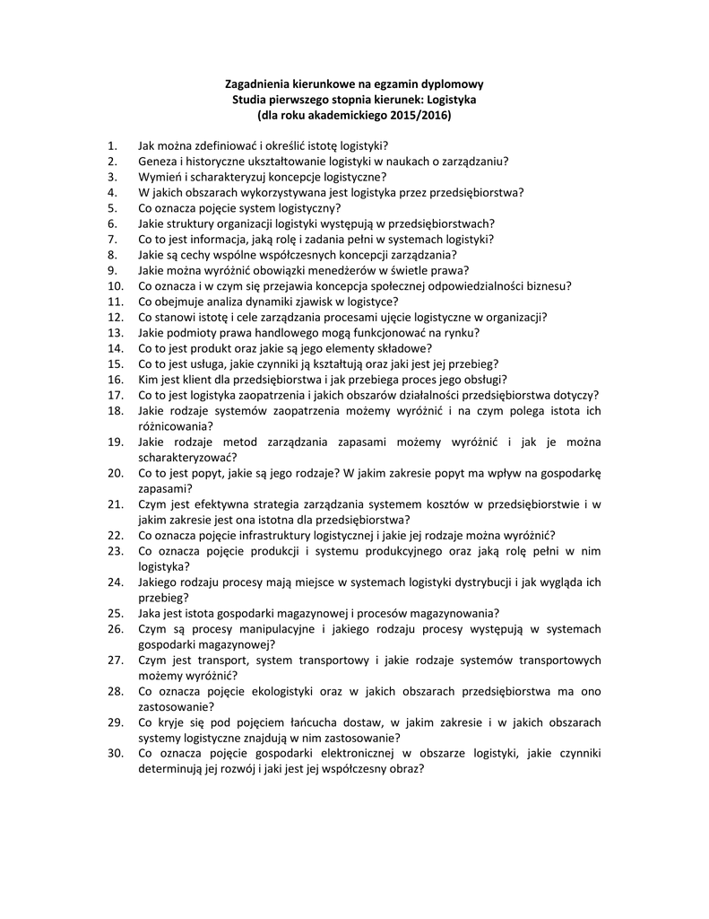 Zagadnienia kierunkowe na egzamin dyplomowy Studia pierwszego stopnia kierunek: Logistyka (dla roku akademickiego 2015/2016) 1. 2. 3. 4. 5. 6. 7. 8. 9. 10. 11. 12. 13. 14. 15. 16. 17. 18. 19. 20. 21. 22. 23. 24. 25. 26. 27. 28. 29. 30. Jak można zdefiniować i określić istotę logistyki? Geneza i historyczne ukształtowanie logistyki w naukach o zarządzaniu? Wymień i scharakteryzuj koncepcje logistyczne? W jakich obszarach wykorzystywana jest logistyka przez przedsiębiorstwa? Co oznacza pojęcie system logistyczny? Jakie struktury organizacji logistyki występują w przedsiębiorstwach? Co to jest informacja, jaką rolę i zadania pełni w systemach logistyki? Jakie są cechy wspólne współczesnych koncepcji zarządzania? Jakie można wyróżnić obowiązki menedżerów w świetle prawa? Co oznacza i w czym się przejawia koncepcja społecznej odpowiedzialności biznesu? Co obejmuje analiza dynamiki zjawisk w logistyce? Co stanowi istotę i cele zarządzania procesami ujęcie logistyczne w organizacji? Jakie podmioty prawa handlowego mogą funkcjonować na rynku? Co to jest produkt oraz jakie są jego elementy składowe? Co to jest usługa, jakie czynniki ją kształtują oraz jaki jest jej przebieg? Kim jest klient dla przedsiębiorstwa i jak przebiega proces jego obsługi? Co to jest logistyka zaopatrzenia i jakich obszarów działalności przedsiębiorstwa dotyczy? Jakie rodzaje systemów zaopatrzenia możemy wyróżnić i na czym polega istota ich różnicowania? Jakie rodzaje metod zarządzania zapasami możemy wyróżnić i jak je można scharakteryzować? Co to jest popyt, jakie są jego rodzaje? W jakim zakresie popyt ma wpływ na gospodarkę zapasami? Czym jest efektywna strategia zarządzania systemem kosztów w przedsiębiorstwie i w jakim zakresie jest ona istotna dla przedsiębiorstwa? Co oznacza pojęcie infrastruktury logistycznej i jakie jej rodzaje można wyróżnić? Co oznacza pojęcie produkcji i systemu produkcyjnego oraz jaką rolę pełni w nim logistyka? Jakiego rodzaju procesy mają miejsce w systemach logistyki dystrybucji i jak wygląda ich przebieg? Jaka jest istota gospodarki magazynowej i procesów magazynowania? Czym są procesy manipulacyjne i jakiego rodzaju procesy występują w systemach gospodarki magazynowej? Czym jest transport, system transportowy i jakie rodzaje systemów transportowych możemy wyróżnić? Co oznacza pojęcie ekologistyki oraz w jakich obszarach przedsiębiorstwa ma ono zastosowanie? Co kryje się pod pojęciem łańcucha dostaw, w jakim zakresie i w jakich obszarach systemy logistyczne znajdują w nim zastosowanie? Co oznacza pojęcie gospodarki elektronicznej w obszarze logistyki, jakie czynniki determinują jej rozwój i jaki jest jej współczesny obraz? Bibliografia • J., Bardi E. J., Langley C. J. Jr, Zarządzanie logistyczne, PWE, Warszawa 2010. • Blaik P., Logistyka, Koncepcja zintegrowanego zarządzania, PWE, 2014. • Szymonik A., Zarządzanie zapasami i łańcuchem dostaw, Difin, 2013. Zagadnienia specjalnościowe Specjalność: Logistyka handlu i dystrybucji 1. Czym zajmuje się logistyka dystrybucji i gdzie odnajdujemy jej przejawy? 2. Co to jest kanał dystrybucyjny, jak jest jego struktura? Jakie strategie dystrybucji mogą być realizowane przez przedsiębiorstwa? 3. Jakie innowacyjne technologie wykorzystywane są w procesach logistyki dystrybucji? 4. Jakiego rodzaju kryteria uwzględniane są w ocenie procesu obsługi klienta? 5. Jakie rodzaje zapasów występują w przedsiębiorstwie i względem jakich kryteriów możemy je klasyfikować? 6. W jakim zakresie infrastruktura wpływa na kształt i przebieg procesów logistycznych w dystrybucji? 7. Jakie czynniki przyczyniają się do utrzymywania zapasów? 8. Jakie składowe współtworzą system magazynowy i jaka jest ich rola w realizacji procesów logistyki dystrybucji? 9. Co oznacza pojęcie centrum dystrybucyjnego i jakie wyróżniamy czynniki determinujące jego umiejscowienie? 10. Czym jest opakowanie w logistyce, jakie są jego rodzaje, jakie zadania i funkcje są mu przypisane? 11. Jakie współczesne technologie w dziedzinie informacji są wykorzystywane przez przedsiębiorstwa dystrybucyjne, w jakim zakresie i w jakich obszarach? 12. Czym jest kod kreskowy i jakie postacie kodów występują w systemach logistycznych? 13. Czym jest sieć logistyczna, jakie czynniki decydują o kształcie sieci, lokalizacji obiektów logistycznych oraz jakie metody modelowania wspomagają planowanie sieci logistycznej? 14. Jaką rolę pełni logistyka on-line w procesach dystrybucji? Bibliografia • • • • Rutkowski K., (red.) Logistyka dystrybucji. Specyfika. Tendencje rozwojowe. Dobre praktyki, Wydawnictwo SGH, Warszawa 2005 Krawczyk S., Zarządzanie procesami logistycznymi. PWT, Warszawa, 2001 Majewski J., Informatyka dla logistyki, Biblioteka Logistyka, Poznań 2006 Zarządzanie logistyczną obsługą klienta. Red. J. Długosz, Wyd. AE w poznaniu, Poznań 2005 Specjalność: Transport – Spedycja – Logistyka 1. 2. 3. 4. Jakie systemy obsługi klienta wdrażane są w przedsiębiorstwach? Jakiego rodzaju kryteria uwzględniane są w ocenie procesu obsługi klienta? Co kryje się pod pojęciem logistics mix? Jakie rodzaje zapasów występują w przedsiębiorstwie i względem jakich kryteriów możemy je klasyfikować? W jakim zakresie infrastruktura wpływa na kształt i przebieg procesów logistycznych? Jakie czynniki przyczyniają się do utrzymywania zapasów? Jakiego rodzaju gałęzie transportowe możemy wymienić i jaka jest ich charakterystyka? Jakie są skutki zastosowania systemów informatycznych w zarządzaniu logistycznym? Co oznacza pojęcie transportu intermodalnego, jakie czynniki stają się determinantami jego stosowania i w jakich obszarach? Jakiego rodzaju przewoźnicy występują w systemach transportowych, jaka jest ich rola, obowiązki i prawa? Co oznacza pojęcie spedycji i w jakim zakresie procesy spedycji wpływają na efekty