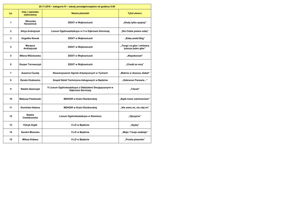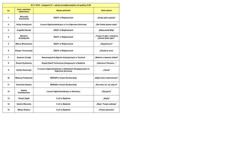 25.11.2016 – kategoria IV – szkoły ponadgimnazjalne od godziny 9:00 Lp. Imię i nazwisko wykonawcy Nazwa placówki Tytuł utworu 1 Weronika Harasimiuk ZSOiT w Wojkowicach „Kiedy tylko spojrzę” 2 Alicja Andrejczuk Liceum Ogólnoszktałcące nr 5 w Dąbrowie Górniczej „Dla Ciebie jestem sobą” 3 Angelika Nowak ZSOiT w Wojkowicach „Babę zesłał Bóg” 4 Marzena Andrzejczak ZSOiT w Wojkowicach „Tango na głos i orkiestrą jeszcze jeden głos” 5 Milena Wiśniewska ZSOiT w Wojkowicach „Niepokonani” 6 Kacper Tarnawczyk ZSOiT w Wojkowicach „Chodź ze mną” 7 Zuzanna Czudaj Stowarzyszenie Ognisk Artystycznych w Tychach „Moknie w deszczu diabeł” 8 Żaneta Oczkowicz Zespół Szkół Techniczno-Usługowych w Będzinie „Dobranoc Panowie...” 9 Natalia Szewczyk V Liceum Ogólnokształcące z Oddziałami Dwujęzycznymi w Dąbrowie Górniczej „Tatuaż” 10 Mateusz Pawłowski MOKSiR w Kuźni Raciborskiej „Bądź moim natchnieniem” 11 Dominika Halama MOKSiR w Kuźni Raciborskiej „Nie wierz mi, nie ufaj mi” 12 Natalia Cieślakowska Liceum Ogólnokształcące w Siewierzu „Ojczyzna” 13 Patryk Zojdź II LO w Będzinie „Szyby” 14 Sandra Miarecka II LO w Będzinie „Moja i Twoja nadzieja” 15 Miłosz Kidawa II LO w Będzinie „Prosta piosenka” 16 Sara Szymiec II LO w Będzinie „Boję się” 17 Kamil Hofman II LO w Będzinie „Zdumienie” 18 Iga Pokorny II LO w Będzinie „Nie jestem jedyna” 19 Martyna Jastrzębska II LO w Będzinie „Krakowski spleen” 20 Julia Soska III Liceum Ogólnokształcące w Dąbrowie Górniczej „Czas nas uczy pogody” 21 Natalia Zygała III Liceum Ogólnokształcące w Dąbrowie Górniczej „Biały krzyż” 22 Marta Szczepanek Młodzieżowy Dom Kultury w Katowicach „Rękawiczki” 23 Wiktoria Kuźnia Młodzieżowy Dom Kultury w Katowicach „Moknie w deszczu diabeł” 24 Zuzanna Ciopalska Młodzieżowy Ośrodek Pracy Twórczej w Dąbrowie Górniczej „Czy nastanie znów świt” 25 Wiktoria Rozmus Młodzieżowy Ośrodek Pracy Twórczej w Dąbrowie Górniczej „Tamta dziewczyna” 26 Natalia Łubek Młodzieżowy Ośrodek Pracy Twórczej w Dąbrowie Górniczej „Człowieczy Los” 27 Anna Szywacz Młodzieżowy Dom Kultury w Katowicach „List do matki” 28 Anna Bronikowska Ośrodek Kultury w Będzinie „Rękawiczki” 29 Zuzanna Tulej Ośrodek Kultury w Będzinie „Żurawie origami” 30 Martyna Pleban Śląskie Stowarzyszenie Edukacji Artystycznej w Zawierciu „Tańczące Eurydyki” 31 Sandra Duś V Liceum Ogólnokształcące z Oddziałami Dwujęzycznymi w Dąbrowie Górniczej „Był sobie król” 32 Klaudia Wójcik Prywatne LO w Dąbrowie Górniczej „Testosteron” 33 Daria Kriger PMDK w Będzinie „Pergamin” 34 Daria Pichali MOKSiR w Kuźni Raciborskiej „Brzydcy” 35 Natalia Tul MDK w Raciborzu „Dziwny jest ten świat” 36 Natalia Skręt V Liceum Ogólnokształcące z Oddziałami Dwujęzycznymi w Dąbrowie Górniczej