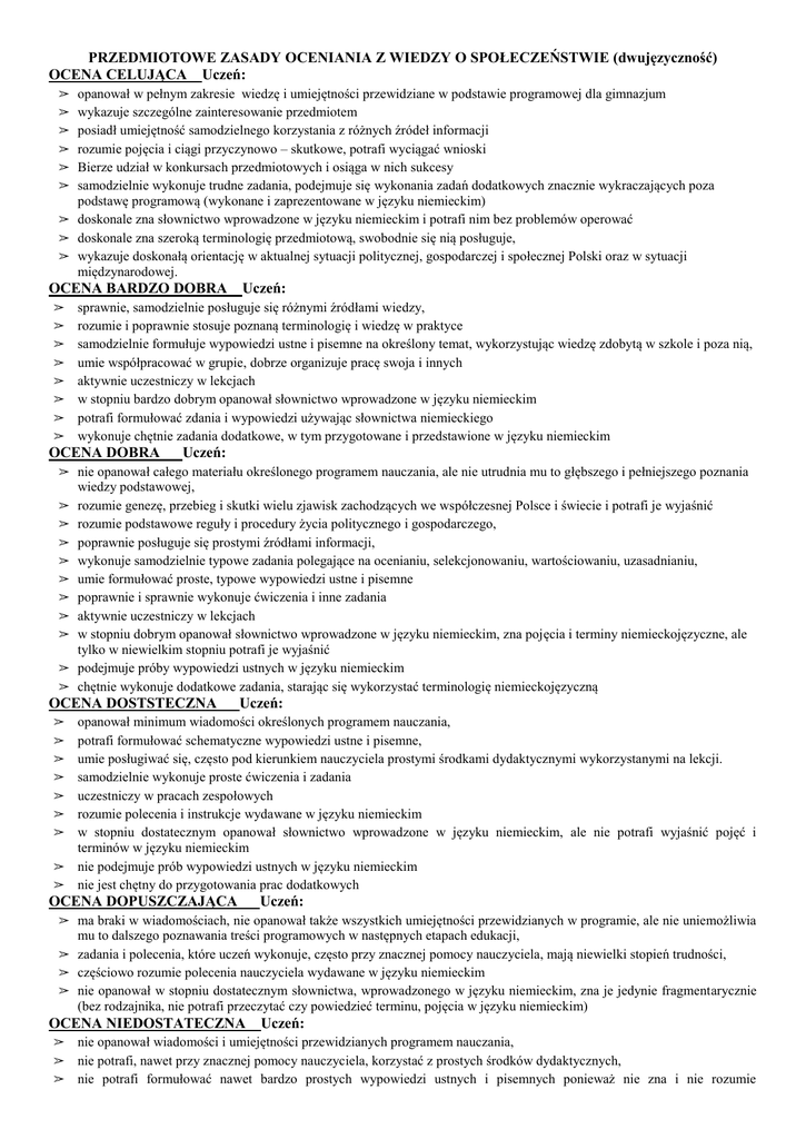 PRZEDMIOTOWE ZASADY OCENIANIA Z WIEDZY O SPOŁECZEŃSTWIE (dwujęzyczność) OCENA CELUJĄCA Uczeń: ➢ opanował w pełnym zakresie wiedzę i umiejętności przewidziane w podstawie programowej dla gimnazjum ➢ wykazuje szczególne zainteresowanie przedmiotem ➢ posiadł umiejętność samodzielnego korzystania z różnych źródeł informacji ➢ rozumie pojęcia i ciągi przyczynowo – skutkowe, potrafi wyciągać wnioski ➢ Bierze udział w konkursach przedmiotowych i osiąga w nich sukcesy ➢ samodzielnie wykonuje trudne zadania, podejmuje się wykonania zadań dodatkowych znacznie wykraczających poza podstawę programową (wykonane i zaprezentowane w języku niemieckim) ➢ doskonale zna słownictwo wprowadzone w języku niemieckim i potrafi nim bez problemów operować ➢ doskonale zna szeroką terminologię przedmiotową, swobodnie się nią posługuje, ➢ wykazuje doskonałą orientację w aktualnej sytuacji politycznej, gospodarczej i społecznej Polski oraz w sytuacji międzynarodowej. OCENA BARDZO DOBRA ➢ ➢ ➢ ➢ ➢ ➢ ➢ ➢ Uczeń: sprawnie, samodzielnie posługuje się różnymi źródłami wiedzy, rozumie i poprawnie stosuje poznaną terminologię i wiedzę w praktyce samodzielnie formułuje wypowiedzi ustne i pisemne na określony temat, wykorzystując wiedzę zdobytą w szkole i poza nią, umie współpracować w grupie, dobrze organizuje pracę swoja i innych aktywnie uczestniczy w lekcjach w stopniu bardzo dobrym opanował słownictwo wprowadzone w języku niemieckim potrafi formułować zdania i wypowiedzi używając słownictwa niemieckiego wykonuje chętnie zadania dodatkowe, w tym przygotowane i przedstawione w języku niemieckim OCENA DOBRA Uczeń: ➢ nie opanował całego materiału określonego programem nauczania, ale nie utrudnia mu to głębszego i pełniejszego poznania ➢ ➢ ➢ ➢ ➢ ➢ ➢ ➢ ➢ ➢ wiedzy podstawowej, rozumie genezę, przebieg i skutki wielu zjawisk zachodzących we współczesnej Polsce i świecie i potrafi je wyjaśnić rozumie podstawowe reguły i procedury życia politycznego i gospodarczego, poprawnie posługuje się prostymi źródłami informacji, wykonuje samodzielnie typowe zadania polegające na ocenianiu, selekcjonowaniu, wartościowaniu, uzasadnianiu, umie formułować proste, typowe wypowiedzi ustne i pisemne poprawnie i sprawnie wykonuje ćwiczenia i inne zadania aktywnie uczestniczy w lekcjach w stopniu dobrym opanował słownictwo wprowadzone w języku niemieckim, zna pojęcia i terminy niemieckojęzyczne, ale tylko w niewielkim stopniu potrafi je wyjaśnić podejmuje próby wypowiedzi ustnych w języku niemieckim chętnie wykonuje dodatkowe zadania, starając się wykorzystać terminologię niemieckojęzyczną OCENA DOSTSTECZNA ➢ ➢ ➢ ➢ ➢ ➢ ➢ ➢ ➢ Uczeń: opanował minimum wiadomości określonych programem nauczania, potrafi formułować schematyczne wypowiedzi ustne i pisemne, umie posługiwać się, często pod kierunkiem nauczyciela prostymi środkami dydaktycznymi wykorzystanymi na lekcji. samodzielnie wykonuje proste ćwiczenia i zadania uczestniczy w pracach zespołowych rozumie polecenia i instrukcje wydawane w języku niemieckim w stopniu dostatecznym opanował słownictwo wprowadzone w języku niemieckim, ale nie potrafi wyjaśnić pojęć i terminów w języku niemieckim nie podejmuje prób wypowiedzi ustnych w języku niemieckim nie jest chętny do przygotowania prac dodatkowych OCENA DOPUSZCZAJĄCA Uczeń: ➢ ma braki w wiadomościach, nie opanował także wszystkich umiejętności przewidzianych w programie, ale nie uniemożliwia mu to dalszego poznawania treści programowych w następnych etapach edukacji, ➢ zadania i polecenia, które uczeń wykonuje, często przy znacznej pomocy nauczyciela, mają niewielki stopień trudności, ➢ częściowo rozumie polecenia nauczyciela wydawane w języku niemieckim ➢ nie opanował w stopniu dostatecznym słownictwa, wprowadzonego w języku niemieckim, zna je jedynie fragmentarycznie (bez rodzajnika, nie potrafi przeczytać czy powiedzieć terminu, pojęcia w języku niemieckim) OCENA NIEDOSTATECZNA ➢ Uczeń: nie opanował wiadomości i umiejętności przewidzianych programem nauczania, ➢ nie potrafi, nawet przy znacznej pomocy nauczyciela, korzystać z prostych środków dydaktycznych, ➢ nie potrafi formułować nawet bardzo prostych wypowiedzi ustnych i pisemnych ponieważ nie zna i nie rozumie ➢ podstawowej terminolog ii stosowanej na lekcjach, nie zna pojęć i terminów wprowadzonych na lekcjach w języku niemieckim Oceny cząstkowe uczeń może otrzymać za: Odpowiedź ustną Aktywność -ocenie podlega wkład ucznia w przebieg lekcji w formie: wypowiedzi ustnych, pracy w grupach, pracy samodzielnej (pisemna) na lekcji i w domu, Karty pracy Referaty/ projekty Pracę domową. Wszystkie prace domowe muszą być systematycznie wykonywane, a zaległości nadrabiane w ciągu tygodnia. Na lekcji może być sprawdzona każda, wcześniej zadana praca domowa. Kartkówkę – krótka pisemna praca niezapowiedziana (obejmująca maksymalnie trzy ostatnie lekcje, zakresem wiedzy i umiejętności). Pracę klasową (całogodzinna). Każdy uczeń musi pisać każdy sprawdzian. W razie usprawiedliwionej nieobecności uczeń musi napisać pracę klasową w terminie tygodnia od powrotu do szkoły. Uczniowie nieobecni w szkole (nieobecność usprawiedliwiona) mają obowiązek uzupełnienia i opanowania materiału Uczeń ma prawo w ciągu semestru raz zgłosić (przed rozpoczęciem zajęć) nieprzygotowanie do lekcji. Uczeń nie może zgłosić nieprzygotowania do lekcji, na którą została zapowiedziana jedna z form sprawdzania wiedzy np.: sprawdzian, kartkówka Na sprawdzianach w klasach dwujęzycznych znajdować się będą treści i słownictwo w języku niemieckim, z którymi klasa zapoznała się na lekcjach Ocena semestralna jest wystawiana na podstawie wszystkich ocen cząstkowych, obejmujących pracę ucznia w całym 