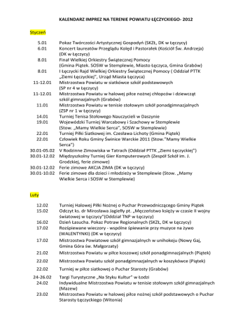 KALENDARZ IMPREZ NA TERENIE POWIATU ŁĘCZYCKIEGO- 2012 Styczeń 5.01 6.01 8.01 8.01 11-12.01 11-12.01 11.01 14.01 19.01 22.01 22.01 30.01-05.02 30.01-12.02 30.01-12.02 30.01-10.02 Pokaz Twórczości Artystycznej Gospodyń (SKZŁ, DK w Łęczycy) Koncert laureatów Przeglądu Kolęd i Pastorałek (Kościół Św. Andrzeja) (DK w Łęczycy) Finał Wielkiej Orkiestry Świątecznej Pomocy (Gmina Piątek. SOSW w Stemplewie, Miasto Łęczyca, Gmina Grabów) I Łęczycki Rajd Wielkiej Orkiestry Świątecznej Pomocy ( Oddział PTTK „Ziemi Łęczyckiej”, Urząd Miasta Łęczyca) Mistrzostwa Powiatu w siatkówce szkół podstawowych (SP nr 4 w Łęczycy) Mistrzostwa Powiatu w halowej piłce nożnej chłopców i dziewcząt szkól gimnazjalnych (Grabów) Mistrzostwa Powiatu w tenisie stołowym szkół ponadgimnazjalnych (ZSP nr 1 w Łęczycy) Turniej Tenisa Stołowego Nauczycieli w Daszynie Wojewódzki Turniej Warcabowy i Szachowy w Stemplewie (Stow. „Mamy Wielkie Serca”, SOSW w Stemplewie) Turniej Piłki Siatkowej im. Czesława Lichoty (Gmina Piątek) Człowiek Roku Gminy Świnice Warckie 2011 (Stow.”Mamy Wielkie Serca”) V Rodzinne Zimowiska w Tatrach (Oddział PTTK „Ziemi Łęczyckiej”) Międzyszkolny Turniej Gier Komputerowych (Zespół Szkół im. J. Grodzkiej, ferie zimowe) Ferie zimowe AKCJA ZIMA (DK w Łęczycy) Ferie zimowe dla dzieci i młodzieży w Stemplewie (Stow. „Mamy Wielkie Serca i SOSW w Stemplewie) Luty 12.02 15.02 21.02 Turniej Halowej Piłki Nożnej o Puchar Przewodniczącego Gminy Piątek Odczyt ks. dr Mirosława Jagiełły pt. „Męczeństwo księży w czasie II wojny światowej w Łęczycy”(Oddział TNP w Łęczycy) Dzień Łasucha. Pokaz Potraw Regionalnych (SKZŁ, DK w Łęczycy) Rozśpiewane wieczory - wspólne śpiewanie przy muzyce na żywo (WALENTYNKI) (DK w Łęczycy) Mistrzostwa Powiatowe szkół gimnazjalnych w unihokeju (Nowy Gaj, Gmina Góra św. Małgorzaty) Mistrzostwa Powiatu w piłce koszowej szkół ponadgimnazjalnych (Piątek) 22.02 Mistrzostwa Powiatu szkół ponadgimnazjalnych w koszykówce (Piątek) 22.02 Turniej w piłce siatkowej o Puchar Starosty (Grabów) 16.02 17.02 17.02 24-26.02 24.02 23.02 Targi Turystyczne „Na Styku Kultur” w Łodzi Indywidualne Mistrzostwa Powiatu w tenisie stołowym szkół gimnazjalnych (Mazew) Mistrzostwa Powiatu w halowej piłce nożnej szkół podstawowych o Puchar Starosty Łęczyckiego (Witonia) 29.02 .02 Mistrzostwa Powiatu w tenisie stołowym kategoria żak/młodzik (Mazew) Powiatowy Turniej tańca towarzyskiego (Topola Królewska) Marzec .03 .03 14.03 20.03 21.03 21.03 24.03 24.03 .03 .03 .03 .03 .03 22.03 .03 .03 Wielkanocne warsztaty rękodzieła ludowego (DK w Łęczycy) Ogólnopolski Konkurs Recytatorski (eliminacje powiatowe) (DK w Łęczycy) Spotkanie integracyjne „Dzień Kobiet dla zdrowia”(SKZŁ) Mistrzostwa Powiatu w piłce siatkowej szkół ponadgimnazjalnych (chłopcy –I LO, dziewczęta –ZS im. J. Grodzkiej) Mocno Hałaśliwe Wypędzanie Zimy (DK w Łęczycy) I Dzień Wiosny (ORLIK 2012 przy I LO w Łęczycy) II Przegląd Ruchu Artystycznego Seniora „Nutki Złotej Jesieni” (DK w Łęczycy) XI Rajd Powitanie Wiosny na Ziemi Łęczyckiej (Oddział PTTK „Ziemi Łęczyckiej”) Spotkanie z cyklu OSOBOWOŚCI (DK w Łęczycy) Dni Otwarte w I LO (LO im. Kazimierza Wielkiego) i Turniej Piłki Nożnej (ORLIK) IV Regionalny Konkurs Ortograficzny (ZPEW w Łęczycy) IV Międzyszkolna Olimpiada Biologiczno –Chemiczna (ZPEW w Łęczycy) Dni Otwarte w ZS im. J. Grodzkiej Targi Edukacyjne Międzyszkolny Turniej SUDOKU (ZS im. J. Grodzkiej) Prelekcja prof. dr. hab. Ryszarda Grygiela pt. „Historia wczesnośredniowiecznej Łęczycy w świetle ostatnich badań na grodzisku w Tumie”( Oddział TNP w Łęczycy) Kwiecień 1.04 1.04 .04 4-5.04 6.04 10.04 16.04 .04 .04 Wielkanocny Kiermasz Świąteczny (DK w Łęczycy) Mistrzostwa Powiatu szkół gimnazjalnych w piłce siatkowej (chłopcy-Piątek, dziewczęta-Topola Królewska) Festiwal Piosenki Zuchowej I Harcerskiej hufca ZHP Uniejów w Stemplewie o zasięgu powiatowym ( SOSW w Stemplewie) Mistrzostwa Powiatowe szkół podstawowych w koszykówce (SP nr 4 w Łęczycy) II Otwarty Przegląd Kabaretów „Chichot” (DK w Łęczycy) Święto Palanta (GOK Grabów) Mistrzostwa Powiatu w piłce nożnej szkół ponadgimnazjalnych (I LO w Łęczycy) Mistrzostwa Powiatu w halowej piłce nożnej chłopców szkół podstawowych (Grabów) Kiermasz Roślin Ogrodowych (Starostwo Powiatowe) 21.04 27-29.04 .04 .04 .04 .04 V Rajd Śladami Marii Konopnickiej (Oddział PTTK „Ziemi Łęczyckiej”) IV Otwarty Konkurs Taneczny „ Mój jest ten kawałek podłogi” (DK w Łęczycy) Międzynarodowy Dzień Tańca (DK w Łęczycy) Międzynarodowy Dzień Teatru (DK w Łęczycy) Powiatowy Turniej piłki nożnej „Ochotniczych Straży Pożarnych” (Orlik przy I LO) Sesja naukowa „Źródła archeologiczne, historyczne i kartograficzne do dziejów Łęczycy”.(TNP O/ Łęczyca, TMZŁ, Starostwo Powiatowe) Maj 3.05 3.05 4.05 7.05 8.05 17.05 17-20.05 18.05 19.05 10.05 20.05 .05 24-27.05 25.05 26.05 27.05 29.05 .05 .05 .05 20.05 30.05 30.05 30.05 31.05 .05 maj/ Obchody Święta Konstytucji (Urząd Miasta w Łęczycy) Święto Strażaka (Gmina Piątek, Gmina Grabów) IV Łęczyckie Mistrzostwa Ortografii (DK w Łęczycy) Powiatowy Dzień Osób Niepełnosprawnych Powiatowy Międzyszkolny Przegląd Piosenki „ Żaczek ” (DK w Łęczycy) Czwórbój lekkoatletyczny szkół podstawowych (Liga LA) Międzynarodowy Festiwal Jana Pawła II-Papieskie Urodziny w Środku Polski (Gmina Piątek) Rozśpiewane wieczory - wspólne śpiewanie przy muzyce na żywo (Zamek lub park) (DK w Łęczycy) XXXIII Zlot do Środka Polski ( Gmina Piątek, Oddział PTTK „Ziemi Łęczyckiej”) Międzypowiatowy Turniej Jazdy Konnej „Koń nasz przyjaciel” (SOSW w Stemplewie) Sejmik Staropolski (Urząd Miasta w Łęczycy, Muzeum w Łęczycy) Promocja książki Anny Kowalskiej pt.”W kręgu