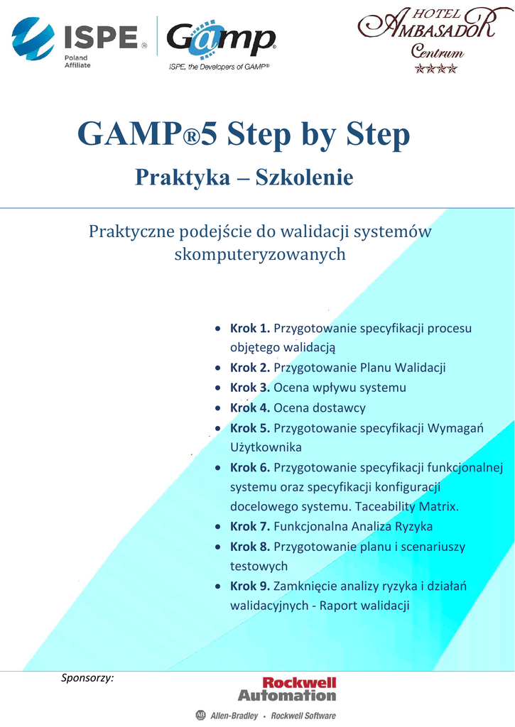 GAMP®5 Step by Step Praktyka – Szkolenie Praktyczne podejście do walidacji systemów skomputeryzowanych Krok 1. Przygotowanie specyfikacji procesu objętego walidacją Krok 2. Przygotowanie Planu Walidacji Krok 3. Ocena wpływu systemu Krok 4. Ocena dostawcy Krok 5. Przygotowanie specyfikacji Wymagań Użytkownika Krok 6. Przygotowanie specyfikacji funkcjonalnej systemu oraz specyfikacji konfiguracji docelowego systemu. Taceability Matrix. Krok 7. Funkcjonalna Analiza Ryzyka Krok 8. Przygotowanie planu i scenariuszy testowych Krok 9. Zamknięcie analizy ryzyka i działań walidacyjnych - Raport walidacji Sponsorzy: PROGRAM DZIEŃ I – 15.02.2017 8.30 – 8.45 Przywitanie uczestników 8.45 – 9.15 Wstęp - Organizacja warsztatów 9.15 – 10.00 Krok 1. Przygotowanie specyfikacji procesu objętego walidacją Gerard Halski Gerard Halski Gerard Halski 10.00 – Przerwa na kawę i herbatę 10.15 10.15 – Krok 2. Przygotowanie Specyfikacji Wymagań Użytkownika 11.45 Gerard Halski 11.45 – Przerwa na kawę i herbatę 12.00 12.00 – Krok 3. Ocena wpływu systemu 12.30 Rafał Buczek DZIEŃ II – 16.02.2017 8.30 – 8.45 Powtórka pierwszego dnia. Organizacja warsztatów. Rafał Buczek 8.45 – 10.15 Krok 6. Funkcjonalna Ocena Ryzyka. 10.15 – 10.30 Przerwa na kawę i herbatę 10.30 – 12.30 Krok 7. Przygotowanie planu i scenariuszy testowych na podstawie analizy ryzyka i oceny wpływu. Gerard Halski Robert Kolwas 12.30 – 13.00 Krok 8. Zamknięcie analizy ryzyka i działań walidacyjnych Gerard Halski 13.00 – 13.45 Lunch 12.45 – Krok 4. Przygotowanie Planu Walidacji oraz Protokołu Zarządzania Ryzykiem 14.15 Rafał Buczek 13.45 – 14.45 Krok 9. Raport walidacji. 14.15 – Lunch 15.00 14.45 – 16.15 Prezentacja i podsumowanie wyników warsztatów 12.30 – Przerwa na kawę i herbatę 12.45 15.00 – Krok 5. Przygotowanie specyfikacji funkcjonalnej systemu oraz specyfikacji 16.30 konfiguracji docelowego systemu. Traceability Matrix. Robert Kolwas 16.30 – Podsumowanie I dnia warsztatów 17.00 Gerard Halski 19:00 Kolacja Rafał Buczek Rafał Buczek GENCI PRELEGENCI Gerard Halski Absolwent wydziału Informatyki i Zarządzania Politechniki Wrocławskiej. Od wielu lat zajmuje się wdrożeniami i zastosowaniami systemów skomputeryzowanych również w przedsiębiorstwach farmaceutycznych. Konsultant, analityk, projektant, kierownik projektu. Od 2004 zajmuje się systemami zarzadzania jakością. Obecnie Project Manager oraz Quality Manager w firmie HICRON. Od 2009 roku członek stowarzyszenia ISPE aktywnie działający w pracach forum GAMP. Od 2013 Prezes Zarządu GAMP Polska. Rafał Buczek Absolwent Akademii Górniczo-Hutniczej w Krakowie (automatyka i metrologia, informatyka). Od 2001 roku zajmuje się tematyką walidacyjną w Teva Operations Poland (dawniej PLIVA Kraków). Od 2003 roku specjalizuje się w walidacji systemów komputerowych, a od 2008 roku odpowiada również za zapewnienie zgodności rozwiązań IT z przepisami prawa i standardami korporacyjnymi. Jest wewnętrznym trenerem GMP. Ponadto aktywnie działa w stowarzyszeniu ISPE Polska, jest założycielem i pierwszym prezesem Forum GAMP oraz współzałożycielem Forum Walidacji. Od czerwca 2013 jest Prezesem ISPE Polska Robert Kolwas Absolwent wydziału Fizyki Technicznej i Matematyki Stosowanej Politechniki Warszawskiej na kierunku Informatyka Stosowana. Od 2003 roku w RAN- Quality Systems (dawniej RAN - Systems Integration Services) bierze udział w projektach informatycznych dla przemysłu farmaceutycznego. Odpowiedzialny za walidację, utrzymywanie stanu zwalidowanego oraz strategiczne kierunki rozwoju systemów. Główny projektant podsystemu Elektronicznych Raportów Szarżowych systemu SZARŻA. Współtworzył system SITE eksploatowany przez GIF. Koordynował migrację systemu klasy MES na platformę.NET. Wielokrotny uczestnik zespołów analitycznych, projektowych oraz walidacyjno – wdrożeniowych. Ostatnio rozwija projekt automatyzacji testowania. Członek zarządu Forum GAMP ISPE Polska. ZGŁOSZENIE UCZESTNICTWA Zaznacz X w odpowiednim miejscu. Jestem Członkiem ISPE Nie jestem członkiem ISPE – cena bez opłaty członkostwa w ISPE 1999 PLN 2390 PLN DANE UCZESTNIKA Imię i nazwisko E-mail Firma Adres NIP Warunkiem uczestnictwa jest wysłanie zgłoszenia uczestnictwa i wniesienie opłaty za udział. Wszystkie ceny są cenami netto. Cena nie zawiera kosztów noclegu, który należy zarezerwować we własnym zakresie. Wyrażam zgodę na przetwarzanie danych na cele szkolenia zgodnie z ustawą. Warunki rezygnacji: do 8 dni przed wydarzeniem - 10% ceny podstawowej 7-1 dni przed wydarzeniem - 50% ceny w dniu wydarzenia - 100% ceny (ISPE Polska zapewnia dostarczenie materiałów z wydarzenia w wersji elektronicznej na wskazany adres mailowy). Rezygnacja z udziału, wyłącznie w formie email Szkolenie odbędzie się w hotelu Ambasador - Al. Piłsudskiego 29, Łódź. Na hasło „ISPE” przewidziane jest 10% zniżki na nocleg. Prosimy zabrać ze sobą do pracy notebooka z zainstalowanym pakietem Office (Word, Excel) ODBIORCA BANK Stowarzyszenie ISPE – Polska Chłodna 56 / 60, 00-872 Warszawa IBAN: PL 36 1050 1764 1000 0090 7120 9226 SWIFT: INGBPLPW BANK ING Bank Śląski S.A., Oddział Gdańsk ul. Długie Ogrody 6 / 14, 80-765 Gdańsk Data Prześlij skan zgłoszenia na adres mailowy [email protected] Kontakt: 792 100 620 Podpis