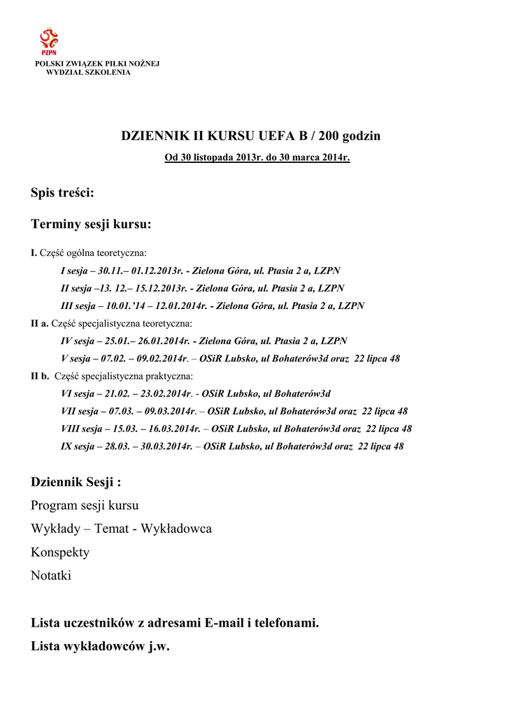 POLSKI ZWIĄZEK PIŁKI NOŻNEJ WYDZIAŁ SZKOLENIA DZIENNIK II KURSU UEFA B / 200 godzin Od 30 listopada 2013r. do 30 marca 2014r. Spis treści: Terminy sesji kursu: I. Część ogólna teoretyczna: I sesja – 30.11.– 01.12.2013r. - Zielona Góra, ul. Ptasia 2 a, LZPN II sesja –13. 12.– 15.12.2013r. - Zielona Góra, ul. Ptasia 2 a, LZPN III sesja – 10.01.’14 – 12.01.2014r. - Zielona Góra, ul. Ptasia 2 a, LZPN II a. Część specjalistyczna teoretyczna: IV sesja – 25.01.– 26.01.2014r. - Zielona Góra, ul. Ptasia 2 a, LZPN V sesja – 07.02. – 09.02.2014r. – OSiR Lubsko, ul Bohaterów3d oraz 22 lipca 48 II b. Część specjalistyczna praktyczna: VI sesja – 21.02. – 23.02.2014r. - OSiR Lubsko, ul Bohaterów3d VII sesja – 07.03. – 09.03.2014r. – OSiR Lubsko, ul Bohaterów3d oraz 22 lipca 48 VIII sesja – 15.03. – 16.03.2014r. – OSiR Lubsko, ul Bohaterów3d oraz 22 lipca 48 IX sesja – 28.03. – 30.03.2014r. – OSiR Lubsko, ul Bohaterów3d oraz 22 lipca 48 Dziennik Sesji : Program sesji kursu Wykłady – Temat - Wykładowca Konspekty Notatki Lista uczestników z adresami E-mail i telefonami. Lista wykładowców j.w. PLAN ZAJĘĆ I KURSU UEFA B / 200 godzin w Lubuskim ZPN I sesja – cz. ogólna / 30.11.– 01.12.2013r. 30.11.’13 sobota Godz. 9.00 – 18.00 Zielona Góra, ul. Ptasia 2 a, LZPN sala wykładowa / teoria 01.12.’13 niedziela Godz. 9.00 – 16.00 Zielona Góra, ul. Ptasia 2 a, LZPN sala wykładowa / teoria II sesja – cz. ogólna / 13. 12.– 15.12.2013r. 13.12.’13 piątek Godz. 17.00 – 19.30 Zielona Góra, ul. Ptasia 2 a, LZPN sala wykładowa / teoria 14.12.’13 sobota Godz. 9.00 – 19.45 Zielona Góra, ul. Ptasia 2 a, LZPN sala wykładowa / teoria 15.12.’13 niedziela Godz. 9.00 – 14.45 Zielona Góra, ul. Ptasia 2 a, LZPN sala wykładowa / teoria III sesja – cz. ogólna / 10.01.’14 – 12.01.2014r. 10.01.’14 piątek Godz. 17.00 – 19.30 Zielona Góra, ul. Ptasia 2 a, LZPN sala wykładowa / teoria 11.01.’14 sobota Godz. 9.00 – 19.30 Zielona Góra, ul. Ptasia 2 a, LZPN sala wykładowa / teoria 12.01.’14 niedziela Godz. 9.00 – 17.30 Zielona Góra, ul. Ptasia 2 a, LZPN sala wykładowa / teoria IV sesja – cz. specjalistyczna teoria / 25.01.– 26.01.2014r. 25.01.’14 sobota Godz. 9.00 – 17.30 Zielona Góra, ul. Ptasia 2 a, LZPN sala wykładowa / teoria 26.01.’14 niedziela Godz. 9.00 – 15.30 Zielona Góra, ul. Ptasia 2 a, LZPN sala wykładowa / teoria V sesja – cz. specjalistyczna teoria / 07.02. – 09.02.2014r. 07.02.’14 piątek Godz. 17.30 – 20.30 Lubsko, OSiR ul.22 lipca 48 sala wykładowa / teoria 08.02.’14 sobota Godz. 9.00 – 20.00 Lubsko, OSiR ul.22 lipca 48 sala wykładowa / teoria / Hala / praktyka – obowiązkowy sprzęt treningowy z obuwiem piłkarskim 09.02.’14 niedziela Godz. 9.00 – 14.00 Lubsko, OSiR ul.22 lipca 48 - Egzamin pisemny teoria godz.12.15 sala wykładowa / teoria VI sesja – cz. specjalistyczna praktyka / 21.02. – 23.02.2014r. 21.02.’14 piątek Godz. 17.00 – 20.00 - Lubsko OSiR ul. Bohaterów 3 d Hala / praktyka – obowiązkowy sprzęt treningowy z obuwiem piłkarskim 22.02.’14 sobota Godz. 9.00 – 18.00 Lubsko OSiR ul. Bohaterów 3 d Hala / praktyka – obowiązkowy sprzęt treningowy z obuwiem piłkarskim 23.02.’14 niedziela Godz. 9.00 – 14.00 Lubsko OSiR ul. Bohaterów 3 d Hala / praktyka – obowiązkowy sprzęt treningowy z obuwiem piłkarskim VII sesja – cz. specjalistyczna praktyka / 07.03. – 09.03.2014r. 07.03.’14 piątek Godz. 17.30 – 19.00 Lubsko OSiR ul. Bohaterów 3 d Hala / praktyka – obowiązkowy sprzęt treningowy z obuwiem piłkarskim 08.03.’14 sobota Godz. 9.00 – 18.30 Lubsko OSiR ul. Bohaterów 3 d Hala / praktyka – obowiązkowy sprzęt treningowy z obuwiem piłkarskim 09.03.’14 niedziela Godz. 9.00 – 13.45 Lubsko OSiR ul. Bohaterów 3 d Hala / praktyka – obowiązkowy sprzęt treningowy z obuwiem piłkarskim VIII sesja – cz. specjalistyczna praktyka / 15.03. – 16.03.2014r. 15.03.’14 sobota Godz. 9.00 – 18.30 Lubsko OSiR ul. Bohaterów 3 d Hala / praktyka – obowiązkowy sprzęt treningowy z obuwiem piłkarskim 16.03.’14 niedziela Godz. 9.00 – 17.00 Lubsko OSiR ul. Bohaterów 3 d Hala / praktyka – obowiązkowy sprzęt treningowy z obuwiem piłkarskim IX Sesja Egzaminacyjna / 28.03. – 30.03.2014r. 28.03.’14 piątek od godz. 16.00 , sobota od godz. 9.30 / Egzaminy Praktyczne z zespołami młodzieżowymi Budowlanych Lubsko - Lubsko OSiR ul. Bohaterów 3 d 21.07.’13 niedziela g. 9.30 / Egzamin Ustny - Lubsko, OSiR ul.22 lipca 48 Praktykę trenerską w wyznaczonym klubie minimum IV ligi należy odbyć od 10.01.’14 do 06.03.’14 ze złożeniem dokumentów i raportu ze stażu do 10.03.2014r. Opiekunem stażu trenerskiego może być jedynie trener posiadający dyplom trenerski UEFA B lub wyższe uprawnienia trenerskie. Egzaminy praktyczne w określonych godzinach, z wyznaczonymi drużynami młodzieżowymi MLKS Budowlani Lubsko na podstawie wskazanych tematów konspektów. Lista trenerów wykładowców Lubuskiego ZPN w Zielonej Górze prowadzących zajęcia podczas II kursu UEFA B – 200 godz. listopad – marzec 2014r. 1. mgr Piotr Maranda – 502737723, [email protected] - PZPN 2. dr Krzysztof Paluszek – 662196225, [email protected] - PZPN 3. dr Eleonora Sikora – 502118219, [email protected] 4. dr Janusz Płaczek – 607221355, [email protected] 5. dr Włodzimierz Stronczyński – 784685760, [email protected] 6. mgr Henryk Mazurkiewicz – 607420265, [email protected] 7. mgr Jarosław Miś – 604215401, [email protected] 8. mgr Sylwester Buczyński - 603453702, [email protected] 9. mgr Michał Grzelczyk – 606681530, [email protected] 10. mgr Łukasz Becella – 606454974, [email protected] 11. mgr Bogusław Kobyliński – 692484669, [email protected] 12. mgr Mirosław Zelisko – 605108930, [email protected] 13. mgr Daniel Szałęga – 604120215, [email protected] 14. mgr Marek Lemański 
