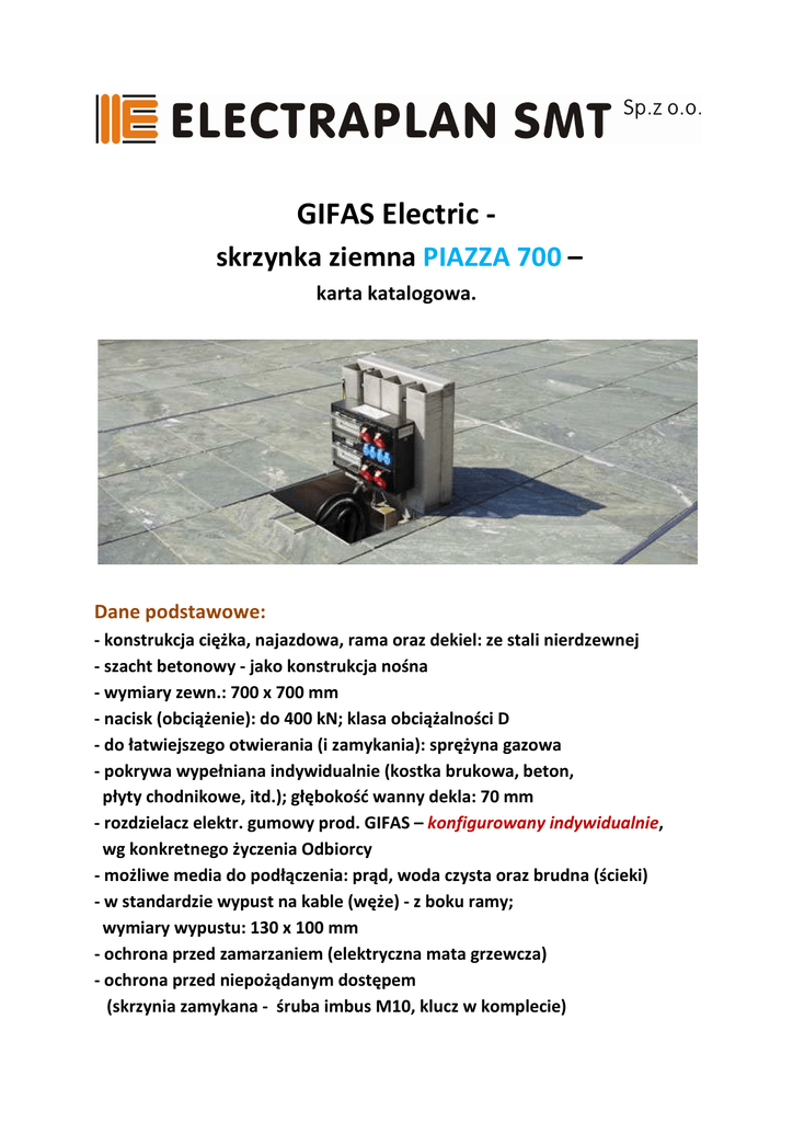 GIFAS Electric skrzynka ziemna PIAZZA 700 – karta katalogowa. Dane podstawowe: - konstrukcja ciężka, najazdowa, rama oraz dekiel: ze stali nierdzewnej - szacht betonowy - jako konstrukcja nośna - wymiary zewn.: 700 x 700 mm - nacisk (obciążenie): do 400 kN; klasa obciążalności D - do łatwiejszego otwierania (i zamykania): sprężyna gazowa - pokrywa wypełniana indywidualnie (kostka brukowa, beton, płyty chodnikowe, itd.); głębokość wanny dekla: 70 mm - rozdzielacz elektr. gumowy prod. GIFAS – konfigurowany indywidualnie, wg konkretnego życzenia Odbiorcy - możliwe media do podłączenia: prąd, woda czysta oraz brudna (ścieki) - w standardzie wypust na kable (węże) - z boku ramy; wymiary wypustu: 130 x 100 mm - ochrona przed zamarzaniem (elektryczna mata grzewcza) - ochrona przed niepożądanym dostępem (skrzynia zamykana - śruba imbus M10, klucz w komplecie) Zastosowanie: - place, rynki miejskie miejsca do organizacji imprez (koncerty, imprezy sportowe) hale widowiskowo - sportowe, stadiony hale przemysłowe, targowe, wystawowe deptaki, parkingi hangary inne miejsca, gdzie potrzeba szybkiego i prostego dostępu do zasilania elektr. Dostawa: - skrzynka kompletna (konstrukcja ze stali nierdzewnej wraz z wypełnianym deklem), oraz rozdzielaczem głównym i złączem kablowym. Dostawa skrzyni wraz z szachtem betonowym (wymiary: Ø800 mm, H= 600 mm). Uwagi montażowe (do wykonania na placu budowy): - skrzynia wymaga podłączenia (odwodnienia szachtu) do istniejącej kanalizacji; możliwy (wymaga to jednak sprawdzenia) drenaż pod skrzynią - wykop, ustawienie skrzyni oraz wypełnienie dekla (np. kostką brukową) winien wykonać fachowy personel na budowie. Dotyczy to również prac elektrycznych. Wymiarowanie skrzyni. Rozdzielacz elektryczny. - bezpieczna obudowa standardowa rozdzielcza gumowego (kauczuk butylowy, samogaszący) prod. GIFAS - dobre właściwości izolacyjne rozdzielacza - duża odporność na narażenia mechaniczne oraz warunki klimatyczne - bezpieczniki LS oraz różnicowo – prądowe w rozdzielaczu - zabezpieczone są bryzgoszczelnymi klapkami. Uwaga: konfiguracja elektryczna rozdzielacza - indywidualna, zgodna z życzeniem Odbiorcy (wymaga uprzedniego uzgodnienia i indywidualnej wyceny!). Widok przykładowego rozdzielacza. Przykładowe wersje wyposażenia rozdzielaczy. Poniżej przedstawiono przykłady wyposażenia elektrycznego rozdzielaczy w skrzyniach PIAZZA 700. Każda inna wersja wyposażenia rozdzielacza jest możliwa. Skrzynka przyłącza (złącza) kablowego. Wielkość tego przyłącza(standardowe skrzynki) zależna jest od rodzaju i wielkości kabli. W skrzynce tej zamontowane są odpowiednie zaciski (klemy).