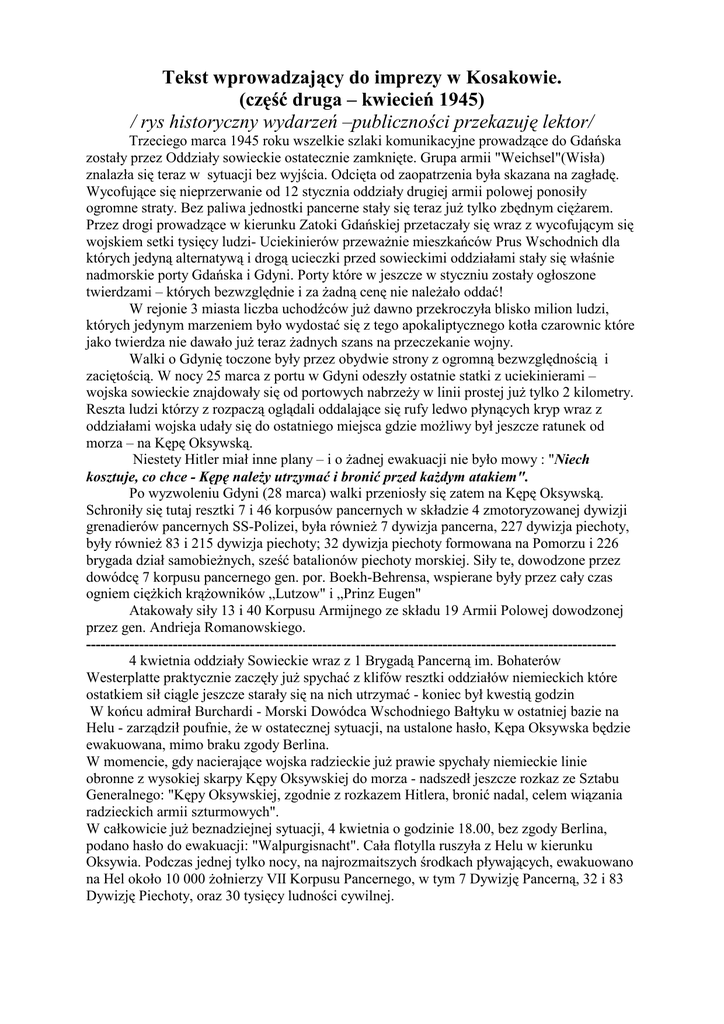 Tekst wprowadzający do imprezy w Kosakowie. (część druga – kwiecień 1945) / rys historyczny wydarzeń –publiczności przekazuję lektor/ Trzeciego marca 1945 roku wszelkie szlaki komunikacyjne prowadzące do Gdańska zostały przez Oddziały sowieckie ostatecznie zamknięte. Grupa armii "Weichsel"(Wisła) znalazła się teraz w sytuacji bez wyjścia. Odcięta od zaopatrzenia była skazana na zagładę. Wycofujące się nieprzerwanie od 12 stycznia oddziały drugiej armii polowej ponosiły ogromne straty. Bez paliwa jednostki pancerne stały się teraz juŜ tylko zbędnym cięŜarem. Przez drogi prowadzące w kierunku Zatoki Gdańskiej przetaczały się wraz z wycofującym się wojskiem setki tysięcy ludzi- Uciekinierów przewaŜnie mieszkańców Prus Wschodnich dla których jedyną alternatywą i drogą ucieczki przed sowieckimi oddziałami stały się właśnie nadmorskie porty Gdańska i Gdyni. Porty które w jeszcze w styczniu zostały ogłoszone twierdzami – których bezwzględnie i za Ŝadną cenę nie naleŜało oddać! W rejonie 3 miasta liczba uchodźców juŜ dawno przekroczyła blisko milion ludzi, których jedynym marzeniem było wydostać się z tego apokaliptycznego kotła czarownic które jako twierdza nie dawało juŜ teraz Ŝadnych szans na przeczekanie wojny. Walki o Gdynię toczone były przez obydwie strony z ogromną bezwzględnością i zaciętością. W nocy 25 marca z portu w Gdyni odeszły ostatnie statki z uciekinierami – wojska sowieckie znajdowały się od portowych nabrzeŜy w linii prostej juŜ tylko 2 kilometry. Reszta ludzi którzy z rozpaczą oglądali oddalające się rufy ledwo płynących kryp wraz z oddziałami wojska udały się do ostatniego miejsca gdzie moŜliwy był jeszcze ratunek od morza – na Kępę Oksywską. Niestety Hitler miał inne plany – i o Ŝadnej ewakuacji nie było mowy : "Niech kosztuje, co chce - Kępę naleŜy utrzymać i bronić przed kaŜdym atakiem". Po wyzwoleniu Gdyni (28 marca) walki przeniosły się zatem na Kępę Oksywską. Schroniły się tutaj resztki 7 i 46 korpusów pancernych w składzie 4 zmotoryzowanej dywizji grenadierów pancernych SS-Polizei, była równieŜ 7 dywizja pancerna, 227 dywizja piechoty, były równieŜ 83 i 215 dywizja piechoty; 32 dywizja piechoty formowana na Pomorzu i 226 brygada dział samobieŜnych, sześć batalionów piechoty morskiej. Siły te, dowodzone przez dowódcę 7 korpusu pancernego gen. por. Boekh-Behrensa, wspierane były przez cały czas ogniem cięŜkich krąŜowników „Lutzow" i „Prinz Eugen" Atakowały siły 13 i 40 Korpusu Armijnego ze składu 19 Armii Polowej dowodzonej przez gen. Andrieja Romanowskiego. -------------------------------------------------------------------------------------------------------------4 kwietnia oddziały Sowieckie wraz z 1 Brygadą Pancerną im. Bohaterów Westerplatte praktycznie zaczęły juŜ spychać z klifów resztki oddziałów niemieckich które ostatkiem sił ciągle jeszcze starały się na nich utrzymać - koniec był kwestią godzin W końcu admirał Burchardi - Morski Dowódca Wschodniego Bałtyku w ostatniej bazie na Helu - zarządził poufnie, Ŝe w ostatecznej sytuacji, na ustalone hasło, Kępa Oksywska będzie ewakuowana, mimo braku zgody Berlina. W momencie, gdy nacierające wojska radzieckie juŜ prawie spychały niemieckie linie obronne z wysokiej skarpy Kępy Oksywskiej do morza - nadszedł jeszcze rozkaz ze Sztabu Generalnego: "Kępy Oksywskiej, zgodnie z rozkazem Hitlera, bronić nadal, celem wiązania radzieckich armii szturmowych". W całkowicie juŜ beznadziejnej sytuacji, 4 kwietnia o godzinie 18.00, bez zgody Berlina, podano hasło do ewakuacji: "Walpurgisnacht". Cała flotylla ruszyła z Helu w kierunku Oksywia. Podczas jednej tylko nocy, na najrozmaitszych środkach pływających, ewakuowano na Hel około 10 000 Ŝołnierzy VII Korpusu Pancernego, w tym 7 Dywizję Pancerną, 32 i 83 Dywizję Piechoty, oraz 30 tysięcy ludności cywilnej. Dopiero w 6 godzin po ewakuacji Hitler wyraził zgodę na jej przeprowadzenie, nie wiedząc naturalnie, Ŝe juŜ została wykonana. Akcja ta zyskała miano największej akcji humanitarnej ostatnich dni drugiej wojny światowej na Bałtyku. 5 kwietnia około 17.00 (3) czołgi T-34 2 batalionu ze składu 1 BP z chrzęstem piasku pomiędzy ogniwami ochraniane przez Ŝołnierzy 10 Gwardyjskiej Dywizji Piechoty wdarły się do Kosakowa, Rewy i Mechelinek zamykając tym samym straszliwy rozdział „pomorskiej apokalipsy” ostatnich dni. Do niewoli wzięto 3340 Ŝołnierzy. W wyniku poniesionych podczas walk o Gdyńsko-Gdański rejon umocniony 1 Brygada Pancerna im. Bohaterów Westerplatte została wycofana z pierwszej linii – nie wzięła juŜ do końca wojny udziału w Ŝadnej operacji wojskowej. Ze stanu 55 maszyn z jakimi ruszała do walki – po dojściu do brzegów Bałtyku w Brygadzie zostało sprawnych jedynie 6 maszyn – reszta była zniszczona lub znajdowała się w róŜnego rodzaju remontach. Niestety pokonanie Niemców przez wojska polskie oraz sowieckie nie oznaczało w Ŝadnym razie wyzwolenia i odzyskania upragnionej wolności i suwerenności – na nią czekać przyszło nam jeszcze blisko pół wieku. Mimo to nie wolno nam zapominać o tych wszystkich prostych Ŝołnierzach którzy święcie wierząc Ŝe walczą o Polskę wolną i suwerenną przelewali za nią krew / W tekście wykorzystano materiały i informację pochodzące ze strony internetowej www.pomorze.gd.pl - podejmującej problematykę walk o rejon trójmiasta w końcowej fazie działań wojennych /