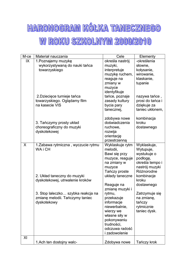 M-ce IX Materiał nauczania 1.Poznajemy muzykę wykorzystywaną do nauki tańca towarzyskiego 2.Dziecięce turnieje tańca towarzyskiego. Oglądamy film na kasecie VIS 3. Tańczymy prosty układ choreograficzny do muzyki dyskotekowej X 1.Zabawa rytmiczna , wyczucie rytmu WA i CH 2. Układ taneczny do muzyki dyskotekowej, utrwalenie kroków 3. Stop laleczko… szybka reakcja na zmianę melodii. Tańczymy taniec dyskotekowy Cele określa nastrój muzyki, interpretuje muzykę ruchem, reaguje na zmiany w muzyce identyfikuje tańce, poznaje zasady kultury bycia pary tanecznej, Elementy -określenia słowne, kołysanie, wirowanie, klaskanie, tupanie zdobywa nowe doświadczenia ruchowe, rozwija orientację przestrzenną Wyklaskuje rytm melodii, Bawi się przy muzyce, reaguje na zmiany w muzyce Tańczy proste układy taneczne kombinacja kroku dostawnego Reaguje na zmianę muzyki i rytmu, przekazuje informacje niewerbalnie, wierzy we własne siły w pokonywaniu trudności, odczuwa radość i zadowolenie nazywa tańce , prosi do tańca i dziękuje za taniec ukłonem, Wyklaskuje, Wytupuje, wystukuje o podłogę, określa tempo i nastrój muzyki Różnorodne kombinacje kroku dostawnego Zatrzymuje się na zmianę, tańczy rytmicznie taniec dysk. XI 1.Ach ten dostojny walc- Zdobywa nowe Tańczy krok wprowadzenie kroku podstawowego WA doświadczenia ruchowe, wyklaskuje rytm WA WA po kwadracie, wytupuje, wyklaskuje 2.Porywająca muzyka. Dowolne interpretacje ruchowe, sposób zachowania się pary tanecznej Interpretuje ruchowo muzykę taneczną w sposób dowolny, kulturalnie zwraca się do kolegów. Wiruje, kołysze się , stosuje poznane kroki 3. Tańczymy walca. Zna krok podstawowy walca, tańczy z partnerem, współdziała w parze Partner zaprasza do tańca ukłonem, wyprowadza na parkiet, tańczy krok WA ,dziękuje za taniec ukłonem i odprowadza partnerkę. Zmiana partnerów. 1.Zimowa cha-cha. My się zimy nie boimy czaczę ładnie zatańczymy. Identyfikuje taniec, interpretuje ruchem rytm melodii, nabywa odporność na niepowodzenia wierzy we własne siły, próbuje zatańczyć krok elementarny Nazywa taniec, wytupuje wyklaskuje, wystukuje, Tańczy kombinację kroków XII Bawi się przy 2.Przedstaw ruchem słyszaną melodię muzyce, ( WW,T,J) współdziała zgodnie, rozwija orientację w przestrzeni, ilustruje ruchem Pląsa, wiruje, podskakuje, wyklaskuje, wytupuje melodię Zna krok podstawowy, tańczy w parze 3. Tańcz z nami cha-cha-cha Wyklaskuje, wytupuje, tańczy krok tańca CHA I II 1.Jakie tańce już znamy? – doskonalenie kroków poznanych tańców. Identyfikuje taniec, tańczy krok podstawowy indywidualnie i w parze Wyklaskuje , wytupuje, Tańczy wprowadzone kroki 2. Jaka to melodia, jaki to taniec? Wprowadzenie melodii kroku podstawowego tanga (T) Zdobywa nowe doświadczenia ruchowe, przekazuje informacje niewerbalnie Wyklaskuje, Wytupuje, wystukuje rytm, powtarza krok taneczny wolny, wolny, szybki, szybki; wolny szybki, szybki, wolny 3.Tańcz, tańcz ! utrwalamy krok tanga, tańczymy wszystkie poznane tańce. Stosuje zasady kultury bycia pary tanecznej, Współdziała z partnerem, tańczy w parze 4. Prezentujemy swoje umiejętności na uroczystości Dnia Babci i Dziadka Wierzy we własne siły, stosuje zasady współdziałania pary tanecznej, tańczy z partnerem znane wybrane tańce Przedstawia rytm melodii tanecznej w 1. Rytm jest częścią muzyki. Zabawy rytmiczne. Prosi partnerkę ukłonem , wyprowadza na parkiet, ukłonem dziękuje i odprowadza, Tańczy w parze w rytm muzyki Wykonuje sekwencje znanych kroków w rytm muzyki tanecznej Wystukuje na instrumentach perkusyjnych,w sposób dowolny 2.Tańcz jak „Ja” Interpretuje ruchem rodzaj muzyki ytupuje, wyklaskuje rytmy poznanych tańców. Tańczy kroki poznanych tańców III 1.Wiosenny walczyk. IV Zdobywa nowe doświadczenia ruchowe Tańczy krok na dwa-pa po kole 2. Te tańce już znamy. Doskonalimy estetykę poruszania się w rytmie muzyki. Wykonuje płynne ruchy taneczne, dba o prawidłową sylwetkę taneczną Płynnie wykonuje sekwencje kroków, utrzymuje wyprostowaną sylwetkę 3. Czy to walc czy walczyk? Utrwalamy krok na dwa-pa, poznajemy krok na trzy-pa. Zdobywa nowe doświadczenia ruchowe, przekazuje informacje niewerbalnie Wyklaskuje rytm WA i WW, wytupuje, tańczy kombinację kroków do rytmu 1.Samba – poznajemy krok elementarny Zdobywa nowe doświadczenia ruchowe Wyklaskuje wytupuje, powtarza obserwowaną kombinację kroków 2.Jaka to melodia, jaki to taniec? Identyfikuje tańce, tańczy z partnerem poznane tańce Wykonuje znane sekwencje kroków z partnerem 3. A melodia płynie: zabawy kształcące płynność i estetykę ruchów. Utrwalamy krok samby. Wykonuje płynne ruchy w takt muzyki, reaguje na zmiany w muzyce Kołysze się, wiruje, przenosi ciężar ciała z nogi na nogę Wyklaskuje, V 1. Jive- wprowadzenie kroku elementarnego. Zdobywa nowe doświadczenia ruchowe, określa rodzaj muzyki. 2. Zatańcz tak jak ja. Tańczymy układy taneczne wszystkich poznanych tańców, utrwalamy krok jiva. Tańczy indywidualnie i z partnerem, stosuje zasady kulturalne pary tanecznej, identyfikuje tańce. 3. Konkurs taneczny. Pokaz umiejętności dla rodziców i zaproszonych gości. Tańczy z partnerem , zna kroki tańców WA,WW,T,S, J,CH, stosuje kulturę bycia tancerzy, dba o płynność i estetykę ruchów, utrzymuje prawidłową sylwetkę. Opracowała : Stanisława Ciszewska wystukuje rytm, przekłada go na kroki Nazywa tańce, wykonuje sekwencje znanych kroków tanecznych do rytmu melodii. Krok po kwadracie WA; krok na 2-pa,po kole WW; krok w,w,s,s ; w , s,s,w,T; kroki elementarne tańców latyno amerykań-skich