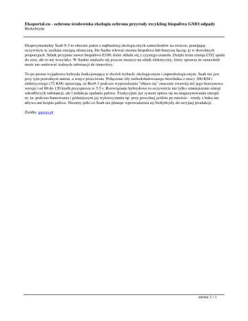 Ekoportal.eu - ochrona środowiska ekologia ochrona przyrody recykling biopaliwa GMO odpady Biohybryda Eksperymentalny Saab 9-3 to obecnie jeden z najbardziej ekologicznych samochodów na świecie, pomijając oczywiście te zasilane energią słoneczną. Do Saaba wlewać można biopaliwa lub benzynę łącząc je w dowolnych proporcjach. Silnik przyjmie nawet biopaliwo E100, które składa się z czystego etanolu. Dzięki temu emisja CO2 spada do zera, ale to nie wszystko. W Saabie znalazło się jeszcze miejsce na silnik elektryczny, który sprawia że samochód może nie emitować żadnych substancji do atmosfery. To po prostu wyjątkowa hybryda funkcjonująca w dwóch trybach: ekologicznym i superekologicznym. Saab nie jest przy tym powolnym autem, a wręcz przeciwnie. Połączone siły turbodoładowanego biosilnika o mocy 260 KM i elektrycznego (72 KM) sprawiają, że Bio9-3 podczas wyprzedzania "zbiera się" znacznie żwawiej niż jego benzynowa wersja i od 80 do 120 km/h przyspiesza w 5,5 s. Rozwiązanie hybrydowe to oczywiście nie tylko zmniejszenie emisji szkodliwych substancji, ale i redukcja spalania paliwa. Tradycyjnie już system opiera się na magazynowaniu energii m. in. podczas hamowania i późniejszym jej wykorzystaniu np. przy powolnej jeździe po mieście - wtedy z baku nie ubywa ani kropla paliwa. Niestety póki co Saab nie planuje wprowadzenia tej biohybrydy do seryjnej produkcji. Źródło: gazeta.pl strona 1 / 1
