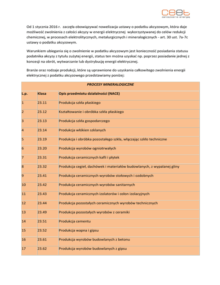 Od 1 stycznia 2016 r. zaczęła obowiązywad nowelizacja ustawy o podatku akcyzowym, która daje możliwośd zwolnienia z całości akcyzy w energii elektrycznej wykorzystywanej do celów redukcji chemicznej, w procesach elektrolitycznych, metalurgicznych i mineralogicznych - art. 30 ust. 7a-7c ustawy o podatku akcyzowym. Warunkiem ubiegania się o zwolnienie w podatku akcyzowym jest koniecznośd posiadania statusu podatnika akcyzy z tytułu zużytej energii, status ten można uzyskad np. poprzez posiadanie jednej z koncesji na obrót, wytwarzanie lub dystrybucję energii elektrycznej. Branże oraz rodzaje produkcji, które są uprawnione do uzyskania całkowitego zwolnienia energii elektrycznej z podatku akcyzowego przedstawiamy poniżej: PROCESY MINERALOGICZNE L.p. Klasa Opis przedmiotu działalności (NACE) 1 23.11 Produkcja szkła płaskiego 2 23.12 Kształtowanie i obróbka szkła płaskiego 3 23.13 Produkcja szkła gospodarczego 4 23.14 Produkcja włókien szklanych 5 23.19 Produkcja i obróbka pozostałego szkła, włączając szkło techniczne 6 23.20 Produkcja wyrobów ogniotrwałych 7 23.31 Produkcja ceramicznych kafli i płytek 8 23.32 Produkcja cegieł, dachówek i materiałów budowlanych, z wypalanej gliny 9 23.41 Produkcja ceramicznych wyrobów stołowych i ozdobnych 10 23.42 Produkcja ceramicznych wyrobów sanitarnych 11 23.43 Produkcja ceramicznych izolatorów i osłon izolacyjnych 12 23.44 Produkcja pozostałych ceramicznych wyrobów technicznych 13 23.49 Produkcja pozostałych wyrobów z ceramiki 14 23.51 Produkcja cementu 15 23.52 Produkcja wapna i gipsu 16 23.61 Produkcja wyrobów budowlanych z betonu 17 23.62 Produkcja wyrobów budowlanych z gipsu 18 23.63 Produkcja masy betonowej prefabrykowane 19 23.64 Produkcja zaprawy murarskie 20 23.65 Produkcja cementu wzmocnionego włóknem 21 23.69 Produkcja pozostałych wyrobów z betonu, gipsu i cementu 22 23.70 Cięcie, formowanie i wykaoczanie kamienia 23 23.91 Produkcja wyrobów ściernych 24 23.99 Produkcja wyrobów z pozostałych mineralnych surowców niemetalicznych, gdzie indziej niesklasyfikowana PROCESY METALURGICZNE L.p. Klasa Opis przedmiotu działalności 1 24.10 Produkcja surówki żelazostopów, żeliwa i stali oraz wyrobów hutniczych 2 24.20 Produkcja rur, przewodów, kształtowników zamkniętych i łączników, ze stali 3 24.31 Produkcja prętów ciągnionych na zimno 4 24.32 Produkcja wyrobów płaskich walcowanych na zimno 5 24.33 Produkcja wyrobów formowanych na zimno 6 24.34 Produkcja drutu 7 24.41 Produkcja metali szlachetnych 8 24.42 Produkcja aluminium 9 24.43 Produkcja ołowiu, cynku i cyny 10 24.44 Produkcja miedzi 11 24.45 Produkcja pozostałych metali nieżelaznych 12 24.46 Wytwarzanie paliw jądrowych 13 24.51 Odlewnictwo żeliwa 14 24.52 Odlewnictwo staliwa 15 24.53 Odlewnictwo metali lekkich 16 24.54 Odlewnictwo pozostałych metali nieżelaznych PROCESY ELEKTROLITYCZNE Nie jest możliwe wskazanie konkretnych kodów PKD. Zalecana jest interpretacja indywidualna. REDUKCJA CHEMICZNA nie jest możliwe wskazanie konkretnych kodów PKD. Zalecana jest interpretacja indywidualna.