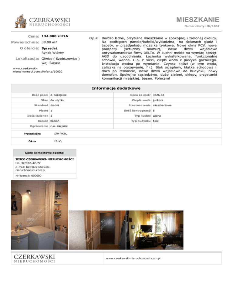 MIESZKANIE Numer oferty: Mi/1867 Cena: 134 000 zł PLN Powierzchnia: 38.00 m² O ofercie: Sprzedaż Rynek Wtórny Lokalizacja: Gliwice ( Szobiszowice ) woj. Śląskie www.czerkawskinieruchomosci.com.pl/oferta/10020 Opis: Bardzo ładne, przytulne mieszkanie w spokojnej i zielonej okolicy. Na podłogach panele/kafelki/wykładzina, na ścianach gładź i tapety, w przedpokoju mozaika tynkowa. Nowe okna PCV, nowe parapety (sztuczny mamur), nowe drzwi wejściowe antywałamaniowe firmy DELTA. W kuchni meble na wymiar, sprzęt AGD do uzgodnienia. Łazienka wykafelkowana, funkcjonalne schowki, wanna. C.o. z sieci, ciepła woda z piecyka gazowego. Instalacja wodna po wymianie. Czynsz 440zł (w tym woda, zaliczka na ogrzewanie, f.r.). Blok ocieplony, klatka schodowa i dach po remoncie, nowe drzwi wejściowe do budynku, nowy domofon. Spokojne sąsiedztwo, dużo zieleni, sklepy, przystanki komunikacji miejskiej, basen. Polecam! Informacje dodatkowe Ilość pokoi 2-pokojowe Stan do użytku Standard średni Piętro 1 Cena za metr 3526.32 Ciepła woda junkers Przeznaczenie mieszkaniowe Ilość kondygnacji 5 Ilość łazienek 1 Typ kuchni widna Balkon balkon Typ budynku blok Ogrzewanie c.o. miejskie Przynależne Okna piwnica, PCV, Dane kontaktowe agenta: TESCO CZERKAWSKI-NIERUCHOMOŚCI tel. 32/332-42-72 e-mail: [email protected] Nr licencji: 000000 www.czerkawski-nieruchomosci.com.pl