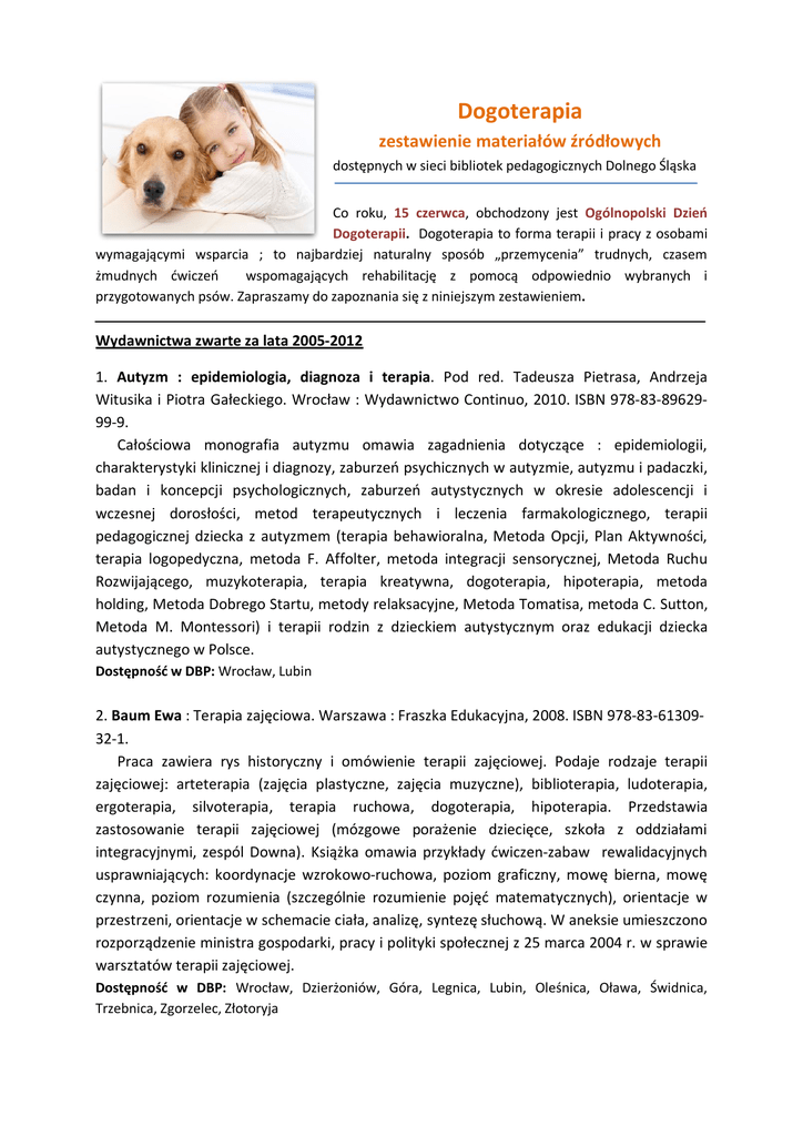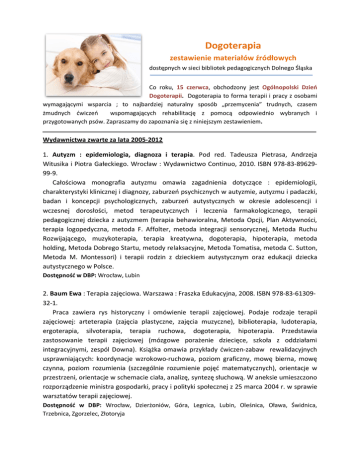 Dogoterapia zestawienie materiałów źródłowych dostępnych w sieci bibliotek pedagogicznych Dolnego Śląska Co roku, 15 czerwca, obchodzony jest Ogólnopolski Dzień Dogoterapii. Dogoterapia to forma terapii i pracy z osobami wymagającymi wsparcia ; to najbardziej naturalny sposób „przemycenia” trudnych, czasem żmudnych ćwiczeń wspomagających rehabilitację z pomocą odpowiednio wybranych i przygotowanych psów. Zapraszamy do zapoznania się z niniejszym zestawieniem. Wydawnictwa zwarte za lata 2005-2012 1. Autyzm : epidemiologia, diagnoza i terapia. Pod red. Tadeusza Pietrasa, Andrzeja Witusika i Piotra Gałeckiego. Wrocław : Wydawnictwo Continuo, 2010. ISBN 978-83-8962999-9. Całościowa monografia autyzmu omawia zagadnienia dotyczące : epidemiologii, charakterystyki klinicznej i diagnozy, zaburzeń psychicznych w autyzmie, autyzmu i padaczki, badan i koncepcji psychologicznych, zaburzeń autystycznych w okresie adolescencji i wczesnej dorosłości, metod terapeutycznych i leczenia farmakologicznego, terapii pedagogicznej dziecka z autyzmem (terapia behawioralna, Metoda Opcji, Plan Aktywności, terapia logopedyczna, metoda F. Affolter, metoda integracji sensorycznej, Metoda Ruchu Rozwijającego, muzykoterapia, terapia kreatywna, dogoterapia, hipoterapia, metoda holding, Metoda Dobrego Startu, metody relaksacyjne, Metoda Tomatisa, metoda C. Sutton, Metoda M. Montessori) i terapii rodzin z dzieckiem autystycznym oraz edukacji dziecka autystycznego w Polsce. Dostępność w DBP: Wrocław, Lubin 2. Baum Ewa : Terapia zajęciowa. Warszawa : Fraszka Edukacyjna, 2008. ISBN 978-83-6130932-1. Praca zawiera rys historyczny i omówienie terapii zajęciowej. Podaje rodzaje terapii zajęciowej: arteterapia (zajęcia plastyczne, zajęcia muzyczne), biblioterapia, ludoterapia, ergoterapia, silvoterapia, terapia ruchowa, dogoterapia, hipoterapia. Przedstawia zastosowanie terapii zajęciowej (mózgowe porażenie dziecięce, szkoła z oddziałami integracyjnymi, zespól Downa). Książka omawia przykłady ćwiczen-zabaw rewalidacyjnych usprawniających: koordynacje wzrokowo-ruchowa, poziom graficzny, mowę bierna, mowę czynna, poziom rozumienia (szczególnie rozumienie pojęć matematycznych), orientacje w przestrzeni, orientacje w schemacie ciała, analizę, syntezę słuchową. W aneksie umieszczono rozporządzenie ministra gospodarki, pracy i polityki społecznej z 25 marca 2004 r. w sprawie warsztatów terapii zajęciowej. Dostępność w DBP: Wrocław, Dzierżoniów, Góra, Legnica, Lubin, Oleśnica, Oława, Świdnica, Trzebnica, Zgorzelec, Złotoryja 3. Baum Ewa : Terapia zajęciowa. Dodr. do wyd. 1. Warszawa : Fraszka Edukacyjna, 2009. ISBN 978-83-61309-32-1. Dostępność w DBP: Wrocław, Wałbrzych 4. Dziecko z niepełnosprawnością ruchowa : jak wspomagać rozwój psychoruchowy. Red. nauk. Maria Borkowska. Warszawa : Wydawnictwo Lekarskie PZWL, cop. 2012. ISBN 978-83200-4111-8. W poradniku przedstawiono podstawowa wiedze na temat uwarunkowań, prawidłowego przebiegu i najczęstszych zaburzeń rozwojowych oraz sposobów wspomagania i leczenia. Omówiono m. in.: kinezyterapie, fizykoterapie, muzykoterapie, hipoterapie, dogoterapie, delfinoterapie, metody usprawniania ruchowego np. NDT-Bobath, Peto, Vaclava Vojty, Glenna Domana. Dostępność w DBP : Wrocław, Jelenia Góra, Legnica, Ząbkowice Śląskie, Zgorzelec, Złotoryja 5. Franczyk Anna, Krajewska Katarzyna, Skorupa Joanna : Animaloterapia : program Przedszkolnego Klubu Animals "Cztery łapy". Kraków : Oficyna Wydawnicza "Impuls", 2007. ISBN 978-83-7308-841-2. Opisano program Klubu Animals "Cztery łapy" powstały w przedszkolu integracyjnym przy współpracy z Fundacja "Ama Canem". Zawarto rys historyczny dotyczący animaloterapii. Wyjaśniono, na czym polega dogoterapia i felinoterapia (terapia z udziałem kotów). Podano cele animaloterapii, do jakiego odbiorcy jest skierowana oraz zasady funkcjonowania Klubu Animals. Wyjaśniono zasady współpracy z rodzicami oraz ze środowiskiem lokalnym. Omówiono działania edukacyjne i treści programowe związane z tym rodzajem terapii. Zwrócono uwagę na akty zawarte w Światowej Deklaracji Praw Zwierząt. Zaakcentowano potrzebę bezpieczeństwa w czasie zabawy ze zwierzętami. Przedstawiono przykładowe scenariusze zajęć. Dostępność w DBP: Wrocław, Dzierżoniów, Góra, Jawor, Jelenia Góra, Kamienna Góra, Legnica, Lubin, Nowa Ruda, Oleśnica, Środa Śląska, Trzebnica, Wałbrzych, Zgorzelec 6. Franczyk Anna, Krajewska Katarzyna, Skorupa Joanna : Animaloterapia : program Przedszkolnego Klubu Animals "Cztery łapy". Wyd. 2. Kraków : Oficyna Wydawnicza "Impuls", 2008. ISBN 978-83-7308-841-2. Dostępność w DBP: Wrocław, Dzierżoniów, Góra, Jawor, Jelenia Góra, Kamienna, Góra, Legnica, Lubin, Nowa Ruda, Oleśnica, Trzebnica, Wałbrzych, Zgorzelec, Środa Śląska 7. Kulisiewicz Beata : Dogoterapia we wspomaganiu nauki i usprawnianiu techniki czytania. Kraków : Oficyna Wydawnicza "Impuls", 2009. ISBN 978-83-7587-017-6. Publikacja omawia przyczyny występujących trudności w nauce czytania. Autorka opisuje ćwiczenia wspomagające umiejętność czytania, w których został wykorzystany kontakt z psem (dogoterapia). Książka zawiera przykładowy scenariusz zajęć, karty pracy oraz tekst z instrukcją do sprawdzenia czytania ze zrozumieniem. Dostępność w DBP: Wrocław, Bolesławiec, Dzierżoniów, Głogów, Legnica, Trzebnica 8. Kulisiewicz Beata : Dogoterapia we wspomaganiu nauki i usprawnianiu techniki czytania. Kraków : Oficyna Wydawnicza "Impuls", 2011. ISBN 978-83-7587-017-6. Publikacja omawia przyczyny występujących trudności w nauce czytania. Autorka opisuje ćwiczenia wspomagające umiejętność czytania, w których został wykorzystany kontakt z psem (dogoterapia). Książka zawiera przykładowy scenariusz zajęć, karty pracy oraz tekst z instrukcja do sprawdzenia czytania ze zrozumieniem. Dostępność w DBP: Dzierżoniów, Oława, Wałbrzy