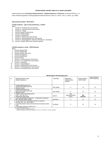 WYNIKI BADAŃ JAKOŚCI WODY DLA MIASTA KNURÓW przeprowadzone przez Powiatową Stację Sanitarno – Epidemiologiczną w Gliwicach na zlecenie PWiK sp. z o.o celem określenia zgodności z Rozporządzeniem Ministra Zdrowia z dnia 13.11.2015 r. (Dz.U. z 2015 r. poz.1989). Data pobrania próbek : 09.02.2016 r. I Źródło zasilania – ujęcie wody podziemnej „ Kwitek” Rejon : 1. Knurów ul. Wolności plus ulice boczne, 2. Knurów ul. Jęczmienna plus ulice boczne 3. Knurów ul. 1 Maja 4. Knurów Osiedle Fińskie Domki 5. Knurów Osiedle Redyna 6. Knurów ul. Kopalniana 7. Knurów ul. Wilsona plus ulice boczne 8. Knurów ul. Rakoniewskiego plus ulice boczne 9. Knurów ul. Niepodległości ( odcinek od Ronda do ul. Szpitalnej 10. Knurów Osiedle 1000 Lecia ( budynki wysokie) II Źródło zasilania w wodę – GPW Katowice Rejon : 1. Knurów Osiedle WPII 2. Knurów Osiedle WPI 3. Knurów Osiedle 1000- lecia 4. Osiedle Szczygłowice 5. Knurów Farskie Pola 6. Knurów Kolonia 7. Knurów ul. Dworcowa plus ulice boczne 8. Knurów ul. ks. Koziełka plus ulice boczne 9. Knurów ul. Szpitalna 10. Knurów ul. Niepodległości 11. Knurów ul. Rybnicka plus ulice boczne 12. Knurów ul. Michalskiego plus ulice boczne 13. Knurów ul. Zwycięstwa plus ulice boczne Wyniki badań mikrobiologicznych Lp. 1. 2. 3. 4. 5. Wskaźnik jakości wody Metoda badawcza Liczba bakterii grupy coli PN-EN ISO 9308-2:2014-06 Metoda Colilert Liczba Escherichia coli PN-EN ISO 9308-2:2014-06 Metoda Colilert Ogólna liczba mikroorganizmów w 22 +_20 C po 72 h PN-EN ISO 6222:2004 Liczba paciorkowców kałowych – enterokoków kałowych PN – EN ISO 7899- 2:2004 Liczba Clostridium perfringens łącznie ze sporami Roz.Min.Zdr. z dn. 29.03.2007 r. w sprawie jakości wody przeznaczonej do spożycia przez ludzi ( Dz.U.nr61, poz.417 z późn.zm.)** Jednostka NPL/100ml Najwyższa dopuszczalna wartość Wynik badania SUW Kwitek Wynik badania GPW Katowice 0 0 0 0 0 0 bez nieprawidłowych zmian Nie wykryto* 0 jtk/100ml 0 0 0 jkt/100ml 0 0 0 NPL/100ml jtk/1ml jtk – jednostki tworzące kolonie *- uzyskano wynik bez nieprawidłowych zmian ** - Metoda jest zgodna z określoną w Roz.Min.Zdr. z dnia 13.11.2015( Dz.U. z 2015r. poz.1989) 1 Wyniki badań fizykochemicznych Lp. 1. 2. 3. 4. 5. 6. 7. 8. 9. 10. 11. 12. 13. 14. 15. Parametry i wskaźniki Metoda badawcza Mętność PN-EN ISO 7027:2003 Barwa PN- EN ISO 7887:2012 Zapach N PN-72/C04557(norma nieaktualna) Smak N PN-72/C04557(norma nieaktualna) Stężenie jonów wodoru (pH) PN-EN ISO 10523:2012 Przewodność właściwa w 25 0 C PN-EN 27888:1999 Twardość ogólna PN ISO 6059:1999 Jon amonowy L/BŚ-PB-01 wyd.6:08.06.2012 Test Spectroquant nr 14752 Merck Azotyny L/BŚ-03 wyd.5:08.06.2012 Test Spectroquant nr 14776 Merck Azotany PN-82/C-04576/08 (norma nieaktualna) Chlorki PN-ISO 9297:1994 Żelazo L/BŚ-PB-04 wyd.6:08.06.2012 Test Spectroquant nr 14761 Merck Mangan L/BŚ-PB-05 wyd.6:08.06.2012 Test Spectroquant nr 14770 Merck Glin* L/BŚ-PB-017 wyd2:02.02.2012 Test Spectroquant nr 14825 Merck Chlor wolny Test Spectroquant nr 100598 Merck Jednostka NTU Dopuszczalne zakresy wartości 1 mg/l Pt Wynik badania SUW Kwitek Wynik badania GPW Katowice 0,26 0,38 5 5 - akceptowalny akceptowalny akceptowalny - akceptowalny akceptowalny akceptowalny - 6,5-9,5 7,3 temperatura pomiaru 12,20 C 7,5 temperatura pomiaru 9,40 C uS/cm 2500 532 170 mg/ lCaCO3 60 - 500 357 99 mg/l 0,50 < 0,10 < 0,10 mg/l 0,10 < 0,05 < 0,05 mg/l 50 < 1,0 3,6 mg/l 250 34 13 ug/l 200 <70 78 ug/l 50 <40 <40 ug/l 200 <60 <60 mg/1 0,3 0,1 <0,1 *oznaczenie odpowiada aluminium z Roz.Min.Zdr. z dnia 13.11.2015(Dz.U. z dnia 2015 r.poz.1989) 2