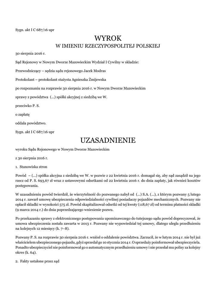Sygn. akt I C 687/16 upr WYROK W IMIENIU RZECZYPOSPOLITEJ POLSKIEJ 30 sierpnia 2016 r. Sąd Rejonowy w Nowym Dworze Mazowieckim Wydział I Cywilny w składzie: Przewodniczący – sędzia sądu rejonowego Jacek Modras Protokolant – protokolant stażysta Agnieszka Żmijewska po rozpoznaniu na rozprawie 30 sierpnia 2016 r. w Nowym Dworze Mazowieckim sprawy z powództwa (...) spółki akcyjnej z siedzibą we W. przeciwko P. S. o zapłatę oddala powództwo. Sygn. akt I C 687/16 upr UZASADNIENIE wyroku Sądu Rejonowego w Nowym Dworze Mazowieckim z 30 sierpnia 2016 r. 1. Stanowiska stron Powód – (...) spółka akcyjna z siedzibą we W. w pozwie z 22 kwietnia 2016 r. domagał się, aby sąd zasądził na jego rzecz od P. S. 693,67 zł wraz z ustawowymi odsetkami od 22 kwietnia 2016 r. do dnia zapłaty, jak również kosztów postępowania. W uzasadnieniu powód twierdził, że wierzytelność do pozwanego nabył od (...) S.A. (...), z którym pozwany 5 lutego 2014 r. zawarł umowę ubezpieczenia odpowiedzialności cywilnej posiadaczy pojazdów mechanicznych. Pozwany nie opłacił składki w wysokości 575 zł. Powód skapitalizował odsetki od tej kwoty (118,67 zł) od terminu płatności składki (9 marca 2014 r.) do dnia poprzedzającego wniesienie pozwu. Po przekazaniu sprawy z elektronicznego postępowania upominawczego do tutejszego sądu powód doprecyzował, że umowa ubezpieczenia została zawarta w 2013 r. Pozwany nie wypowiedział tej umowy, dlatego uległa przedłużeniu na kolejnych 12 miesięcy (k. 7–8). Pozwany P. S. na rozprawie 30 sierpnia 2016 r. wniósł o oddalenie powództwa. Zarzucił, że w lutym 2014 r. nie był już właścicielem ubezpieczonego pojazdu, gdyż sprzedał go 10 stycznia 2014 r. O sprzedaży poinformował ubezpieczyciela. Ponadto ubezpieczyciel nie poinformował go o automatycznym przedłużeniu umowy i nie przesłał mu polisy za kolejny okres (k. 64). 2. Fakty ustalone przez sąd Nie było sporu między stronami (art. 229 i 230 k.p.c.), że P. S. zawarł z (...) S.A. (...) umowę ubezpieczenia odpowiedzialności cywilnej posiadaczy pojazdów mechanicznych na okres od 23 stycznia 2013 r. do 23 stycznia 2014 r., o treści jak na k. 9. Umowa dotyczyła pojazdu marki R. o numerze rej. (...). Pozwany nie przeczył również, że powód zawarł ze wspomnianym towarzystwem ubezpieczeń umowę cesji wierzytelności, która objęła m.in. wierzytelność z tytułu składki za okres od 24 stycznia 2014 r. do 23 stycznia 2015 r. Sąd ustalił, że 10 stycznia 2014 r. P. S. sprzedał wspomniany wyżej samochód (dowód: umowa kupna-sprzedaży k. 59–60). 13 stycznia 2014 r. pozwany przez pocztę elektroniczną spytał ubezpieczyciela, czy powinien zgłosić sprzedaż. Działająca w imieniu ubezpieczyciela K. W. dzień później poprosiła pozwanego o kopię umowy i poinformowała, że po przesłaniu kopii sprzedaż zostanie zarejestrowana w systemie ubezpieczyciela. 16 stycznia 2014 r. pozwany przesłał zeskanowaną umowę (dowód: wydruk korespondencji elektronicznej k. 61–62). 5 lutego 2014 r. ubezpieczyciel sporządził pismo informujące o przedłużeniu umowy ubezpieczenia na kolejnych 12 miesięcy oraz polisę obejmującą okres od 24 stycznia 2014 r. do 23 stycznia 2015 r. (dowód: pismo k. 11, polisa k. 12). Powyższe okoliczności sąd ustalił na podstawie dokumentów przedłożonych przez strony oraz wydruku korespondencji elektronicznej (e-mail). Żadnemu z tych dowodów sąd nie odmówił mocy dowodowej, co w świetle art. 328 § 2 k.p.c. nie wymaga dalszego uzasadnienia. Powód dobrowolnie zrezygnował w uczestnictwa w rozprawie 30 sierpnia 2016 r., a tym samym z możliwości zajęcia krytycznego stanowiska co do zaoferowanych przez pozwanego dowodów. Należy zaznaczyć, że pismo informujące o przedłużeniu umowy i polisa mogły być dowodem na ich wystawienie, natomiast powód nie zaoferował żadnego dowodu na to, że zostały one wysłane (nie mówiąc już o doręczeniu) pozwanemu. 3. Podstawa prawna wyroku Przez umowę ubezpieczenia ubezpieczyciel zobowiązuje się, w zakresie działalności swego przedsiębiorstwa, spełnić określone świadczenie w razie zajścia przewidzianego w umowie wypadku, a ubezpieczający zobowiązuje się zapłacić składkę (art. 805 § 1 k.c.). Umowa ubezpieczenia odpowiedzialności cywilnej (OC) posiadaczy pojazdów mechanicznych rządzi się częściowo odrębnymi regułami. Jedną z charakterystycznych cech takiej umowy jest jej automatyczne przedłużenie. Jeżeli posiadacz pojazdu mechanicznego nie później niż na jeden dzień przed upływem okresu 12 miesięcy, na który umowa ubezpieczenia OC posiadaczy pojazdów mechanicznych została zawarta, nie powiadomi na piśmie zakładu ubezpieczeń o jej wypowiedzeniu, uważa się, że została zawarta następna umowa na kolejne 12 miesięcy (art. 28 ust. 1 ustawy z 22 maja 2003 r. o ubezpieczeniach obowiązkowych, Ubezpieczeniowym Funduszu Gwarancyjnym i Polskim Biurze Ubezpieczycieli Komunikacyjnych, t.j.: Dz. U. z 2013 r., poz. 392 ze zm., dalej jako „u.u.o.”). W tej sprawie wypowiedzenie umowy z 2013 r. nie zostało udowodnione. Pozwany udowodnił jednak, że przed upływem okresu, na jaki umowa została pierwotnie zawarta, sprzedał ubezpieczony pojazd. W razie przejścia lub przeniesienia prawa własności pojazdu mechanicznego, którego posiadacz zawarł umowę ubezpieczenia OC posiadaczy pojazdów mechanicznych, na posiadacza pojazdu, na którego przeszło lub zostało przeniesione prawo własności, przechodzą prawa i obowiązki poprzedniego posiadacza wynikające z tej umowy, a art. 28 u.u.o. nie stosuje się (art. 31 ust. 1 u.u.o.). Posiadacz pojazdu mechanicznego, który przeniósł prawo własności tego pojazdu, jest obowiązany do powiadomienia na piśmie zakładu ubezpieczeń, w terminie 14 dni od dnia przeniesienia prawa własności pojazdu, o fakcie przeniesienia prawa własności tego pojazdu i o danych posiadacza, na któreg