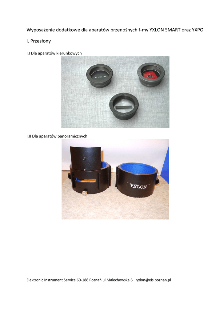 Wyposażenie dodatkowe dla aparatów przenośnych f-my YXLON SMART oraz YXPO I. Przesłony I.I Dla aparatów kierunkowych I.II Dla aparatów panoramicznych Elektronic Instrument Service 60-188 Poznao ul.Malechowska 6 [email protected] II. Opakowanie transportowe lotnicze (mieści się cały kompletny aparat) III. Centrownik laserowy (tylko dla rodziny aparatów SMART) Elektronic Instrument Service 60-188 Poznao ul.Malechowska 6 [email protected] IV. Statywy IV.I Statyw lekki czworonożny (każda noga osobno regulowana) Elektronic Instrument Service 60-188 Poznao ul.Malechowska 6 [email protected] IV.II Statyw lekki czworonożny jezdny Elektronic Instrument Service 60-188 Poznao ul.Malechowska 6 [email protected] IV.III Statyw trójnożny (wysokośd podnoszenia do 2,5m) Elektronic Instrument Service 60-188 Poznao ul.Malechowska 6 [email protected]