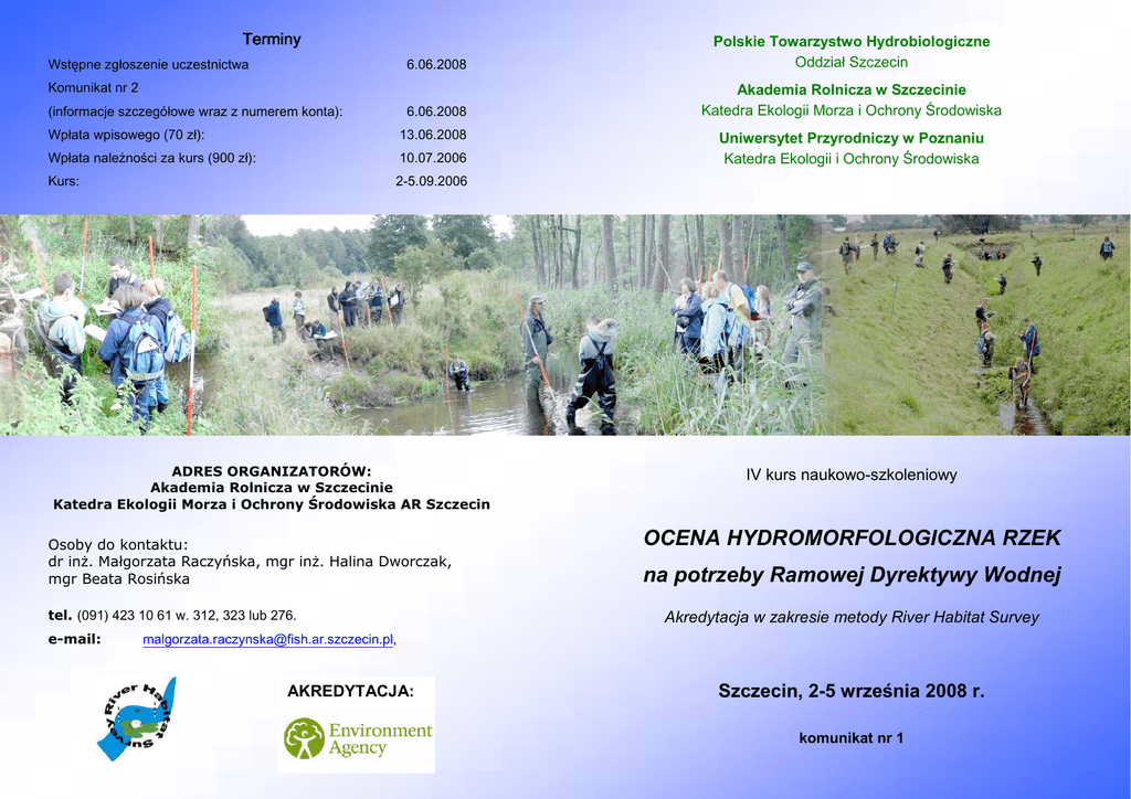 Terminy Wstępne zgłoszenie uczestnictwa 6.06.2008 Polskie Towarzystwo Hydrobiologiczne Oddział Szczecin 6.06.2008 Akademia Rolnicza w Szczecinie Katedra Ekologii Morza i Ochrony Środowiska Komunikat nr 2 (informacje szczegółowe wraz z numerem konta): Wpłata wpisowego (70 zł): 13.06.2008 Wpłata należności za kurs (900 zł): 10.07.2006 Kurs: 2-5.09.2006 ADRES ORGANIZATORÓW: Akademia Rolnicza w Szczecinie Katedra Ekologii Morza i Ochrony Środowiska AR Szczecin Osoby do kontaktu: dr inŜ. Małgorzata Raczyńska, mgr inŜ. Halina Dworczak, mgr Beata Rosińska tel. (091) 423 10 61 w. 312, 323 lub 276. e-mail: Uniwersytet Przyrodniczy w Poznaniu Katedra Ekologii i Ochrony Środowiska IV kurs naukowo-szkoleniowy OCENA HYDROMORFOLOGICZNA RZEK na potrzeby Ramowej Dyrektywy Wodnej Akredytacja w zakresie metody River Habitat Survey [email protected], AKREDYTACJA: Szczecin, 2-5 września 2008 r. komunikat nr 1 Ocena parametrów hydromorfologicznych rzek jest wymagana przez Ramową Dyrektywę Wodną, która wdraŜana jest obecnie w całej Unii Europejskiej. Zasadniczym elementem programu kursu jest szkolenie w zakresie angielskiej metody River Habitat Survey ale uwzględniono takŜe prezentację niemieckiej metody waloryzacji hydromorfologicznej. WYKŁADOWCY: Dr Francis Hugh Dawson (Centre of Ecology and Hydrology, Wielka Brytania) Dr Paul Raven (Environmental Agency, Wielka Brytania) Dr Andreas Müller (Chromgruen Planungs- und Beratungs- GmbH & Co, Niemcy). Kadra Uniwersytetu Przyrodniczego w Poznaniu i Akademii Rolniczej w Szczecinie Oprócz problemów metodycznych, przedstawione zostaną zagadnienia realizacji monitoringu państwowego w zakresie hydromorfologii w Wielkiej Brytanii i Niemczech. Prezentowane Ramowy program szkolenia będą teŜ wyniki oceny hydromorfologicznej przeprowadzonej na 600 odcinkach rzecznych reprezentujących róŜne typy rzek na obszarze całej Polski. System River Habitat Survey (RHS) jest jednym z najwaŜniejszych systemów waloryzacji hydromorfologicznej rzek, jaki rozwinął się w ostatnich latach w Europie. Wykorzystywany jest on na szeroką skalę od początku lat 90-tych w Wielkiej Brytanii, gdzie sprawdził się jako precyzyjny, łatwy we wdroŜeniu i stosunkowo niedrogi. System został Wtorek - 2 września Odbiór uczestników przy dworcu PKP (godzina 17.00) Rejestracja uczestników (17.00-18.00) Otwarcie kursu (Malgorzata Raczyńska i Beata Rosińska) Wprowadzenie do metody River Habitat Survey i realizacja hydromorfologicznego w praktyce (Paul Raven) Zasady wypełniania formularza RHS - część 1 (Krzysztof Szoszkiewicz) monitoringu zaadaptowany w róŜnych krajach, gdzie jest wykorzystywany na potrzeby Ramowej Dyrektywy Wodnej. System ten jest teŜ podstawą morfologicznej oceny cieków w licznych przedsięwzięciach międzynarodowych i znalazł zastosowanie w róŜnego typu badaniach hydrobiologicznych, ekologicznych, fizjograficznych i przy renaturyzacji rzek. Kurs realizowany jest w porozumieniu z Environmental Agency (Wielka Brytania). Zajęcia będą prowadzone pod kierunkiem wybitnych specjalistów w dziedzinie hydromorfologii i ekologii rzek z Centre for Ecology and Hydrology (Wielka Brytania), Environment Agency (Wielka Brytania) oraz Chromgruen Planungs- und BeratungsGmbH & Co (Niemcy). W zajęciach będzie równieŜ uczestniczyć kadra Katedry Ekologii i Ochrony Środowiska Uniwersytetu Przyrodniczego w Poznaniu oraz Katedry Ekologii Morza i Ochrony Środowiska Akademii Rolniczej w Szczecinie, posiadająca wieloletnie doświadczenie w zakresie waloryzacji hydromorfologicznej rzek i legitymująca się aktualnymi akredytacjami RHS wydanymi przez Environmental Agency. Na kursie przedstawiona zostanie wersja polska metody RHS. Wykłady ekspertów zagranicznych będą tłumaczone. Kurs realizowany będzie na terenie województwa zachodniopomorskiego. Zapewniamy transport autokarowy na zajęcia w terenie. Ukończenie kursu pozwoli ich uczestnikom na: zdobycie wiedzy w dziedzinie metod waloryzacji hydromorfologicznej rzek stosowanych Środa - 3 września Badania hydrobiologiczne Pomorza Zachodniego (Juliusz C.Chojnacki) Zastosowanie metody RHS w praktyce (Francis Hugh Dawson) Zasady wypełniania formularza RHS - część 2 (Tomasz Zgoła) Prezentacja metody w terenie Wieczór przy ognisku Czwartek - 4 września Zastosowanie metody RHS w ocenie rzek na potrzeby Ramowej Dyrektywy Wodnej i do celów naukowo-badawczych. Wyniki badań prowadzonych w Polsce (Szymon Jusik) Niemiecka metoda oceny hydromorfologicznej rzek (Andreas Müller) Organizacja i zakres monitoringu hydromorfologicznego w Niemczech (Andreas Müller) Zajęcia kameralne Prezentacja metody w terenie. Piątek - 5 września Konsultacje i dyskusja Samodzielne wykonanie badań w terenie Test akredytacyjny – część pisemna Przejazd autokarem do Szczecina (dworzec PKP) Kurs odbywać się będzie w miejscowości Pniewo k.Gryfina (30 km od Szczecina). Koszt kursu wynosi 970 zł od osoby (w tym 70 zł opłata wpisowa). w Wielkiej Brytanii i Niemczech i ich zastosowaniu w monitoringu zdobycie umiejętności z zakresie prowadzenia oceny jakości rzek w oparciu o River Habitat Survey. Uzyskanie certyfikatu uczestnictwa w kursie i po pozytywnym zdaniu egzaminu końcowego akredytacji ‘RHS Competent Surveyor (Poland)’, potwierdzoną przez Environmental Agency – koordynatora RHS na świecie. Opłata obejmuje: 3 noclegi, całodzienne wyŜywienie, dowóz na trasie Szczecin (dworzec PKP)-Pniewo w pierwszym dniu kursu i w ostatnim Pniewo-Szczecin (dworzec PKP), uczestnictwo w kursie, wyjazdy terenowe, konsultacje indywidualne, materiały (w tym podręcznik terenowy RHS), certyfikat uczestnictwa i akredytacja (po zdaniu egzaminu), uroczystą kolację.