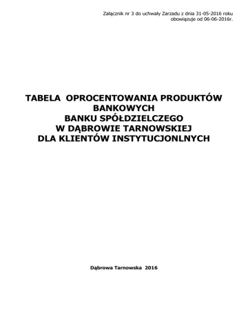 Załącznik nr 3 do uchwały Zarzadu z dnia 31-05-2016 roku obowiązuje od 06-06-2016r. TABELA OPROCENTOWANIA PRODUKTÓW BANKOWYCH BANKU SPÓŁDZIELCZEGO W DĄBROWIE TARNOWSKIEJ DLA KLIENTÓW INSTYTUCJONLNYCH Dąbrowa Tarnowska 2016 Spis treści: I. Rachunki Tab. 1 rachunki podmioty prowadzące działalność gospodarczą ………………………………………………….3 Tab.2 rachunki podmioty prowadzące działalność rolnicza ………………………………………………………….3 II . LOKATY TAB. 3 Lokaty dla podmiotów prowadzących działalność gospodarczą PzStandard……………………………………..…. 4 Tab. 4 Lokaty osób prowadzących działalność rolniczą RiStandard……………………………………………….. 4 Tab. 5 Lokaty progresywne dla osób prowadzących działalność rolniczą …………..……………………….. 4 II. Kredyty Tab. 6 Kredyty dla podmiotów prowadzących działalność gospodarczą ............................................................. 5 TAB. 7 Kredyty dla rolników indywidualnych …………………………………………………………………………………………….. 5 TAB. 8 Kredyty dla jednostek budżetowych ..................................................................................................... 6 Tab. 9 Oprocentowanie karne …………………………………………………………………………………………… 6 Tab. 10 Kredyty preferencyjne ……………………………………………………………………………………………7 Tab. 1 Rachunki podmioty prowadzące działalność gospodarczą : spółki , spółdzielnie , przedsiębiorcy indywidualni, instytucje niekomercyjne działające na rzecz gospodarstw domowych Lp. Rodzaj rachunku 1. Rachunek bieżący 2. Rachunek pomocniczy Stawka oprocentowania* Zmienne 0.05% 0.05% *oprocentowanie liczone w stosunku rocznym Tab. 2 Rachunki podmioty prowadzące działalność rolniczą Lp. Rodzaj rachunku 1. Rachunek bieżący 2. Rachunek pomocniczy *oprocentowanie liczone w stosunku rocznym Stawka oprocentowania* Zmienne 0.05% 0.05% Tab. 3 Lokaty PzStandard Oprocentowanie obowiązuje od dnia 31-07-2016 roku Lp. Rodzaj lokaty Wysokość oprocentowanie* Zmienne Kwota do 5 000.00 zł. Kwota pow. 5 000.00 zł. 1 1 miesięczna 0.30 % 0.30 % 2 2 miesięczna 0.40 % 0,40 % 3 3 miesięczna 0.40 % 0,70 % 4 4 miesięczna 0.50 % 0,80 % 5 6 miesięczna 0.50 % 0,80 % 6 9 miesięczna 0.60 % 0.90 % 7 12 miesięczna 0,80 % 1,10 % 8 24 miesięczna 1,10 % 1,40 % 9 36 miesięczna 1,30 % 1,60 % 10 60 miesięczna 1,40 % 1,70 % *Kapitalizacja następuje po upływie okresu zadeklarowanego , oprocentowanie liczone w stosunku rocznym , lokaty odnawialne Tab. 4 Lokaty RiStandard Oprocentowanie obowiązuje od dnia 31-07-2016 roku Lp. Rodzaj lokaty Wysokość oprocentowanie* Zmienne Kwota do 5 000.00 zł. Kwota pow. 5 000.00 zł. 1 1 miesięczna 0.30 % 0.30 % 2 2 miesięczna 0.40 % 0,40 % 3 3 miesięczna 0.40 % 0,70 % 4 4 miesięczna 0.50 % 0,80 % 5 6 miesięczna 0.50 % 0,80 % 6 9 miesięczna 0.60 % 0.90 % 7 12 miesięczna 0,80 % 1,10 % 8 24 miesięczna 1,10 % 1,40 % 9 36 miesięczna 1,30 % 1,60 % 10 60 miesięczna 1,40 % 1,70 % *Kapitalizacja następuje po upływie okresu zadeklarowanego , oprocentowanie liczone w stosunku rocznym , lokaty odnawialne Tab. 5 Lokaty progresywne dla rolników indywidualnych – otwarta do 20-01-2013 r. ---------------------------------------------------------------------------------------------------------------------- Tab. 6 Kredyty dla podmiotów prowadzących działalność gospodarczą : spółki , spółdzielnie , przedsiębiorcy indywidualni, instytucje niekomercyjne działające na rzecz gospodarstw domowych Rodzaj Kredytu 1. 2 2.1 2.2 3 4 5 6 7 8 9 Oprocentowanie wg stawek bankowych 1) Kredyt obrotowy w rachunku bieżącym Od 10% Kredyt obrotowy w rachunku kredytowym Kredyt na okres do 1 roku Od 9.9% Kredyt na okres powyżej 1 roku Od 10% Kredyt płatniczy WIBOR1M/3M3) + marża2) Od 9% Pożyczka Od 10% Kredyty inwestycyjne Od 10% Kredyty na finansowanie nieruchomości Kredytowa linia hipoteczna Kredyt pomostowy Oprocentowanie wg stawek WIBOR 2) 4)5) 4)5) Od 8 % Od 8% 4)5) Od 8 % 4)5) Kredyt termo modernizacyjny Od 7.5% 1)oprocentowanie wg zmiennej stopy procentowej ustalanej decyzja Zarządu Banku , oprocentowanie liczone w stosunku rocznym 2)marża uzależniona jest od udziału środków własnych , stosunku kredytu do wartości nieruchomości , kwoty kredytu oraz sytuacji finansowej kredytobiorcy 3)Stawka WIBOR 3M - obliczona jako średnia arytmetyczna z miesiąca poprzedzającego okres jej obowiązywania, ustalana na okresy lub 3 miesięczne odpowiadające kwartałom kalendarzowym lub 1 miesięczne Stawka WIBOR 1M - obliczona jako średnia arytmetyczna z miesiąca poprzedzającego okres jej obowiązywania, ustalana na okresy 1 miesięczne odpowiadające miesiącom kalendarzowym 4) dla kredytów zabezpieczonych hipotecznie w przypadku nie przedstawienia zabezpieczenia przejściowego oprocentowanie podwyższa się o 1 % do dnia dokonania prawomocnego wpisu hipoteki na rzecz Banku 5) dla kredytów zabezpieczonych hipotecznie do czasu gdy saldo kredytu osiągnie 80 % wartości nieruchomości będącej zabezpieczeniem oprocentowanie kredytu zostaje podwyższone o 1 % Tab. 7 Kredyty dla podmiotów prowadzących działalność rolniczą Rodzaj Kredytu 1. 2 2.1 2.2 3 5 5.1 5.2 6 7 8 9 Oprocentowanie wg stawek bankowych 1) Kredyt obrotowy w rachunku bieżącym Od 10% Kredyt obrotowy w rachunku kredytowym Oprocentowanie wg stawek WIBOR 2) xxxxxxxxxxxxxxxxxxxxxxxxxxxxxxxxx xxxxxxxxxxxxxxxxxxxxxxxxxxxxxxxxx Kredyt na okres do 1 roku Od 10% xxxxxxxxxxxxxxxxxxxxxxxxxxxxxxxxx Kredyt na okres powyżej 1 roku Od 10% xxxxxxxxxxxxxxxxxxxxxxxxxxxxxxxxx Pożyczka Od 10% Kredyty inwestycyjne Okres kredytowania do 1 roku Od 10% Okres kredytowania ponad 1 rok Kredyty na finansowanie n