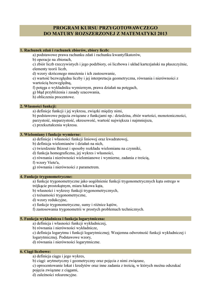PROGRAM KURSU PRZYGOTOWAWCZEGO DO MATURY ROZSZERZONEJ Z MATEMATYKI 2013 1. Rachunek zdań i rachunek zbiorów, zbiory liczb: a) podstawowe prawa rachunku zdań i rachunku kwantyfikatorów, b) operacje na zbiorach, c) zbiór liczb rzeczywistych i jego podzbiory, oś liczbowa i układ kartezjański na płaszczyźnie, elementy teorii liczb, d) wzory skróconego mnożenia i ich zastosowanie, e) wartość bezwzględna liczby i jej interpretacja geometryczna, równania i nierówności z wartością bezwzględną, f) potęga o wykładniku wymiernym, prawa działań na potęgach, g) błąd przybliżenia i zasady szacowania, h) obliczenia procentowe. 2. Własności funkcji: a) definicje funkcji i jej wykresu, związki między nimi, b) podstawowe pojęcia związane z funkcjami np.: dziedzina, zbiór wartości, monotoniczności, parzystość, nieparzystość, okresowość, wartość największa i najmniejsza, c) przekształcenia wykresu. 3. Wielomiany i funkcje wymierne: a) definicje i własności funkcji liniowej oraz kwadratowej, b) definicja wielomianów i działań na nich, c) twierdzenie Bézout i sposoby rozkładu wielomianu na czynniki, d) funkcja homograficzna, jej wykres i własności, e) równania i nierówności wielomianowe i wymierne, zadania z treścią, f) wzory Viete'a, g) równania i nierówności z parametrem. 4. Funkcje trygonometryczne: a) funkcje trygonometryczne jako uogólnienie funkcji trygonometrycznych kąta ostrego w trójkącie prostokątnym, miara łukowa kąta, b) własności i wykresy funkcji trygonometrycznych, c) tożsamości trygonometryczne, d) wzory redukcyjne, e) funkcje trygonometryczne, sumy i różnice kątów, f) zastosowania trygonometrii w prostych problemach technicznych. 5. Funkcja wykładnicza i funkcja logarytmiczna: a) definicja i własności funkcji wykładniczej, b) równania i nierówności wykładnicze, c) definicja logarytmu i funkcji logarytmicznej; Wzajemna odwrotność funkcji wykładniczej i logarytmicznej. Podstawowe wzory, d) równania i nierówności logarytmiczne. 6. Ciągi liczbowe: a) definicja ciągu i jego wykres, b) ciągi: arytmetyczny i geometryczny oraz pojęcia z nimi związane, c) oprocentowanie lokat i kredytów oraz inne zadania z treścią, w których można odszukać pojęcia związane z ciągami, d) zależności rekurencyjne. 6. Planimetria: a) wektory, b) punkty szczególne trójkąta, c) związki miarowe w figurach płaskich, d) izometrie i podobieństwa, e) kąty w okręgu, f) własności czworokątów, okrąg wpisany w czworokąt i opisany na czworokącie, h) twierdzenia sinusów i cosinusów. 7. Geometria analityczna: a) odległość na płaszczyźnie kartezjańskiej, b) okrąg i koło, c) wzajemne położenia prostej i okręgu, pary prostych i pary okręgów na płaszczyźnie; odległości związane z tymi pojęciami, d) rozwiązywanie różnych zagadnień związanych np. z pojęciem dwusiecznej, symetralnej, punktów szczególnych trójkąta oraz różnych typów czworokątów. 8. Stereometria: a) podstawowe bryły geometryczne, ich objętości i pola powierzchni, b) kąt nachylenia prostej do płaszczyzny i kąt dwuścienny, c) związki miarowe w bryłach, zastosowania w problemach technicznych, d) przekroje płaskie, e) wielościany foremne. 9. Rachunek prawdopodobieństwa: a) kombinatoryka, b) pojęcie prawdopodobieństwa i jego własności, c) statystyka opisowa. Opracowała: mgr Bożena Lewandowska