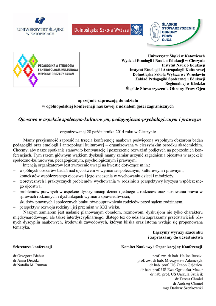 Uniwersytet Śląski w Katowicach Wydział Etnologii i Nauk o Edukacji w Cieszynie Instytut Nauk o Edukacji Instytut Etnologii i Antropologii Kulturowej Dolnośląska Szkoła Wyższa we Wrocławiu Zakład Pedagogiki Społecznej i Edukacji Regionalnej w Kłodzku Śląskie Stowarzyszenie Obrony Praw Ojca uprzejmie zapraszają do udziału w ogólnopolskiej konferencji naukowej z udziałem gości zagranicznych Ojcostwo w aspekcie społeczno-kulturowym, pedagogiczno-psychologicznym i prawnym organizowanej 28 października 2014 roku w Cieszynie Mamy przyjemność zaprosić na trzecią konferencję naukową poświęconą wspólnym obszarom badań pedagogiki oraz etnologii i antropologii kulturowej – organizowaną w cieszyńskim ośrodku akademickim. Chcemy, aby nasze spotkanie stanowiło kontynuację i poszerzenie rozważań podjętych na poprzednich konferencjach. Tym razem głównym wątkiem dyskusji mamy zamiar uczynić zagadnienia ojcostwa w aspekcie społeczno-kulturowym, pedagogicznym, psychologicznym i prawnym. Intencją organizatorów jest zwrócenie uwagi na kwestie dotyczące m.in.: wspólnych obszarów badań nad ojcostwem w wymiarze społecznym, kulturowym i prawnym, kontekstów współczesnego ojcostwa i jego znaczenia w wychowaniu dzieci i młodzieży, teoretycznych i praktycznych problemów wychowania w rodzinie z perspektywy kryzysu współczesnego ojcostwa, problemów prawnych w aspekcie dyskryminacji dzieci i jednego z rodziców oraz stosowania prawa w sprawach rodzinnych i dysfunkcjach wymiaru sprawiedliwości, skutków prawnych i społecznych braku równouprawnienia rodziców przed sądem rodzinnym, perspektyw rozwoju rodziny i jej przemian w XXI wieku. Naszym zamiarem jest nadanie planowanym obradom, rozmowom, dyskusjom nie tylko charakteru międzynarodowego, ale także interdyscyplinarnego, dlatego też do udziału zapraszamy przedstawicieli różnych dyscyplin naukowych, środowisk zawodowych, którym bliska oraz istotna wydaje się proponowana tematyka. Łączymy wyrazy szacunku i zapraszamy do uczestnictwa Sekretarze konferencji dr Grzegorz Błahut dr Anna Drożdż dr Natalia M. Ruman Komitet Naukowy i Organizacyjny Konferencji prof. zw. dr hab. Halina Rusek prof. zw. dr hab. Mieczysław Adamczyk dr hab. prof. UŚ Zenon Gajdzica dr hab. prof. UŚ Ewa Ogrodzka-Mazur dr hab. prof. UŚ Urszula Szuścik dr Teresa Chmiel dr Andrzej Chmiel mgr Dariusz Szenkowski Szanowni Państwo, serdecznie zapraszamy do wzięcia udziału w organizowanej przez nas konferencji: „Ojcostwo w aspekcie społeczno-kulturowym, pedagogiczno-psychologicznym i prawnym”. Jest to już trzecie z kolei spotkanie z cyklu „Pedagogika a etnologia i antropologia kulturowa. Wspólne obszary badań”. Każde poprzednie stanowiło inspirację do działań w kierunku poszerzania jego formuły i zapraszania do dyskusji przedstawicieli pokrewnych dyscyplin nauk społecznych i humanistycznych. Kierując do Państwa to zaproszenie, mamy nadzieję, że dzięki Państwa uczestnictwu uda się spełnić założony interdyscyplinarny i międzynarodowy charakter tego spotkania. Konferencja będzie miała miejsce w październiku, więc jest jeszcze trochę czasu na zapoznanie się z wyznaczonymi poniżej ramami merytorycznymi, które określają tytułowy przedmiot obrad. Jeśli Państwa zainteresuje zaproponowana przez nas problematyka i udział w konferencji, prosimy o zapoznanie się z kwestiami formalnymi, które zawierają załączniki. Wymiar społeczno-kulturowy - wyznaczniki ojcostwa a różnice kulturowe - ojcostwo w różnych systemach pokrewieństwa - ojcostwo jako rola społeczna - stereotypy związane z macierzyństwem i ojcostwem - koncepcje męskości a ojcostwo - obraz ojca w kulturze popularnej - zmiany kulturowe związane z ojcostwem - system organizacji społecznej: od patriarchalnej rodziny do patriarchalnego społeczeństwa - „społeczeństwo bez ojca” - homoseksualizm a ojcostwo Wymiar pedagogiczny - wzorzec ojca rodziny i jego uwarunkowania - rola ojca w procesie wychowania, opieki i edukacji dziecka - współczesne formy życia rodzinnego a problematyka ojcostwa - nieobecność ojca (rozwód, separacja) a rozwój dziecka w rodzinie, - pozycja ojca w rodzinie, jej uwarunkowania i konsekwencje - mężczyzna/ojciec w rodzinie – stereotypy - pedagogiczne wymiary „złego ojcostwa” (ojciec alkoholik, ojciec przestępca, ojciec przemocowy, uległy, nadopiekuńczy, dyrektywny, nadmiernie wymagający) - samotne rodzicielstwo/monoparentalność w kontekście postaw rodzicielskich i stylów wychowania Psychologiczny wymiar ojcostwa - relacja ojciec – syn, ojciec córka w optyce różnych psychologii - psychodiagnostyka rodziny - ekspozycja relacji: mąż – żona, ojciec - dzieci - syn - mąż – ojciec psychologiczne odsłony męskich ról - niezastąpione ojcostwo – specyfika relacji i komunikacji - ojciec – ojczym, psychologia w poszukiwaniu różnicy i podobieństwa - ojciec uzależniony/matka uzależniona, a dynamika rozpadu rodziny - osamotnione ojcostwo, a psychologiczna ekspresja dzieci - dzieci wychowywane bez ojców – profil psychologiczny - mężczyzna w systemie rodzinnym – pozycja, funkcja, dynamika - archetypy ojcostwa Wymiar społeczno-prawny - sytuacja prawna a rzeczywistość - tacierzyństwo - prawa ojca w polskim systemie prawnym - problemy prawne w aspekcie dyskryminacji dzieci i jednego z rodziców oraz stosowania prawa w sprawach rodzinnych - dysfunkcjach wymiaru sprawiedliwości w kwestiach praw rodzicielskich (praw ojca), - skutki prawne i społeczne braku równouprawnienia rodziców przed sądem rodzinnym Praktyczny wymiar ojcostwa -zmagania z rzeczywistością (świadectwa ojców)