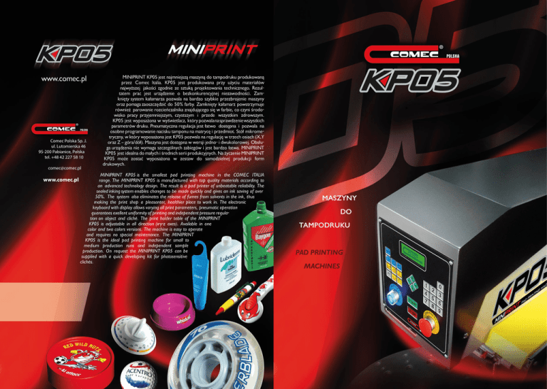 www.comec.pl Comec Polska Sp. J. ul. Lutomierska 46 95-200 Pabianice, Polska tel. +48 42 227 58 10 [email protected] www.comec.pl MINIPRINT KP05 jest najmniejszą maszyną do tampodruku produkowaną przez Comec Italia. KP05 jest produkowana przy użyciu materiałów najwyższej jakości zgodnie ze sztuką projektowania technicznego. Rezultatem prac jest urządzenie o bezkonkurencyjnej niezawodności. Zamknięty system kałamarza pozwala na bardzo szybkie przezbrojenie maszyny oraz pomaga zaoszczędzić do 50% farby. Zamknięty kałamarz powstrzymuje również parowanie rozcieńczalnika znajdującego się w farbie, co czyni środowisko pracy przyjemniejszym, czystszym i przede wszystkim zdrowszym. KP05 jest wyposażona w wyświetlacz, który pozwala na sprawdzenie wszystkich parametrów druku. Pneumatyczna regulacja jest łatwo dostępna i pozwala na osobne programowanie nacisku tamponu na matrycę i przedmiot. Stół mikrometryczny, w który wyposażona jest KP05 pozwala na regulację w trzech osiach (X,Y oraz Z – góra/dół). Maszyna jest dostępna w wersji jedno- i dwukolorowej. Obsługa urządzenia nie wymaga szczególnych zabiegów i jest bardzo łatwa. MINIPRINT KP05 jest idealna do małych i średnich serii produkcyjnych. Na życzenie MINIPRINT KP05 może zostać wyposażona w zestaw do samodzielnej produkcji form drukowych. MINIPRINT KP05 is the smallest pad printing machine in the COMEC ITALIA range. The MINIPRINT KP05 is manufactured with top quality materials according to an advanced technology design. The result is a pad printer of unbeatable reliability. The sealed inking system enables changes to be made quickly and gives an ink saving of over 50%. The system also eliminates the release of fumes from solvents in the ink, thus making the print shop a pleasanter, healthier place to work in. The electronic keyboard with display allows varying all print parameters, pneumatic operation guarantees exellent uniformity of printing and independent pressure regulation on object and cliché. The print holder table of the MINIPRINT KP05 is adjustable in all direction (x-y-z axes). Available in one color and two colors versions. The machine is easy to operate and requires no special maintenance. The MINIPRINT KP05 is the ideal pad printing machine for small to medium production runs and independent sample production. On request the MINIPRINT KP05 can be supplied with a quick developing kit for photosensitive clichés. MASZYNY DO TAMPODRUKU PAD PRINTING MACHINES w w w . c o m e c . p l M A S Z Y N Y D O TA M P O D R U K U PA D P R I N T I N G M A C H I N E S ZAMKNIĘTY KAŁAMARZ CLOSED INKCUP MINIPRINT KP05 pracuje z kałamarzem Ø 90 mm w wersji jednokolorowej oraz z kałamarzami Ø 70 mm w wersji dwukolorowej MINIPRINT KP05 2C RR z hermetycznymi kałamarzami i ceramicznymi pierścieniami Ø 70 mm URZĄDZENIE DO CZYSZCZENIA TAMPONÓW PAD CLEANING DEVICE MINIPRINT KP05 2C RR with hermetic inkcup and ceramic rings Ø 70 mm ELEKTRONICZNA KLAWIATURA ELECTRONIC KEYBOARD MINIPRINT KP05 jest sterowana za pomocą elektronicznej klawiatury kontrolnej The MINIPRINT KP05 is operated via computerized numeric control keyboard MINIPRINT KP05 1C z hermetycznym kałamarzem, pierścieniem ceramicznym Ø 90 mm i stalową podstawą • Na Państwa życzenie modyfikujemy maszyny zgodnie z zamówieniem • We will customize our machines for your individual requirements MINIPRINT KP05 1C with closed inkcup and ceramic ring Ø 90 mm and steel bench 650 mm MINIPRINT KP05 2C RR z hermetycznymi kałamarzami i ceramicznymi pierścieniami Ø 70 mm oraz stołem obrotowym KP05 1 KOLOR KP05 2 COLOR KP05 2 KOLORY KP05 2 COLORS 100×200 mm 80×200 mm 90 mm 2× Ø 70 mm Ø 75 mm Ø 55 mm 160 mm 160 mm 100 mm 100 mm 450 N 450 N 220/110 V 220/110 V 6 bar 6 bar 30 kg 35 kg 550 mm DANE TECHNICZNE – TECHNICAL DATA Wymiary matrycy MINIPRINT KP05 2C RR with hermetic inkcups and ceramic rings Ø 70 mm, with rotary table Clichè dimension Rozmiar kałamarza Closed inkcup dimension Maksymalne pole druku Maximum printing area 950 mm zamkniętego Poziomy ruch tamponu OPCJONALNE PODAJNIKI Horizontal pad stroke OPTTIONAL CONVEYORS Pionowy ruch tamponu Vertical pad stroke T15 (Elektromechaniczny) TRP 160 (Pneumatyczny) 500 mm 550 mm Maksymalna siła nacisku Maximum print thrust STÓŁ OBROTOWY ROTARY TABLE Zasilanie elektryczne Electrical supply Zasilanie pneumatyczne Air pressure supply 160 mm. Waga Weight 110 mm. 700 mm MINIPRINT KP05 works with Ø 90 mm inkcup in one color version and Ø 70 mm in 2 colors