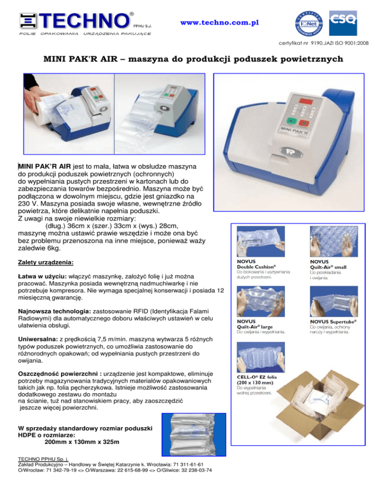 www.techno.com.pl certyfikat nr 9190.JAZI ISO 9001:2008 MINI PAK'R AIR – maszyna do produkcji poduszek powietrznych MINI PAK’R AIR jest to mała, łatwa w obsłudze maszyna do produkcji poduszek powietrznych (ochronnych) do wypełniania pustych przestrzeni w kartonach lub do zabezpieczania towarów bezpośrednio. Maszyna może być podłączona w dowolnym miejscu, gdzie jest gniazdko na 230 V. Maszyna posiada swoje własne, wewnętrzne źródło powietrza, które delikatnie napełnia poduszki. Z uwagi na swoje niewielkie rozmiary: (dług.) 36cm x (szer.) 33cm x (wys.) 28cm, maszynę można ustawić prawie wszędzie i może ona być bez problemu przenoszona na inne miejsce, ponieważ waży zaledwie 6kg. Zalety urządzenia: Łatwa w użyciu: włączyć maszynkę, założyć folię i już można pracować. Maszynka posiada wewnętrzną nadmuchiwarkę i nie potrzebuje kompresora. Nie wymaga specjalnej konserwacji i posiada 12 miesięczną gwarancję. Najnowsza technologia: zastosowanie RFID (Identyfikacja Falami Radiowymi) dla automatycznego doboru właściwych ustawień w celu ułatwienia obsługi. Uniwersalna: z prędkością 7,5 m/min. maszyna wytwarza 5 różnych typów poduszek powietrznych, co umożliwia zastosowanie do różnorodnych opakowań; od wypełniania pustych przestrzeni do owijania. Oszczędność powierzchni : urządzenie jest kompaktowe, eliminuje potrzeby magazynowania tradycyjnych materiałów opakowaniowych takich jak np. folia pęcherzykowa. Istnieje możliwość zastosowania dodatkowego zestawu do montażu na ścianie, tuż nad stanowiskiem pracy, aby zaoszczędzić jeszcze więcej powierzchni. W sprzedaży standardowy rozmiar poduszki HDPE o rozmiarze: 200mm x 130mm x 325m TECHNO PPHU Sp. j. Zakład Produkcyjno – Handlowy w Świętej Katarzynie k. Wrocławia: 71 311-61-61 O/Wrocław: 71 342-79-19 <> O/Warszawa: 22 615-68-99 <> O/Gliwice: 32 238-03-74