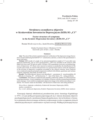 Psychiatria Polska 2010, tom XLIV, numer 1 strony 47–59 Struktura czynnikowa objawów w Krakowskim Inwentarzu Depresyjnym (KID) IO „C1” Factor structure of symptoms in the Kraków Depression Inventory (KID) IO „C1” Renata Modrzejewska, Jacek B o m b a , Andrzej B e a u v a l e Klinika Psychiatrii Dzieci i Młodzieży UJ CM Kierownik: prof. dr hab. n. med. J. Bomba Summary Aim. The aim of this article is partial empirical verification of the depression image theoretical concept underlying the KID IO”C1” construction, and also, a check of the questionnaire’s factor relevancy. Method. KID results of a study of an untreated population sample of 17-year-olds were analysed statistically. Out of 1823 questionnaires, 1349 were included in the analysis (560 filled in by boys and 789 girls by girls). Of these, 499 respondents received a screening diagnosis of depression. 474 sheets were rejected at random to standardise the distribution of the overall scale results. In search of the presence of a general factor and to verify the legitimacy of the division of depressive symptoms according to the clinical criterion, factor analyses were conducted using the principal components method with oblimin, quatrimax and varimax rotations separately and jointly for both sexes. Results. The following new factors were identified: I – pessimism, II – mood instability, III – difficulty in learning, IV – self-destruction, V – fear of the future, VI – eating problems. Conclusions. The analyses conducted only partially confirm the validity of a clinical-picture based questionnaire. A non-compliance of a number of factors with the assumed questionnaire scales emerges. A non-uniform symptomatic depression image in late adolescence phase is confirmed. Two factors stand out decidedly: self-destructive behaviours and eating problems. Słowa klucze: depresja u młodzieży, Krakowski Inwentarz Depresyjny (KID), analizy czynnikowe Key words: adolescent depression, Kraków Depression Inventory (KID), factor analyses Koncepcja depresji młodzieńczej przedstawiona przez Antoniego Kępińskiego w 1974 r. [1] jest próbą powiązania pojawiających się w okresie dorastania objawów psychopatologicznych z przełomem biopsychospołecznym. Jest też krokiem w kierunku wyjaśnienia obserwowanego od dawna zwiększonego ryzyka wystąpienia różnych zaburzeń psychicznych i zachowania w tej fazie rozwoju. Według tej koncepcji kryzys 48 Renata Modrzejewska i wsp. rozwojowy, podobnie jak i inne kryzysy biopsychospołeczne (Kępiński wskazuje ponadto na przełom okołoporodowy i przełom towarzyszący inwolucji), może wiązać się z obecnością objawów depresyjnych. Depresja młodzieńcza w rozumieniu autora koncepcji sama nie powinna być traktowana jako zaburzenie psychiczne. Nie będąc chorobą, wymaga jednak pomocy terapeutycznej, ponieważ jest sygnałem zwiększonych trudności pokonywania przełomu rozwojowego oraz czynnikiem zwiększającym ryzyko zachorowania. Co więcej, depresja młodzieńcza może nakładać się na objawy zaburzeń psychicznych rozpoczynających się w okresie dorastania. Analiza psychopatologiczna obrazu objawów u adolescentów hospitalizowanych w szpitalu psychiatrycznym po raz pierwszy w okresie dorastania [2, 3] dostarczyła empirycznej weryfikacji koncepcji Kępińskiego, stwierdzono bowiem bardzo wysokie wskaźniki rozpowszechnienia syndromu objawów depresyjnych u leczonych osób (94,12%). Obecność depresji nie była zależna od przyczyny hospitalizacji, to znaczy od ustalonego w toku obserwacji rozpoznania nozograficznego zaburzenia. Rozwój i dynamika zaburzeń u osób, u których w trakcie leczenia szpitalnego nie rozpoznawano schizofrenii, zaburzeń jedzenia ani zaburzeń związanych z uszkodzeniem mózgu, śledzone w pięcioletnim okresie katamnestycznym [2], nie były swoiste dla zaburzeń afektywnych. Dalsza empiryczna weryfikacja koncepcji Kępińskiego wymagała badania populacji nie leczonej psychiatrycznie. W tym celu konieczne było uzyskanie narzędzia do przesiewowego badania obecności objawów depresyjnych u dzieci przed okresem pokwitania i w okresie adolescencji. Ponieważ w latach siedemdziesiątych nie było takiego narzędzia, zdecydowano się na jego zbudowanie. Strukturę objawów depresji u dzieci i młodzieży oparto na opisie Kępińskiego i wynikach analizy pracy kliniczno -katamnestycznej. Pozycje inwentarza objawów depresyjnych dostosowano do swoistych form ekspresji psychopatologicznej w poszczególnych fazach rozwoju. Oparto się przy tym na wynikach studiów nad depresją u dzieci i młodzieży publikowanych przez Nissena [4, 5], Poznansky [6], Cytryna i McKnew [7], Albert i Becka [8], Pużyńską [9], Witkowską-Roszkę [10]. Inwentarz objawów opracowano w formie kwestionariusza dla dorastających – we wczesnej, średniej i późnej fazie adolescencji – oraz dla rodziców i opiekunów dzieci w wieku przedszkolnym i młodszym wieku szkolnym. Niskie wskaźniki trafności i rzetelności narzędzia dla dzieci w wieku przedszkolnym (AO „A”) oraz inwentarza, który wypełniały same dzieci w młodszym wieku szkolnym (IO „B”), spowodowały zaniechanie ich dalszego stosowania. Zadowalające wskaźniki uzyskano dla następujących wersji Krakowskiego Inwentarza Depresyjnego (KID): Arkusza Obserwacyjnego AO „B1” – dla dzieci w młodszym wieku szkolnym (7–12 lat), Inwentarza Objawowego IO „B1” – dla młodzieży we wczesnej i średniej fazie dorastania (13–15 lat), Inwentarza Objawowego IO „C1” – dla młodzieży w późnej fazie dorastania (16–19 lat). KID złożony jest z pozycji ujmujących objawy depresji w obszarach wyodrębnionych na podstawie klinicznego opisu depresji u dzieci i młodzieży, w tym – na podstawie analizy taksonomicznej wyników badania klinicznego [3]. Przyporządkowując opisy przeżyć, doznań i zachowań wyodrębnionym obszarom kierowano się teoretycznym założeniem o zwią