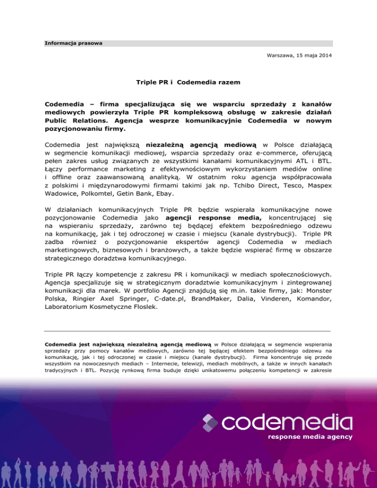 Informacja prasowa Warszawa, 15 maja 2014 Triple PR i Codemedia razem Codemedia – firma specjalizująca się we wsparciu sprzedaży z kanałów mediowych powierzyła Triple PR kompleksową obsługę w zakresie działań Public Relations. Agencja wesprze komunikacyjnie Codemedia w nowym pozycjonowaniu firmy. Codemedia jest największą niezależną agencją mediową w Polsce działającą w segmencie komunikacji mediowej, wsparcia sprzedaży oraz e-commerce, oferującą pełen zakres usług związanych ze wszystkimi kanałami komunikacyjnymi ATL i BTL. Łączy performance marketing z efektywnościowym wykorzystaniem mediów online i offline oraz zaawansowaną analityką. W ostatnim roku agencja współpracowała z polskimi i międzynarodowymi firmami takimi jak np. Tchibo Direct, Tesco, Maspex Wadowice, Polkomtel, Getin Bank, Ebay. W działaniach komunikacyjnych Triple PR będzie wspierała komunikacyjne nowe pozycjonowanie Codemedia jako agencji response media, koncentrującej się na wspieraniu sprzedaży, zarówno tej będącej efektem bezpośredniego odzewu na komunikację, jak i tej odroczonej w czasie i miejscu (kanale dystrybucji). Triple PR zadba również o pozycjonowanie ekspertów agencji Codemedia w mediach marketingowych, biznesowych i branżowych, a także będzie wspierać firmę w obszarze strategicznego doradztwa komunikacyjnego. Triple PR łączy kompetencje z zakresu PR i komunikacji w mediach społecznościowych. Agencja specjalizuje się w strategicznym doradztwie komunikacyjnym i zintegrowanej komunikacji dla marek. W portfolio Agencji znajdują się m.in. takie firmy, jak: Monster Polska, Ringier Axel Springer, C-date.pl, BrandMaker, Dalia, Vinderen, Komandor, Laboratorium Kosmetyczne Floslek. Codemedia jest największą niezależną agencją mediową w Polsce działającą w segmencie wspierania sprzedaży przy pomocy kanałów mediowych, zarówno tej będącej efektem bezpośredniego odzewu na komunikację, jak i tej odroczonej w czasie i miejscu (kanale dystrybucji). Firma koncentruje się przede wszystkim na nowoczesnych mediach – Internecie, telewizji, mediach mobilnych, a także w innych kanałach tradycyjnych i BTL. Pozycję rynkową firma buduje dzięki unikatowemu połączeniu kompetencji w zakresie outsourcingu sprzedaży i marketingu, silnego skorelowania zakupu i planowania mediów z celami sprzedażowymi klientów. Klienci cenią efektywność oraz wysoką jakość prowadzonych działań. W 2013 roku firma współpracowała z ponad 170 klientami, wśród których są takie jak firmy jak Tchibo Direct, Tesco, Maspex Wadowice, Polkomtel, Getin Bank, Ebay i inni. Więcej informacji: codemedia.pl Kontakt dla mediów: Anna Olkowicz Triple PR Pl. Przymierza 6 lok 26 tel. 22 216 54 20, 602 302 913 [email protected]