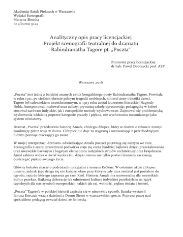 Akademia Sztuk Pięknych w Warszawie Wydział Scenografii Martyna Słomka nr albumu 9125 Analityczny opis pracy licencjackiej Projekt scenografii teatralnej do dramatu Rabindranatha Tagore pt. „Poczta” Promotor pracy licencjackiej: dr hab. Paweł Dobrzycki prof. ASP Warszawa 2016 „Poczta” jest jedną z bardziej znanych sztuk bengalskiego poety Rabindranatha Tagore. Powstała w roku 1911, po ciężkim okresie pełnym tragedii osobistych, śmierci żony i dwójki dzieci. Tagore był człowiekiem wszechstronnym, w 1913 roku został laureatem literackiej Nagrody Nobla, komponował, malował oraz założył prywatną szkołę opracowując pedagogikę w której stosował zarówno indyjskie, jak i europejskie metody wychowawcze. Zajmował się problematyką wychowania widzianą poprzez kategorie prawdy i piękna, nie wychowania rozumianego jako system oświatowy. Dramat „Poczta” przedstawia historię Amala, chorego chłopca, który w obawie o zdrowie zostaje zamknięty przez wuja w domu. Chłopiec nie daje za wygraną i rozmawiając z przechodzącymi ludźmi poznaje otaczający go świat. W mojej interpretacji dramatu, odwiedzające Amala postaci pojawiają się niczym we śnie. Scenografia z szarej przestrzeni podwórka staje się coraz bardziej bajkowa dzięki przeskalowaniu oraz niezwykle barwnym i bogatym elementom indyjskich strojów architektury oraz krajobrazu. Amal zabiera widza w świat wyobraźni, dzięki niemu nie tylko postaci dramatu zaczynają dostrzegać piękno swojego życia. Główny bohater marzy o podróżach i przyjaźni z samym Królem. W ostatnim akcie chłopiec umiera, jednak jego droga się nie kończy, okno przy którym cały czas siedział jest portalem do ogrodu, raju do którego zaprasza go sam Król. Historia Amala ma uniwersalny dla wszystkich kultur przekaz. Bajkową dekorację tak odmiennej kultury indyjskiej przełożyłam na język czytelnych dla nas symboli europejskich, takich jak raj, wolność, piękno świata i śmierć. „Poczta” Tagore’a w polskiej historii zapisała się w niezwykły sposób. Sztukę wystawił Janusz Korczak wraz z dziećmi z Domu Sierot w warszawskim getcie. Poprzez pracę nad spektaklem pedagog oswajał dzieci ze śmiercią.
