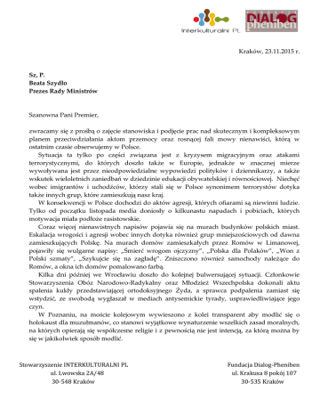 Kraków, 23.11.2015 r. Sz, P. Beata Szydło Prezes Rady Ministrów Szanowna Pani Premier, zwracamy się z prośbą o zajęcie stanowiska i podjęcie prac nad skutecznym i kompleksowym planem przeciwdziałania aktom przemocy oraz rosnącej fali mowy nienawiści, którą w ostatnim czasie obserwujemy w Polsce. Sytuacja ta tylko po części związana jest z kryzysem migracyjnym oraz atakami terrorystycznymi, do których doszło także w Europie, jednakże w znacznej mierze wywoływana jest przez nieodpowiedzialne wypowiedzi polityków i dziennikarzy, a także wskutek wieloletnich zaniedbań w dziedzinie edukacji obywatelskiej i równościowej. Niechęć wobec imigrantów i uchodźców, którzy stali się w Polsce synonimem terrorystów dotyka także innych grup, które zamieszkują nasz kraj. W konsekwencji w Polsce dochodzi do aktów agresji, których ofiarami są niewinni ludzie. Tylko od początku listopada media doniosły o kilkunastu napadach i pobiciach, których motywacja miała podłoże rasistowskie. Coraz więcej nienawistnych napisów pojawia się na murach budynków polskich miast. Eskalacja wrogości i agresji wobec innych dotyka również grup mniejszościowych od dawna zamieszkujących Polskę. Na murach domów zamieszkałych przez Romów w Limanowej, pojawiły się wulgarne napisy: „Śmierć wrogom ojczyzny”, „Polska dla Polaków”, „Won z Polski szmaty”, „Szykujcie się na zagładę”. Zniszczono również samochody należące do Romów, a okna ich domów pomalowano farbą. Kilka dni później we Wrocławiu doszło do kolejnej bulwersującej sytuacji. Członkowie Stowarzyszenia Obóz Narodowo-Radykalny oraz Młodzież Wszechpolska dokonali aktu spalenia kukły przedstawiającej ortodoksyjnego Żyda, a sprawca podpalenia zamiast się wstydzić, ze swobodą wygłaszał w mediach antysemickie tyrady, usprawiedliwiające jego czyn. W Poznaniu, na moście kolejowym wywieszono z kolei transparent aby modlić się o holokaust dla muzułmanów, co stanowi wyjątkowe wynaturzenie wszelkich zasad moralnych, na których opierają się współczesne religie i z pewnością nie jest intencją, za którą można by się w jakikolwiek sposób modlić. Stowarzyszenie INTERKULTURALNI PL ul. Lwowska 2A/48 30-548 Kraków Fundacja Dialog-Pheniben ul. Krakusa 8 pokój 107 30-535 Kraków Nie trzeba przypominać, że zarówno Żydzi jak i Romowie byli ofiarami polityki narodowych socjalistów, co doprowadziło do zamordowania kilku milionów Żydów oraz 70% populacji europejskich Romów. Dziś, niepomni historii sprawcy tych ohydnych aktów agresji i wandalizmu wzywają do eksterminacji ludności muzułmańskiej, która w zdecydowanej większości nie tylko stanowi część społeczności europejskiej i żyje od wieków w pokoju, ale też w przypadku migrantów ucieka przed prześladowaniami i fanatykami, którzy niszczą ich kraje ekonomicznie i fizycznie. Państwo polskie, stojące zawsze na straży najwyższych wartości, a jednocześnie najboleśniej naznaczone przez historię totalitaryzmów światowych musi postawić w sposób zdecydowany tamę zjawisku narastania nienawiści etnicznej, rasowej i religijnej, a sprawców, w których działaniach tego rodzaju pobudki odgrywają rolę sprawczą, należy w sposób szybki, sprawny i przykładny ukarać. Nie należy również zapominać, iż najbardziej skutecznym i trwałym mechanizmem zapobiegania nienawiści rasowej i religijnej jest szeroka, równościowa edukacja obywatelska, o której wprowadzenie do wszelkich szczebli szkół gorąco do Pani Premier apelujemy. Zwracamy się również z prośbą o szybkie powołanie Pełnomocnika Rządu ds. Spraw Równego Traktowania, w którego prerogatywach zawsze znajdowało się dbanie o państwową politykę na rzecz równego traktowania mniejszości narodowych, etnicznych i religijnych i którego Urząd zawsze prowadził skuteczny i owocny dialog z mniejszościami, dając im poczucie bezpieczeństwa i zrozumienia. Z wyrazami szacunku, Joanna Talewicz-Kwiatkowska Prezes Fundacji Dialog-Pheniben Jakub Kościółek Prezes Stowarzyszenia INTERKULTURALNI PL Stowarzyszenie INTERKULTURALNI PL ul. Lwowska 2A/48 30-548 Kraków Fundacja Dialog-Pheniben ul. Krakusa 8 pokój 107 30-535 Kraków