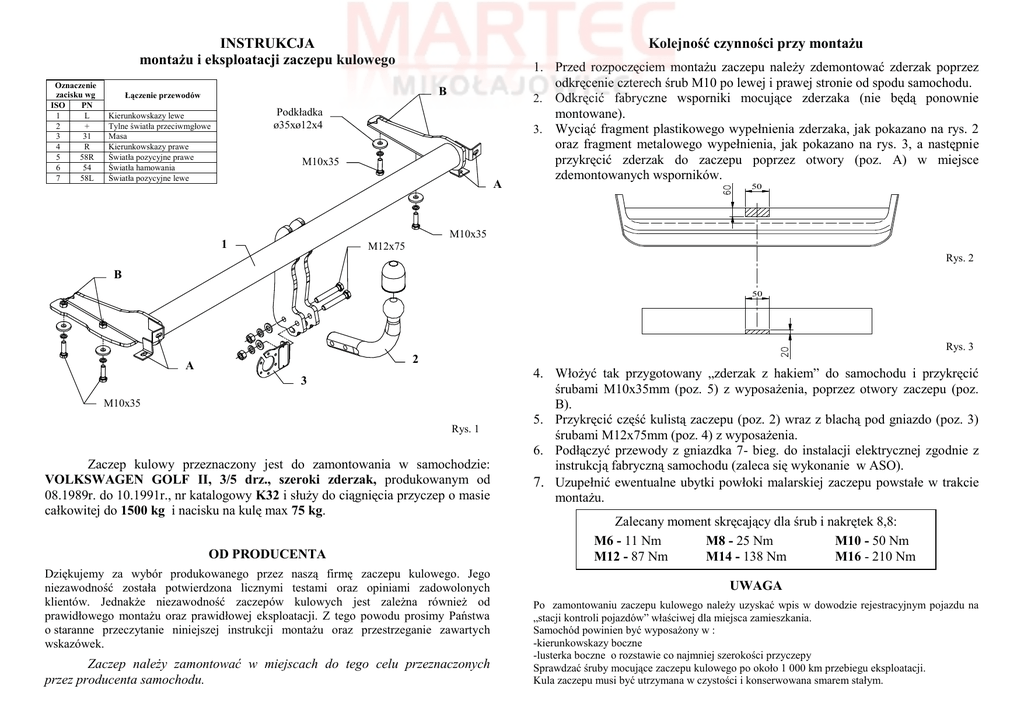 Kolejność czynności przy montażu INSTRUKCJA montażu i eksploatacji zaczepu kulowego Oznaczenie zacisku wg ISO PN 1 L 2 + 3 31 4 R 5 58R 6 54 7 58L B Łączenie przewodów Podkładka ø35xø12x4 Kierunkowskazy lewe Tylne światła przeciwmgłowe Masa Kierunkowskazy prawe Światła pozycyjne prawe Światła hamowania Światła pozycyjne lewe M10x35 A 1. Przed rozpoczęciem montażu zaczepu należy zdemontować zderzak poprzez odkręcenie czterech śrub M10 po lewej i prawej stronie od spodu samochodu. 2. Odkręcić fabryczne wsporniki mocujące zderzaka (nie będą ponownie montowane). 3. Wyciąć fragment plastikowego wypełnienia zderzaka, jak pokazano na rys. 2 oraz fragment metalowego wypełnienia, jak pokazano na rys. 3, a następnie przykręcić zderzak do zaczepu poprzez otwory (poz. A) w miejsce zdemontowanych wsporników. 50 M10x35 1 M12x75 Rys. 2 B 50 Rys. 3 2 A 3 M10x35 Rys. 1 Zaczep kulowy przeznaczony jest do zamontowania w samochodzie: VOLKSWAGEN GOLF II, 3/5 drz., szeroki zderzak, produkowanym od 08.1989r. do 10.1991r., nr katalogowy K32 i służy do ciągnięcia przyczep o masie całkowitej do 1500 kg i nacisku na kulę max 75 kg. OD PRODUCENTA Dziękujemy za wybór produkowanego przez naszą firmę zaczepu kulowego. Jego niezawodność została potwierdzona licznymi testami oraz opiniami zadowolonych klientów. Jednakże niezawodność zaczepów kulowych jest zależna również od prawidłowego montażu oraz prawidłowej eksploatacji. Z tego powodu prosimy Państwa o staranne przeczytanie niniejszej instrukcji montażu oraz przestrzeganie zawartych wskazówek. Zaczep należy zamontować w miejscach do tego celu przeznaczonych przez producenta samochodu. 4. Włożyć tak przygotowany „zderzak z hakiem” do samochodu i przykręcić śrubami M10x35mm (poz. 5) z wyposażenia, poprzez otwory zaczepu (poz. B). 5. Przykręcić część kulistą zaczepu (poz. 2) wraz z blachą pod gniazdo (poz. 3) śrubami M12x75mm (poz. 4) z wyposażenia. 6. Podłączyć przewody z gniazdka 7- bieg. do instalacji elektrycznej zgodnie z instrukcją fabryczną samochodu (zaleca się wykonanie w ASO). 7. Uzupełnić ewentualne ubytki powłoki malarskiej zaczepu powstałe w trakcie montażu. Zalecany moment skręcający dla śrub i nakrętek 8,8: M6 - 11 Nm M8 - 25 Nm M10 - 50 Nm M12 - 87 Nm M14 - 138 Nm M16 - 210 Nm UWAGA Po zamontowaniu zaczepu kulowego należy uzyskać wpis w dowodzie rejestracyjnym pojazdu na „stacji kontroli pojazdów” właściwej dla miejsca zamieszkania. Samochód powinien być wyposażony w : -kierunkowskazy boczne -lusterka boczne o rozstawie co najmniej szerokości przyczepy Sprawdzać śruby mocujące zaczepu kulowego po około 1 000 km przebiegu eksploatacji. Kula zaczepu musi być utrzymana w czystości i konserwowana smarem stałym. PPUH AUTO-HAK Sp.J. Wyposażenie zaczepu: Produkcja Zaczepów Kulowych Henryk & Zbigniew Nejman 76-200 SŁUPSK ul. Słoneczna 16K tel/fax (059) 8-414-414; 8-414-413 e-mail: [email protected] www. autohak.com.pl Zaczep kulowy bez wyposażenia elektrycznego K32 Klasa: A50-X Nr kat. Przeznaczony do zamontowania w samochodzie: Producent: VOLKSWAGEN Model: GOLF II Typ: 3/5 drz., szeroki zderzak Produkowanym od 08.1989r. do 10.1991r. KARTA GWARANCYJNA Dane techniczne: Wartość siły D : 7,6 kN maksymalna masa przyczepy: 1500 kg maksymalny nacisk na kulę: 75 kg Numer homologacji zgodnie z Dyrektywą 94/20/WE: e20*94/20*1346*00 Producent udziela gwarancji niniejszą kartą gwarancyjną na okres 24 miesięcy licząc od dnia zakupu zaczepu kulowego do samochodu: VOLKSWAGEN GOLF II 3/5 drz., szeroki zderzak INFORMACJA WSTĘPNA produkowanego od 08.1989r. do 10.1991r. Zaczep kulowy jest skonstruowany zgodnie z zasadami bezpieczeństwa ruchu drogowego. Zaczep kulowy jest elementem wpływającym na bezpieczeństwo jazdy i może zostać zainstalowany wyłącznie przez personel wyspecjalizowany. Niedopuszczalne jest dokonywanie jakichkolwiek zmian w konstrukcji zaczepu. Powoduje to wygaśniecie dopuszczenia do stosowania. W przypadku obecności masy izolacyjnej lub osłony podwozia w miejscu przylegania zaczepu, należy ją usunąć. Nieosłonięte miejsca karoserii oraz wywiercone otwory należy pomalować farbą antykorozyjną. Informacjami wiążącymi odnośnie wartości obciążeń są dane podawane przez producenta samochodu, względnie wartości maksymalnej masy przyczepy oraz maksymalnego nacisku na kulę, przy czym wartości parametrów zaczepu kulowego nie mogą być przekroczone. Wzór do obliczania wartości siły D: Data produkcji .............................. Data zakupu............................................. Zakres gwarancji obejmuje wyłącznie wady jakościowe wynikające z winy producenta. Gwarancja nie obejmuje natomiast uszkodzeń zawinionych przez nabywcę, wynikających z niewłaściwego montażu, użytkowania lub konserwacji, uszkodzeń mechanicznych, normalnego zużycia podczas eksploatacji itp. Gwarancja udzielona na zakupiony towar nie wyłącza, nie ogranicza ani nie zawiesza uprawnień kupującego wynikających z niezgodności towaru z umową. Reklamacje należy zgłaszać w punkcie sprzedaży, składając jednocześnie kartę gwarancyjną. Usunięcie "wady" następuje po stwierdzeniu przez punkt sprzedaży wspólnie z producentem słuszności złożonej reklamacji. Reklamacja powinna być załatwiona w ciągu 14 dni od dnia uznania reklamacji. Karta gwarancyjna jest nieważna jeżeli nie jest wypełniona i podpisana. Maks. masa przyczepy [kg] x Maks. masa samochodu [kg] Maks. masa przyczepy [kg] + Maks. masa samochodu [kg] Data zgłoszenia reklamacji: ................................................................... X 9,81 = 1000 D [kN]