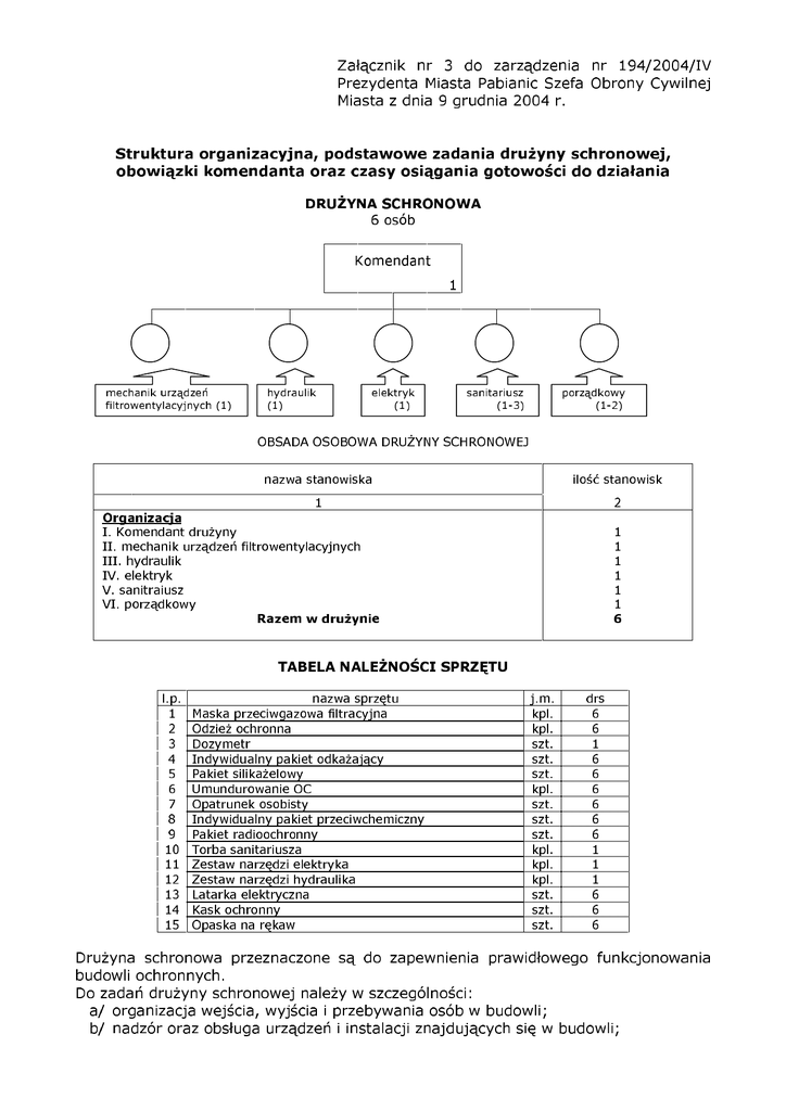 Załącznik nr 3 do zarządzenia nr 194/2004/IV Prezydenta Miasta Pabianic Szefa Obrony Cywilnej Miasta z dnia 9 grudnia 2004 r. Struktura organizacyjna, podstawowe zadania druŜyny schronowej, obowiązki komendanta oraz czasy osiągania gotowości do działania DRUśYNA SCHRONOWA 6 osób Komendant 1 mechanik urządzeń filtrowentylacyjnych (1) hydraulik (1) elektryk (1) sanitariusz (1-3) porządkowy (1-2) OBSADA OSOBOWA DRUśYNY SCHRONOWEJ Organizacja nazwa stanowiska 1 ilość stanowisk 2 I. Komendant druŜyny II. mechanik urządzeń filtrowentylacyjnych III. hydraulik IV. elektryk V. sanitraiusz VI. porządkowy 1 1 1 1 1 1 Razem w druŜynie 6 TABELA NALEśNOŚCI SPRZĘTU l.p. 1 2 3 4 5 6 7 8 9 10 11 12 13 14 15 nazwa sprzętu Maska przeciwgazowa filtracyjna OdzieŜ ochronna Dozymetr Indywidualny pakiet odkaŜający Pakiet silikaŜelowy Umundurowanie OC Opatrunek osobisty Indywidualny pakiet przeciwchemiczny Pakiet radioochronny Torba sanitariusza Zestaw narzędzi elektryka Zestaw narzędzi hydraulika Latarka elektryczna Kask ochronny Opaska na rękaw j.m. kpl. kpl. szt. szt. szt. kpl. szt. szt. szt. kpl. kpl. kpl. szt. szt. szt. drs 6 6 1 6 6 6 6 6 6 1 1 1 6 6 6 DruŜyna schronowa przeznaczone są do zapewnienia prawidłowego funkcjonowania budowli ochronnych. Do zadań druŜyny schronowej naleŜy w szczególności: a/ organizacja wejścia, wyjścia i przebywania osób w budowli; b/ nadzór oraz obsługa urządzeń i instalacji znajdujących się w budowli; c/ zapewnienia warunków bytowych, Ŝywienia oraz pierwszej pomocy chorym i rannym; d/ nadzór nad przestrzeganiem porządku i dyscypliny przez osoby przebywające w budowli; e/ organizowanie szkolenia w zakresie ratownictwa i ochrony przed skaŜeniami; f/ organizowanie i kierowanie akcją ratunkową wewnątrz budowli, a takŜe współdziałanie (w miarę moŜliwości) z jednostkami ratowniczymi działającymi na zewnątrz budowli; g/ utrzymywanie łączności z organami obrony cywilnej, przekazywanie i odbieranie meldunków o aktualnej sytuacji. Komendant formacji obrony cywilnej odpowiada za całokształt spraw związanych z gotowością formacji do wykonywania zadań obrony cywilnej, a w szczególności za organizację, przygotowanie, wyszkolenie i wyposaŜenie formacji. Do podstawowych zadań komendanta formacji naleŜy w szczególności: – zapewnienie stałej gotowości sił i środków formacji obrony cywilnej; – kierowanie podległą formacją w czasie ratowania i udzielania pomocy poszkodowanym; – realizowanie zadań wynikających z planu obrony cywilnej zakładu; – opracowanie dokumentacji formacji oraz jej bieŜące prowadzenie; – organizowanie powiadamiania i alarmowania podległej formacji o niebezpieczeństwie napadów powietrznych i skaŜeń (zakaŜeń); – planowanie i organizowanie szkolenia stanu osobowego formacji oraz współdziałanie w organizowaniu szkolenia załogi zakładu w zakresie powszechnej samoobrony; – nadawanie przydziałów organizacyjno–mobilizacyjnych do słuŜby w formacji; – wykonywanie innych zadań wynikających z odrębnych przepisów lub zleconych przez przełoŜonych. Komendant formacji obrony cywilnej podlega bezpośrednio dyrektorowi zakładu stanowiącego bazę formowania. W stanie stałej gotowości obronnej państwa formacje obrony cywilnej są zobowiązane do utrzymywania stopnia ukompletowania: – stanów osobowych, sprzętu i materiałów oraz wyposaŜenia indywidualnego – nie mniej niŜ 90%; – sprzętu z gospodarki narodowej – nie mniej niŜ 50% w stosunku do etatów i tabel naleŜności; W stanie gotowości obronnej państwa czasu kryzysu lub wojny formacje obrony cywilnej osiągają pełną gotowość do działania przez rozwinięcie w rejonach formowania, wydanie sprzętu i wyposaŜenia członkom formacji oraz osiągnięcie gotowości do wykonania określonych zadań w czasie: – w godzinach pracy 4 – 6 godzin, – po godzinach pracy 8 – 16 godzin. Dla formacji obrony cywilnej opracowuje się plan działania formacji. Plan działania formacji obejmuje: a/ strukturę organizacyjną formacji b/ etat – obsadę osobową c/ wyposaŜenie d/ harmonogram osiągania gotowości do działania e/ plan alarmowania (powiadamiania) członków formacji f/ zadania g/ inne dane wynikające ze specyfiki i przeznaczenia formacji. Plan działania formacji opracowuje się w jednym egzemplarzu, podpisuje go komendant formacji, a zatwierdza dyrektor zakładu. Plan działania przechowuje zakład stanowiący bazę formacji obrony cywilnej.