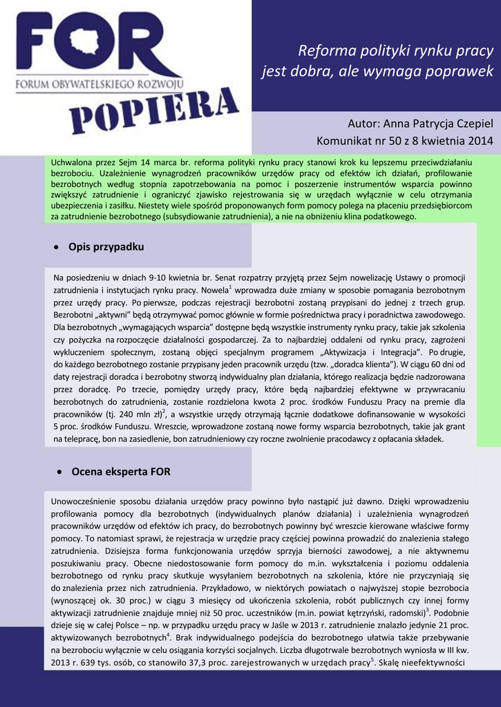 Reforma polityki rynku pracy jest dobra, ale wymaga poprawek Autor: Anna Patrycja Czepiel Komunikat nr 50 z 8 kwietnia 2014 Uchwalona przez Sejm 14 marca br. reforma polityki rynku pracy stanowi krok ku lepszemu przeciwdziałaniu bezrobociu. Uzależnienie wynagrodzeo pracowników urzędów pracy od efektów ich działao, profilowanie bezrobotnych według stopnia zapotrzebowania na pomoc i poszerzenie instrumentów wsparcia powinno zwiększyd zatrudnienie i ograniczyd zjawisko rejestrowania się w urzędach wyłącznie w celu otrzymania ubezpieczenia i zasiłku. Niestety wiele spośród proponowanych form pomocy polega na płaceniu przedsiębiorcom za zatrudnienie bezrobotnego (subsydiowanie zatrudnienia), a nie na obniżeniu klina podatkowego. Opis przypadku Na posiedzeniu w dniach 9-10 kwietnia br. Senat rozpatrzy przyjętą przez Sejm nowelizację Ustawy o promocji zatrudnienia i instytucjach rynku pracy. Nowela1 wprowadza duże zmiany w sposobie pomagania bezrobotnym przez urzędy pracy. Po pierwsze, podczas rejestracji bezrobotni zostaną przypisani do jednej z trzech grup. Bezrobotni „aktywni” będą otrzymywad pomoc głównie w formie pośrednictwa pracy i poradnictwa zawodowego. Dla bezrobotnych „wymagających wsparcia” dostępne będą wszystkie instrumenty rynku pracy, takie jak szkolenia czy pożyczka na rozpoczęcie działalności gospodarczej. Za to najbardziej oddaleni od rynku pracy, zagrożeni wykluczeniem społecznym, zostaną objęci specjalnym programem „Aktywizacja i Integracja”. Po drugie, do każdego bezrobotnego zostanie przypisany jeden pracownik urzędu (tzw. „doradca klienta”). W ciągu 60 dni od daty rejestracji doradca i bezrobotny stworzą indywidualny plan działania, którego realizacja będzie nadzorowana przez doradcę. Po trzecie, pomiędzy urzędy pracy, które będą najbardziej efektywne w przywracaniu bezrobotnych do zatrudnienia, zostanie rozdzielona kwota 2 proc. środków Funduszu Pracy na premie dla pracowników (tj. 240 mln zł)2, a wszystkie urzędy otrzymają łącznie dodatkowe dofinansowanie w wysokości 5 proc. środków Funduszu. Wreszcie, wprowadzone zostaną nowe formy wsparcia bezrobotnych, takie jak grant na telepracę, bon na zasiedlenie, bon zatrudnieniowy czy roczne zwolnienie pracodawcy z opłacania składek. Ocena eksperta FOR Unowocześnienie sposobu działania urzędów pracy powinno było nastąpid już dawno. Dzięki wprowadzeniu profilowania pomocy dla bezrobotnych (indywidualnych planów działania) i uzależnienia wynagrodzeo pracowników urzędów od efektów ich pracy, do bezrobotnych powinny byd wreszcie kierowane właściwe formy pomocy. To natomiast sprawi, że rejestracja w urzędzie pracy częściej powinna prowadzid do znalezienia stałego zatrudnienia. Dzisiejsza forma funkcjonowania urzędów sprzyja bierności zawodowej, a nie aktywnemu poszukiwaniu pracy. Obecne niedostosowanie form pomocy do m.in. wykształcenia i poziomu oddalenia bezrobotnego od rynku pracy skutkuje wysyłaniem bezrobotnych na szkolenia, które nie przyczyniają się do znalezienia przez nich zatrudnienia. Przykładowo, w niektórych powiatach o najwyższej stopie bezrobocia (wynoszącej ok. 30 proc.) w ciągu 3 miesięcy od ukooczenia szkolenia, robót publicznych czy innej formy aktywizacji zatrudnienie znajduje mniej niż 50 proc. uczestników (m.in. powiat kętrzyoski, radomski)3. Podobnie dzieje się w całej Polsce – np. w przypadku urzędu pracy w Jaśle w 2013 r. zatrudnienie znalazło jedynie 21 proc. aktywizowanych bezrobotnych4. Brak indywidualnego podejścia do bezrobotnego ułatwia także przebywanie na bezrobociu wyłącznie w celu osiągania korzyści socjalnych. Liczba długotrwale bezrobotnych wyniosła w III kw. 2013 r. 639 tys. osób, co stanowiło 37,3 proc. zarejestrowanych w urzędach pracy 5. Skalę nieefektywności urzędów częściowo ilustruje porównanie stosunku zarejestrowanych bezrobotnych do liczby aktywnych zawodowo (13,2 proc.)6 z relacją bezrobotnych aktywnie poszukujących pracy i gotowych ją podjąd (10,4 proc.)7 do aktywnych zawodowo według BAEL (dane za II kw. 2013 r.). Różnica ta wynosi aż 0,5 mln osób. Reforma urzędów pracy powinna sprawid, że do bezrobotnych trafi właściwa pomoc. Urzędy, chcąc uzyskad premię za efektywnośd, nie będą mogły pozwolid sobie na pozorowanie działao, np. na kierowanie poszukujących pracy na szkolenia nieadekwatne do ich oczekiwao czy potrzeb rynku pracy. Znacznemu zmniejszeniu powinien ulec8 zgłaszany często przez urzędy pracy problem z bezrobotnymi, którzy rejestrują się jedynie w celu uzyskania zasiłku i ubezpieczenia, ponieważ osoby długo pozostające poza rynkiem pracy, niewykazujące chęci zatrudnienia, będą musiały uczestniczyd w programie „Aktywizacja i Integracja”, który, oferując nie tylko poradnictwo zawodowe, szkolenia czy roboty publiczne, ale także m.in. pomoc psychologiczną, będzie miał na celu zmianę nastawienia tych osób do pracy. Indywidualizacja podejścia ograniczy także sytuację, na którą często narzekają bezrobotni, czyli otrzymywanie przez osobę bezrobotną ofert pracy nieadekwatnych do jej wykształcenia i stanu rodzinnego (np. praca przy zmywaniu naczyo dla osoby z wykształceniem wyższym, praca do późnych godzin wieczornych dla osoby samotnie wychowującej dziecko). Wprowadzenie grantu na telepracę dla firmy, która zdecyduje się zatrudnid bezrobotnego samotnie opiekującego się dzieckiem lub osobą niepełnosprawną, a także przyznanie takiemu bezrobotnemu świadczenia aktywizacyjnego (które może przeznaczyd np. na opiekuna dla osoby zależnej) jest dobrym rozwiązaniem uwzględniającym szczególne zróżnicowane sytuacje życiowe osób bezrobotnych. Należy jednak zmienid przepis, według którego taki grant lub świadczenie będą mogły zostad udzielone jedynie w przypadku, kiedy rezygnacja z pracy w celu opieki nad osobą zależną nastąpiła 3 lata przed rejestracj
