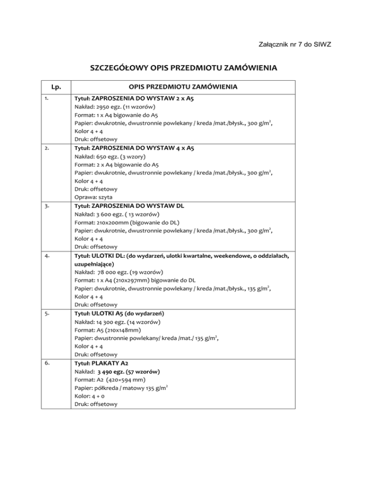 Załącznik nr 7 do SIWZ SZCZEGÓŁOWY OPIS PRZEDMIOTU ZAMÓWIENIA Lp. OPIS PRZEDMIOTU ZAMÓWIENIA 1. Tytuł: ZAPROSZENIA DO WYSTAW 2 x A5 Nakład: 2950 egz. (11 wzorów) Format: 1 x A4 bigowanie do A5 Papier: dwukrotnie, dwustronnie powlekany / kreda /mat./błysk., 300 g/m2, Kolor 4 + 4 Druk: offsetowy 2. Tytuł: ZAPROSZENIA DO WYSTAW 4 x A5 Nakład: 650 egz. (3 wzory) Format: 2 x A4 bigowanie do A5 Papier: dwukrotnie, dwustronnie powlekany / kreda /mat./błysk., 300 g/m 2, Kolor 4 + 4 Druk: offsetowy Oprawa: szyta 3. Tytuł: ZAPROSZENIA DO WYSTAW DL Nakład: 3 600 egz. ( 13 wzorów) Format: 210x200mm (bigowanie do DL) Papier: dwukrotnie, dwustronnie powlekany / kreda /mat./błysk., 300 g/m2, Kolor 4 + 4 Druk: offsetowy 4. Tytuł: ULOTKI DL: (do wydarzeń, ulotki kwartalne, weekendowe, o oddziałach, uzupełniające) Nakład: 78 000 egz. (19 wzorów) Format: 1 x A4 (210x297mm) bigowanie do DL Papier: dwukrotnie, dwustronnie powlekany / kreda /mat./błysk., 135 g/m2, Kolor 4 + 4 Druk: offsetowy 5. Tytuł: ULOTKI A5 (do wydarzeń) Nakład: 14 300 egz. (14 wzorów) Format: A5 (210x148mm) Papier: dwustronnie powlekany/ kreda /mat./ 135 g/m2, Kolor 4 + 4 Druk: offsetowy 6. Tytuł: PLAKATY A2 Nakład: 3 490 egz. (57 wzorów) Format: A2 (420×594 mm) Papier: półkreda / matowy 135 g/m2 Kolor: 4 + 0 Druk: offsetowy 7. Tytuł: WIZYTÓWKI Nakład: 10 000 egz. (24 wzory) Format: 90x50 mm Papier: karton wizytówkowy kredowy 350 g/m2 Kolor: 4 + 4 Druk: offsetowy Folia zabezpieczająca matowa/błyszcząca 8. Tytuł: INFORMATOR O MUZEUM OKRĘGOWYM W NOWYM SĄCZU Nakład: 2 000 egz. (1 wzór) Liczba stron: 12+4 str. okładki, Format środka: A5 (150x210 mm) Papier: dwustronnie, dwukrotnie powlekany/ kreda /mat./ 150g/m2, Okładka: format: 620x150 mm, kreda mat 250 g/m2 +folia błysk, składana na 3 części Kolor 4 + 4 Druk: offsetowy Oprawa: szyta 9. Tytuł: KARTKI OKOLICZNOŚCIOWE Nakład: 1 000 egz. (2 wzory) Format: 210x200mm (bigowanie DL) Papier ozdobny (np. perłowy, z tłoczeniami, powlekanymi folią - srebrną, złotą, wycinane laserowo lub wyzłacane, itp.) 300g/m2 Druk: offsetowy Kolor 4 + 4, bigowanie po dłuższym boku 10. Tytuł: POCZTÓWKI Nakład: 8 150 egz. (17 wzorów) Format: 150×105 mm Papier: karton biały 275 g/m2 Kolor: 4 + 1 folia błysk Druk: offsetowy 11. Tytuł: BROSZURA INFORMACYJNA A5 Nakład: 6000 egz. (2 wzory) Format: 2 x A4 bigowanie do A5 Papier: dwukrotnie, dwustronnie powlekany / kreda /mat./błysk., 135 g/m2, Kolor: 4 + 4 Druk: offsetowy 12. Tytuł: BROSZURA INFORMACYJNA A4 Nakład: 500 sztuk ( 1 wzór) Format: 1 x A2 bigowanie do A4 Papier: dwukrotnie, dwustronnie powlekany / kreda /mat./błysk., 200 g/m2, Kolor: 4 + 4 Druk: offsetowy