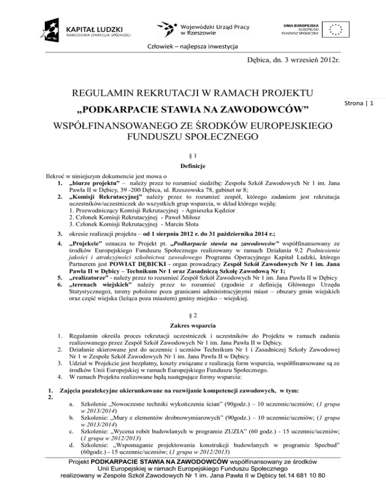 Człowiek – najlepsza inwestycja Dębica, dn. 3 wrzesień 2012r. REGULAMIN REKRUTACJI W RAMACH PROJEKTU „PODKARPACIE STAWIA NA ZAWODOWCÓW” WSPÓŁFINANSOWANEGO ZE ŚRODKÓW EUROPEJSKIEGO FUNDUSZU SPOŁECZNEGO §1 Definicje Ilekroć w niniejszym dokumencie jest mowa o 1. „biurze projektu” – należy przez to rozumieć siedzibę: Zespołu Szkół Zawodowych Nr 1 im. Jana Pawła II w Dębicy, 39 -200 Dębica, ul. Rzeszowska 78, gabinet nr 8; 2. „Komisji Rekrutacyjnej” należy przez to rozumieć zespół, którego zadaniem jest rekrutacja uczestników/uczestniczek do wszystkich grup wsparcia, w skład którego wejdą: 1. Przewodniczący Komisji Rekrutacyjnej - Agnieszka Kędzior 2. Członek Komisji Rekrutacyjnej - Paweł Miłosz 3. Członek Komisji Rekrutacyjnej - Marcin Słota 3. okresie realizacji projektu – od 1 sierpnia 2012 r. do 31 października 2014 r.; 4. „Projekcie” oznacza to Projekt pt. „Podkarpacie stawia na zawodowców” współfinansowany ze środków Europejskiego Funduszu Społecznego realizowany w ramach Działania 9.2 Podniesienie jakości i atrakcyjności szkolnictwa zawodowego Programu Operacyjnego Kapitał Ludzki, którego Partnerem jest POWIAT DĘBICKI - organ prowadzący Zespół Szkół Zawodowych Nr 1 im. Jana Pawła II w Dębicy – Technikum Nr 1 oraz Zasadniczą Szkołę Zawodową Nr 1; „realizatorze” - należy przez to rozumieć Zespół Szkół Zawodowych Nr 1 im. Jana Pawła II w Dębicy „terenach wiejskich” należy przez to rozumieć (zgodnie z definicją Głównego Urzędu Statystycznego), tereny położone poza granicami administracyjnymi miast – obszary gmin wiejskich oraz część wiejska (leżąca poza miastem) gminy miejsko – wiejskiej. 5. 6. §2 Zakres wsparcia 1. 2. 3. 4. 1. 2. Regulamin określa proces rekrutacji uczestniczek i uczestników do Projektu w ramach zadania realizowanego przez Zespół Szkół Zawodowych Nr 1 im. Jana Pawła II w Dębicy. Działanie skierowane jest do uczennic i uczniów Technikum Nr 1 i Zasadniczej Szkoły Zawodowej Nr 1 w Zespole Szkół Zawodowych Nr 1 im. Jana Pawła II w Dębicy. Udział w Projekcie jest bezpłatny, koszty związane z realizacją form wsparcia, współfinansowane są ze środków Unii Europejskiej w ramach Europejskiego Funduszu Społecznego. W ramach Projektu realizowane będą następujące formy wsparcia: Zajęcia pozalekcyjne ukierunkowane na rozwijanie kompetencji zawodowych, w tym: a. b. c. d. Szkolenie „Nowoczesne techniki wykończenia ścian” (90godz.) – 10 uczennic/uczniów; (1 grupa w 2013/2014) Szkolenie: „Mury z elementów drobnowymiarowych” (90godz.) – 10 uczennic/uczniów; (1 grupa w 2013/2014) Szkolenie: „Wycena robót budowlanych w programie ZUZIA” (60 godz.) - 15 uczennic/uczniów; (1 grupa w 2012/2013) Szkolenie: „Wspomaganie projektowania konstrukcji budowlanych w programie Specbud” (60godz.) - 15 uczennic/uczniów; (1 grupa w 2012/2013) Projekt PODKARPACIE STAWIA NA ZAWODOWCÓW współfinansowany ze środków Unii Europejskiej w ramach Europejskiego Funduszu Społecznego realizowany w Zespole Szkół Zawodowych Nr 1 im. Jana Pawła II w Dębicy tel.14 681 10 80 Strona | 1 Człowiek – najlepsza inwestycja e. f. g. h. i. j. k. l. Szkolenie: Obsługa programu serwisowego dla warsztatu samochodowego (30 godz.) – 15 uczennic/uczniów; (2 grupy w 2012/2013) Szkolenie: Komputerowe wspomaganie projektowania układów elektronicznych i elektrotechnicznych (60godz.) – 15 uczennic/uczniów; (1 grupa w 2013/2014) Szkolenie z tworzenia projektów graficznych za pomocą programu Photoshop CS5 (2 grupy po 70 godz.) – 26 uczennic/uczniów; (2 grupy w 2013/2014) Szkolenie z zakresu programowania obrabiarek CNC (2 grupy po 90 godz.) – Strona | 2 35 uczennic/uczniów; (1 grupa w 2012/2013, 2 grupa w 2013/2014) Zajęcia z blacharstwa przemysłowego oraz szkolenie teoretyczne i praktyczne celem przygotowania do egzaminu spawacza w metodzie TIG (4 grupy po 60 godz.) *)1 – 80 uczennic/uczniów; (2 grupy w 2012/2013, 2 grupy w 2013/2014) Zajęcia z artystycznego projektowania i szycia odzieży uwzględniające najnowsze trendy mody (2 grupy po 70 godz.) – 23 uczennic/uczniów; (2 grupy w 2013/2014) Zajęcia z "CNC - budowa, projektowanie sterowania i obsługa programów" (2 grupy po 70godz.) – 27 uczennic/uczniów; (1 grupa w 2012/2013, 2 grupa w 2013/2014) Kurs prawa jazdy kat. B (1 grupa po 31 godz. na 1 osobę) – 23 uczennic/uczniów. (1 grupa w 2012/2013) 2) Staże (35 osób) i praktyki (286 osób). Staże: w roku 2012/2013 - 15 uczniów zasadniczej szkoły zawodowej w roku 2013/2014 - 15 uczniów technikum oraz 5 uczniów zasadniczej szkoły zawodowej Praktyki: w roku 2012/2013 – 148 uczniów w zawodach: technik budownictwa, technik telekomunikacji, technik elektryk, technik mechatronik, technik pojazdów samochodowych, monter izolacji przemysłowych, blacharz izolacji przemysłowych, operator obrabiarek skrawających, roku 2013/2014 – 138 uczniów w zawodach: technik pojazdów samochodowych, technik elektryk, technik budownictwa, cyfrowych procesów graficznych, technik technologii odzieży, technik mechatronik, technik telekomunikacji, technik teleinformatyk, zasadnicza szkoła zawodowa branża budowlana 3) Szkolenia dla nauczycieli. Dwa szkolenia z zakresu doradztwa zawodowego dla członków Rady Pedagogicznych szkół zawodowych POWIATU DĘBICKIEGO: - wszyscy członkowie Rady Pedagogicznej Zespołu Szkół Zawodowych Nr 1 im. Jana Pawła II w Dębicy uczących w Technikum Nr 1 oraz Zasadniczej Szkole Zawodowej Nr 1. 5. Formy wsparcia, o których mowa w ust. 4 będą się odbywać na podstawie szczegółowego harmonogramu umieszczonego na tablicy ogłoszeń oraz na stronie internetowej szkoły. 6. Realizator zastrzega sobie w uzasadnionych przypadkach prawo do zmiany ustalonego harmonogramu. §3 Uczestniczki i uczestnicy Projektu 1. W Projekcie uczestniczyć mogą uczennice i uczniowie Zespołu Szkół Zawodowych Nr 1 i