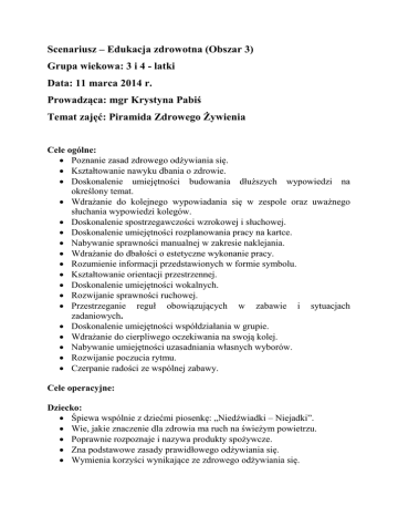 Scenariusz – Edukacja zdrowotna (Obszar 3) Grupa wiekowa: 3 i 4 - latki Data: 11 marca 2014 r. Prowadząca: mgr Krystyna Pabiś Temat zajęć: Piramida Zdrowego Żywienia Cele ogólne: Poznanie zasad zdrowego odżywiania się. Kształtowanie nawyku dbania o zdrowie. Doskonalenie umiejętności budowania dłuższych wypowiedzi na określony temat. Wdrażanie do kolejnego wypowiadania się w zespole oraz uważnego słuchania wypowiedzi kolegów. Doskonalenie spostrzegawczości wzrokowej i słuchowej. Doskonalenie umiejętności rozplanowania pracy na kartce. Nabywanie sprawności manualnej w zakresie naklejania. Wdrażanie do dbałości o estetyczne wykonanie pracy. Rozumienie informacji przedstawionych w formie symbolu. Kształtowanie orientacji przestrzennej. Doskonalenie umiejętności wokalnych. Rozwijanie sprawności ruchowej. Przestrzeganie reguł obowiązujących w zabawie i sytuacjach zadaniowych. Doskonalenie umiejętności współdziałania w grupie. Wdrażanie do cierpliwego oczekiwania na swoją kolej. Nabywanie umiejętności uzasadniania własnych wyborów. Rozwijanie poczucia rytmu. Czerpanie radości ze wspólnej zabawy. Cele operacyjne: Dziecko: Śpiewa wspólnie z dziećmi piosenkę: „Niedźwiadki – Niejadki”. Wie, jakie znaczenie dla zdrowia ma ruch na świeżym powietrzu. Poprawnie rozpoznaje i nazywa produkty spożywcze. Zna podstawowe zasady prawidłowego odżywiania się. Wymienia korzyści wynikające ze zdrowego odżywiania się. Wie, które produkty są zdrowe i potrzebne do prawidłowego funkcjonowania organizmu, a które można spożywać tylko czasami. Rozumie, dlaczego trzeba ograniczać jedzenie takich produktów, jak: słodycze, chipsy, napoje gazowane. Samorzutnie wypowiada się podczas zajęć. Uważnie słucha wypowiedzi kolegów. Zachowuje kolejność wypowiadania się w zespole. Współdziała w grupie podczas budowania piramidy zdrowia. Odczytuje informacje przedstawione w formie symbolu. Poprawnie reaguje na przerwę w muzyce. Czerpie radość ze wspólnej zabawy. Klasyfikuje produkty spożywcze na te, które sprzyjają zdrowiu lub szkodzą mu. Doskonali sprawność manualną w zakresie naklejania elementów w odpowiednim miejscu. Porządkuje miejsce pracy. Wypowiada się na temat swojej pracy – uzasadnia własny wybór. Środki dydaktyczne: Plakat „Piramida Zdrowego Żywienia”, produkty spożywcze, napisy do globalnego czytania: owoce, warzywa, mleko…, kartony w różnych kolorach do budowania Piramidy Zdrowego Żywieni, ilustracje przedstawiające produkty spożywcze, karty pracy, klej, chusteczki nawilżające, płyta CD i odtwarzacz, tamburyn. Metody : Słowne. Oglądowe. Praktycznego działania. Przebieg zajęć: 1. Zabawa kołowa z piosenką „Niedźwiadki - Niejaki”. 2. Rozmowa nawiązująca do piosenki „Niedźwiadki - niejaki”. (Podkreślenie znaczenia ruchu na świeżym powietrzu dla naszego zdrowia). Dlaczego nazwano misie: „Niedźwiadki – Niejadki”? Kiedy niedźwiadkom wrócił apetyt? Co to znaczy, że „wyhasały się niedźwiadki?” Jakie są wasze ulubione zabawy ruchowe? 3. Zapoznanie dzieci z Piramidą Zdrowego Żywienia. omówienie grupy produktów zbożowych, 2 4. 5. 6. 7. 8. omówienie grupy warzyw, omówienie grupy owoców, omówienie grupy mleka i produktów mlecznych, omówienie grupy produktów białkowych, omówienie grupy tłuszczów – oleje roślinne. Budowanie „Piramidy Zdrowego Żywienia” z kolorowych pudełek zawierających produkty spożywcze. Zabawa dydaktyczna: „Tak – Nie” Należy jeść owoce i warzywa, ponieważ zawierają witamy. TAK Chipsy są bardzo zdrowe. NIE Mleko, sery i jogurty wzmacniają nasze kości i zęby. TAK Powinniśmy codziennie jeść dużo lizaków i cukierków. NIE Warzywa i owoce koniecznie trzeba myć przed jedzeniem. TAK Zabawa ruchowa z przerwą w muzyce: „Produkty zdrowe i niezdrowe”. Karty pracy – klasyfikowanie produktów spożywczych, na te, które sprzyjają zdrowiu lub szkodzą mu (naklejanie obrazków w odpowiednim miejscu). Wypowiadanie się na temat swojej pracy – uzasadnianie własnych wyborów. Zakończenie zajęć.