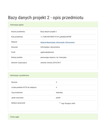 Bazy danych projekt 2 - opis przedmiotu Informacje ogólne Nazwa przedmiotu Bazy danych projekt 2 Kod przedmiotu 11.3-WK-IiEP-BDP2-P-S14_pNadGen4FFBF Wydział Wydział Matematyki, Informatyki i Ekonometrii Kierunek Informatyka i ekonometria Profil ogólnoakademicki Rodzaj studiów pierwszego stopnia z tyt. licencjata Semestr rozpoczęcia semestr zimowy 2016/2017 Informacje o przedmiocie Semestr 5 Liczba punktów ECTS do zdobycia 4 Typ przedmiotu obieralny Język nauczania polski Sylabus opracował Formy zajęć mgr Grzegorz Arkit Forma Liczba godzin w Liczba godzin w Liczba godzin w Liczba godzin w Forma zajęć semestrze tygodniu semestrze tygodniu zaliczenia (stacjonarne) (stacjonarne) (niestacjonarne) (niestacjonarne) 30 2 - - Projekt Zaliczenie na ocenę Cel przedmiotu Zaprojektowanie przez studenta relacyjnej bazy danych modelującej pewien fragment rzeczywistości oraz stworzenie aplikacji WWW do jej obsługi. Wymagania wstępne Bazy danych 2. Zakres tematyczny W ramach projektu tworzony jest system informatyczny na wybrany temat. Studenci w grupach 1-4 osobowych realizują i dokumentują poszczególne etapy tworzenia systemu informatycznego. Efektem końcowym ma być działający system WWW, funkcjonujący w architekturze klient-serwer oraz dokumentacja analityczno-projektowa. W ramach zajęć studenci dokonują analizy dziedziny przedmiotowej, wykonują projekt logiczny bazy danych, skrypty tworzące strukturę bazy danych, ew. tworzą opis systemu z wykorzystaniem wybranych diagramów UML (klas, przypadków użycia, stanu, czynności, wdrożenia), tworzą kod właściwej aplikacji. Projekty są wykonywane samodzielnie lub w grupach. Metody kształcenia Ćwiczenia laboratoryjne; metoda projektu. Efekty kształcenia i metody weryfikacji osiągania efektów kształcenia Opis efektu Student ma wiedzę teoretyczną, jak Symbole efektów Metody weryfikacji Forma zajęć K_W03 projekt Projekt K_W05 projekt Projekt K_U23 bieżąca kontrola na Projekt zaprojektować bazę danych. Student wie, w jaki sposób można utworzyć aplikację WWW obsługującą bazę danych. Student potrafi zaprojektować bazę danych, wykorzystuje narzędzia zajęciach komputerowe typu CASE. projekt Student potrafi stworzyć K_U30 dokumentację techniczną projektu. Student rozumie konieczność wykonanie sprawozdań Projekt laboratoryjnych K_K05 systematycznej pracy nad projektem. bieżąca kontrola na Projekt zajęciach Warunki zaliczenia Warunkiem uzyskania pozytywnej oceny jest złożenie kompletnego projektu (bazy danych i aplikacji WWW) oraz dokumentacji w terminie wyznaczonym przez prowadzącego. Ocena końcowa: 40% za projekt bazy danych, 40% za aplikację WWW, 20% za dokumentację. Obciążenie pracą Obciążenie pracą Studia Studia niestacjonarne stacjonarne (w godz.) (w godz.) Godziny kontaktowe (udział w zajęciach; konsultacjach; egzaminie, itp.) 45 - Samodzielna praca studenta (przygotowanie do: zajęć, kolokwium, 60 - Łącznie 105 - Punkty ECTS Studia Studia niestacjonarne egzaminu; studiowanie literatury przygotowanie: pracy pisemnej, projektu, prezentacji, raportu, wystąpienia; itp.) stacjonarne Zajęcia z udziałem nauczyciela akademickiego 2 - Zajęcia bez udziału nauczyciela akademickiego 2 - Łącznie 4 - Literatura podstawowa 1. E. Balanescu, M. Bucica, Cristian Darie, PHP 5 i MySQL. Zastosowania e-commerce, Helion, 2005. 2. J. Clark, XSL Transformations (XSLT), http://www.w3.org/TR/xslt7. 3. L. Quin, Extensible Markup Language (XML), http://www.w3.org/XML. 4. T. Converse, J. Park, C. Morgan, PHP5 i MySQL. Biblia, Helion, 2005. 5. S. Urman, R. Hardman, M. McLaughlin, Oracle Database 10g. Programowanie w języku PL/SQL, Helion, 2007. 6. E. Naramore, J. Gerner, Y. Le Scouarnec, J. Stolz, M.K. Glass, PHP5, Apache i MySQL. Od podstaw, Helion, 2005. Literatura uzupełniająca 1. Bryan Basham, Kathy Sierra, Bert Bates, Head First Servlets & JSP. Helion, 2005. 2. Wojciech Romowicz, Java Server Pages oraz inne komponenty JavaPlatform, Helion, 2001. Uwagi Zmodyfikowane przez dr inż. Janusz Jabłoński (ostatnia modyfikacja: 03-10-2016 14:44)