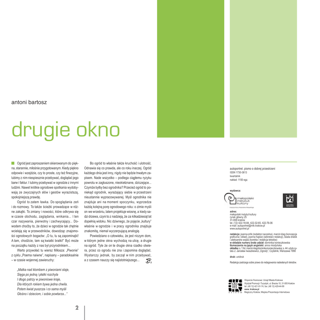 antoni bartosz drugie okno Ogród jest zaproszeniem skierowanym do piękna, starannie, miłośnie przygotowanym. Kiedy piękno odpowie i wzejdzie, czy to proste, czy też finezyjne, lubimy z nim niespiesznie przebywać, doglądać jego barw i faktur. I lubimy przebywać w ogrodzie z innymi ludźmi. Nawet krótkie ogrodowe spotkania wydobywają ze zwyczajnych słów i gestów wyrazistszą, spokojniejszą prawdę. Ogród to zatem ławka. Do spoglądania zeń i do rozmowy. To także ścieżki prowadzące w różne zakątki. To zmiany i nowości, które odkrywa się w czasie obchodu, zaglądania, wnikania... I ten czar nazywania, pierwotny i zachwycający... Dowodem choćby to, że dzieci w ogrodzie tak chętnie wcielają się w przewodników, dowodząc znajomości ogrodowych bogactw: „O tu, tu są zapominajki! A tam, chodźcie, tam są kwiatki bratki!” Być może na początku każdy z nas był przyrodnikiem... Warto przywołać tu wiersz Miłosza: „Piwonie” z cyklu „Poema naiwne”, napisany – paradoksalnie – w czasie wojennej zawieruchy: „Matka nad klombem z piwoniami staje, Sięga po jedną i płatki rozchyla I długo patrzy w piwoniowe kraje, Dla których rokiem bywa jedna chwila. Potem kwiat puszcza i co sama myśli Głośno i dzieciom, i sobie powtarza...” Bo ogród to właśnie także kruchość i ulotność. Odnawia się co prawda, ale co roku inaczej. Ogród każdego dnia jest inny, nigdy nie będzie trwałym zapisem. Nade wszystko – podlega ciągłemu ryzyku powrotu w zagłuszone, nieokiełznane, dziczejące... Czymże byłby bez ogrodnika? Przecież ogród to poniekąd ogrodnik, wyrażający siebie w przestrzeni nieustannie wypracowywanej. Myśl ogrodnika nie znajduje ani na moment spoczynku, wyprzedza każdą kolejną porę ogrodowego roku: o zimie myśli on we wrześniu, latem projektuje wiosnę, a kiedy sadzi drzewa, czyni to z nadzieją, że za kilkadziesiąt lat dopełnią widoku. Nic dziwnego, że pojęcie „kultury” właśnie w ogrodzie i w pracy ogrodnika znajduje znakomitą, niemal wyczerpującą analogię. Powiedziano o człowieku, że jest niczym dom, w którym jedne okna wychodzą na ulicę, a drugie na ogród. Tyle że on te drugie okna rzadko otwiera, przez co ogrodu nie zna i zapomina doglądać. Wystarczy jednak, by zaczął w nim przebywać, a z czasem nauczy się najistotniejszego... autoportret. pismo o dobrej przestrzeni ISSN 1730-3613 kwartalnik nakład: 1150 egz. wydawca: adres: małopolski instytut kultury rynek główny 25 31-008 kraków tel. (12) 422-18-84, 422-32-65, 422-76-06 e-mail: [email protected] www.autoportret.pl redakcja: joanna orlik (redaktor naczelna), marcin klag (koncepcja graficzna i skład), joanna hajduk (sekretarz redakcji), beata drabik i aleksandra wojda (korekta i redakcja tekstów) w składzie numeru brała udział: dominika konieczkowska tłumaczenia na język angielski: anna miodyńska okładka: s. 1 fot. marcin klag/dominika konieczkowska; s. 44: użyto cytatu z: Jarosław Iwaszkiewicz „Ogrody”, Czytelnik, Warszawa 1990 druk: unidruk Redakcja zastrzega sobie prawo do redagowania nadesłanych tekstów. Wsparcie finansowe: Urząd Miasta Krakowa Wydział Promocji i Turystyki, ul. Bracka 10, 31-005 Kraków tel. (48 12) 421-91-74, fax: (48 12) 429-44-99 www. krakow.pl Magiczny Kraków, Miejska Prezentacja Internetowa 2