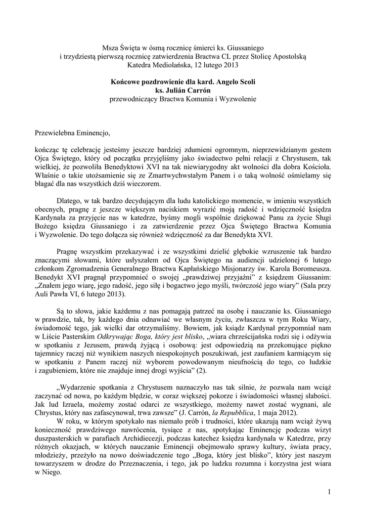 Msza Święta w ósmą rocznicę śmierci ks. Giussaniego i trzydziestą pierwszą rocznicę zatwierdzenia Bractwa CL przez Stolicę Apostolską Katedra Mediolańska, 12 lutego 2013 Końcowe pozdrowienie dla kard. Angelo Scoli ks. Julián Carrón przewodniczący Bractwa Komunia i Wyzwolenie Przewielebna Eminencjo, kończąc tę celebrację jesteśmy jeszcze bardziej zdumieni ogromnym, nieprzewidzianym gestem Ojca Świętego, który od początku przyjęliśmy jako świadectwo pełni relacji z Chrystusem, tak wielkiej, że pozwoliła Benedyktowi XVI na tak niewiarygodny akt wolności dla dobra Kościoła. Właśnie o takie utożsamienie się ze Zmartwychwstałym Panem i o taką wolność ośmielamy się błagać dla nas wszystkich dziś wieczorem. Dlatego, w tak bardzo decydującym dla ludu katolickiego momencie, w imieniu wszystkich obecnych, pragnę z jeszcze większym naciskiem wyrazić moją radość i wdzięczność księdza Kardynała za przyjęcie nas w katedrze, byśmy mogli wspólnie dziękować Panu za życie Sługi Bożego księdza Giussaniego i za zatwierdzenie przez Ojca Świętego Bractwa Komunia i Wyzwolenie. Do tego dołącza się również wdzięczność za dar Benedykta XVI. Pragnę wszystkim przekazywać i ze wszystkimi dzielić głębokie wzruszenie tak bardzo znaczącymi słowami, które usłyszałem od Ojca Świętego na audiencji udzielonej 6 lutego członkom Zgromadzenia Generalnego Bractwa Kapłańskiego Misjonarzy św. Karola Boromeusza. Benedykt XVI pragnął przypomnieć o swojej „prawdziwej przyjaźni” z księdzem Giussanim: „Znałem jego wiarę, jego radość, jego siłę i bogactwo jego myśli, twórczość jego wiary” (Sala przy Auli Pawła VI, 6 lutego 2013). Są to słowa, jakie każdemu z nas pomagają patrzeć na osobę i nauczanie ks. Giussaniego w prawdzie, tak, by każdego dnia odnawiać we własnym życiu, zwłaszcza w tym Roku Wiary, świadomość tego, jak wielki dar otrzymaliśmy. Bowiem, jak ksiądz Kardynał przypomniał nam w Liście Pasterskim Odkrywając Boga, który jest blisko, „wiara chrześcijańska rodzi się i odżywia w spotkaniu z Jezusem, prawdą żyjącą i osobową: jest odpowiedzią na przekonujące piękno tajemnicy raczej niż wynikiem naszych niespokojnych poszukiwań, jest zaufaniem karmiącym się w spotkaniu z Panem raczej niż wyborem powodowanym nieufnością do tego, co ludzkie i zagubieniem, które nie znajduje innej drogi wyjścia” (2). „Wydarzenie spotkania z Chrystusem naznaczyło nas tak silnie, że pozwala nam wciąż zaczynać od nowa, po każdym błędzie, w coraz większej pokorze i świadomości własnej słabości. Jak lud Izraela, możemy zostać odarci ze wszystkiego, możemy nawet zostać wygnani, ale Chrystus, który nas zafascynował, trwa zawsze” (J. Carrón, la Repubblica, 1 maja 2012). W roku, w którym spotykało nas niemało prób i trudności, które ukazują nam wciąż żywą konieczność prawdziwego nawrócenia, tysiące z nas, spotykając Eminencję podczas wizyt duszpasterskich w parafiach Archidiecezji, podczas katechez księdza kardynała w Katedrze, przy różnych okazjach, w których nauczanie Eminencji obejmowało sprawy kultury, świata pracy, młodzieży, przeżyło na nowo doświadczenie tego „Boga, który jest blisko”, który jest naszym towarzyszem w drodze do Przeznaczenia, i tego, jak po ludzku rozumna i korzystna jest wiara w Niego. 1 Dlatego nie możemy nie odnowić w sobie świadomości, że otrzymana dzięki charyzmatowi ks. Giussaniego łaska, poprzez naszą codzienną gotowość do współpracy, służy całkowicie budowaniu Kościoła, Ciała Chrystusa, czyniąc go obecnym w każdym środowisku, w każdych okolicznościach, w jakich rozgrywa się dramat ludzkiego życia; idziemy za wezwaniem Waszej Eminencji kierowanym do wszystkich wiernych kościoła ambrozjańskiego: „Oświeceni dojrzałą wiarą, chrześcijanie nie cofają się przed obowiązkiem proponowania swojego doświadczenia i swojego spojrzenia na wielkie kwestie, którym nasze czasy muszą stawić czoła” (Odkrywając Boga, który jest blisko, 12.4). Czując tę konieczność niesienia świadectwa, świadomi naszych ograniczeń i radując się z nowego życia, które ciągle otrzymujemy od Chrystusa w przynależności do Jego Kościoła, prosimy Eminencję, wdzięczni za Jego ojcowską obecność, o pobłogosławienie nas, oraz by ksiądz Kardynał zawsze prowadził nas i towarzyszył nam w trudnej i fascynującej drodze chrześcijańskiego życia, w jedności z braćmi chrześcijanami i w służbie dobru wszystkich naszych braci ludzi. Dziękujemy, Eminencjo! 2