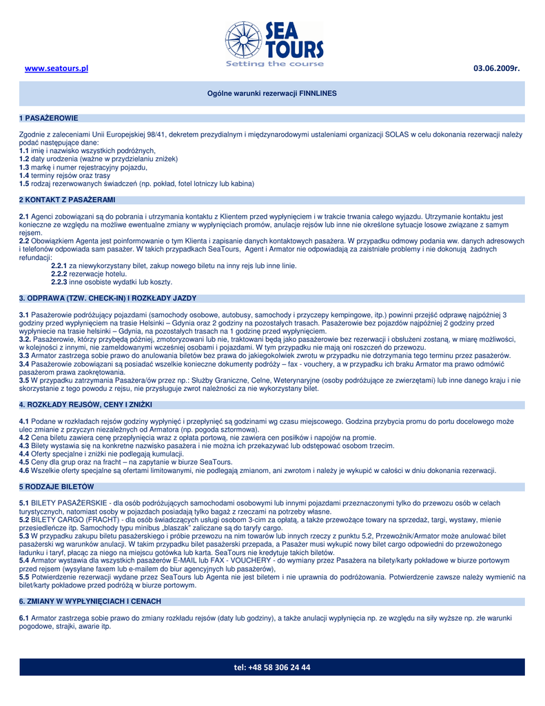 www.seatours.pl 03.06.2009r. Ogólne warunki rezerwacji FINNLINES 1 PASAŻEROWIE Zgodnie z zaleceniami Unii Europejskiej 98/41, dekretem prezydialnym i międzynarodowymi ustaleniami organizacji SOLAS w celu dokonania rezerwacji należy podać następujące dane: 1.1 imię i nazwisko wszystkich podróżnych, 1.2 daty urodzenia (ważne w przydzielaniu zniżek) 1.3 markę i numer rejestracyjny pojazdu, 1.4 terminy rejsów oraz trasy 1.5 rodzaj rezerwowanych świadczeń (np. pokład, fotel lotniczy lub kabina) 2 KONTAKT Z PASAŻERAMI 2.1 Agenci zobowiązani są do pobrania i utrzymania kontaktu z Klientem przed wypłynięciem i w trakcie trwania całego wyjazdu. Utrzymanie kontaktu jest konieczne ze względu na możliwe ewentualne zmiany w wypłynięciach promów, anulacje rejsów lub inne nie określone sytuacje losowe związane z samym rejsem. 2.2 Obowiązkiem Agenta jest poinformowanie o tym Klienta i zapisanie danych kontaktowych pasażera. W przypadku odmowy podania ww. danych adresowych i telefonów odpowiada sam pasażer. W takich przypadkach SeaTours, Agent i Armator nie odpowiadają za zaistniałe problemy i nie dokonują żadnych refundacji: 2.2.1 za niewykorzystany bilet, zakup nowego biletu na inny rejs lub inne linie. 2.2.2 rezerwacje hotelu. 2.2.3 inne osobiste wydatki lub koszty. 3. ODPRAWA (TZW. CHECK-IN) I ROZKŁADY JAZDY 3.1 Pasażerowie podróżujący pojazdami (samochody osobowe, autobusy, samochody i przyczepy kempingowe, itp.) powinni przejść odprawę najpóźniej 3 godziny przed wypłynięciem na trasie Helsinki – Gdynia oraz 2 godziny na pozostałych trasach. Pasażerowie bez pojazdów najpóźniej 2 godziny przed wypłyniecie na trasie helsinki – Gdynia, na pozostałych trasach na 1 godzinę przed wypłynięciem. 3.2. Pasażerowie, którzy przybędą później, zmotoryzowani lub nie, traktowani będą jako pasażerowie bez rezerwacji i obsłużeni zostaną, w miarę możliwości, w kolejności z innymi, nie zameldowanymi wcześniej osobami i pojazdami. W tym przypadku nie mają oni roszczeń do przewozu. 3.3 Armator zastrzega sobie prawo do anulowania biletów bez prawa do jakiegokolwiek zwrotu w przypadku nie dotrzymania tego terminu przez pasażerów. 3.4 Pasażerowie zobowiązani są posiadać wszelkie konieczne dokumenty podróży – fax - vouchery, a w przypadku ich braku Armator ma prawo odmówić pasażerom prawa zaokrętowania. 3.5 W przypadku zatrzymania Pasażera/ów przez np.: Służby Graniczne, Celne, Weterynaryjne (osoby podróżujące ze zwierzętami) lub inne danego kraju i nie skorzystanie z tego powodu z rejsu, nie przysługuje zwrot należności za nie wykorzystany bilet. 4. ROZKŁADY REJSÓW, CENY I ZNIŻKI 4.1 Podane w rozkładach rejsów godziny wypłynięć i przepłynięć są godzinami wg czasu miejscowego. Godzina przybycia promu do portu docelowego może ulec zmianie z przyczyn niezależnych od Armatora (np. pogoda sztormowa). 4.2 Cena biletu zawiera cenę przepłynięcia wraz z opłata portową, nie zawiera cen posiłków i napojów na promie. 4.3 Bilety wystawia się na konkretne nazwisko pasażera i nie można ich przekazywać lub odstępować osobom trzecim. 4.4 Oferty specjalne i zniżki nie podlegają kumulacji. 4.5 Ceny dla grup oraz na fracht – na zapytanie w biurze SeaTours. 4.6 Wszelkie oferty specjalne są ofertami limitowanymi, nie podlegają zmianom, ani zwrotom i należy je wykupić w całości w dniu dokonania rezerwacji. 5 RODZAJE BILETÓW 5.1 BILETY PASAŻERSKIE - dla osób podróżujących samochodami osobowymi lub innymi pojazdami przeznaczonymi tylko do przewozu osób w celach turystycznych, natomiast osoby w pojazdach posiadają tylko bagaż z rzeczami na potrzeby własne. 5.2 BILETY CARGO (FRACHT) - dla osób świadczących usługi osobom 3-cim za opłatą, a także przewożące towary na sprzedaż, targi, wystawy, mienie przesiedleńcze itp. Samochody typu minibus „blaszak” zaliczane są do taryfy cargo. 5.3 W przypadku zakupu biletu pasażerskiego i próbie przewozu na nim towarów lub innych rzeczy z punktu 5.2, Przewoźnik/Armator może anulować bilet pasażerski wg warunków anulacji. W takim przypadku bilet pasażerski przepada, a Pasażer musi wykupić nowy bilet cargo odpowiedni do przewożonego ładunku i taryf, płacąc za niego na miejscu gotówka lub karta. SeaTours nie kredytuje takich biletów. 5.4 Armator wystawia dla wszystkich pasażerów E-MAIL lub FAX - VOUCHERY - do wymiany przez Pasażera na bilety/karty pokładowe w biurze portowym przed rejsem (wysyłane faxem lub e-mailem do biur agencyjnych lub pasażerów), 5.5 Potwierdzenie rezerwacji wydane przez SeaTours lub Agenta nie jest biletem i nie uprawnia do podróżowania. Potwierdzenie zawsze należy wymienić na bilet/karty pokładowe przed podróżą w biurze portowym. 6. ZMIANY W WYPŁYNIĘCIACH I CENACH 6.1 Armator zastrzega sobie prawo do zmiany rozkładu rejsów (daty lub godziny), a także anulacji wypłynięcia np. ze względu na siły wyższe np. złe warunki pogodowe, strajki, awarie itp. tel: +48 58 306 24 44 www.seatours.pl 03.06.2009r. 6.2 Armator zastrzega sobie prawo do zmiany cen biletów bez wcześniejszego powiadomienia w przypadkach uzasadnionych wyższą koniecznością jak np. drastyczne i nagłe zmiany cen paliw, itp. 6.3 Jednakże w przypadku zmian w potwierdzonych rezerwacjach lub sprzedanych biletach gwarantuje transport w innym terminie. 6.4 W przypadku zmiany portu wypłynięcia, zmiany środka transportu lub anulacji rejsu nie dokonuje on zwrotów dodatkowych kosztów poniesionych przez pasażera tzn. dojazdu do innego portu (np. paliwo, autostrady), telefony, hotele, parkingi, rekompensaty za utracone wynagrodzenie z tytułu nie stawienia się do pracy, itp. 6.5 Armator będzie dokładał wszelkich starań aby zagwarantować pasażerowi podróż w takich samych warunkach na jakie miał wykupiony bilet. 7. DZIECI I MŁODZIEŻ 7.1 Dzieci i młodzież w wieku 6 – 17 lat płacą 50 % ceny bilet. 7.2 Dzieci 