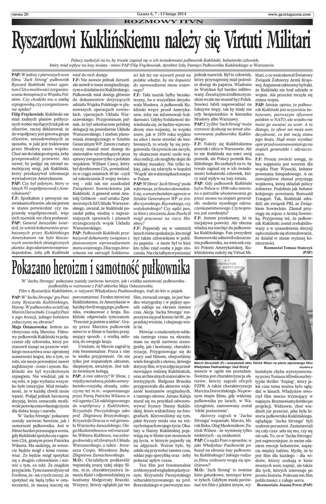 Gazeta 6, 7 - 13 lutego 2014 strona 20 www.gazetagazeta.com ROZMOWY ITVN Ryszardowi Kuklińskiemu należy się Virtuti Militari Polacy zasłużyli na to, by trwale zapisał się w ich świadomości pułkownik Kukliński, bohaterski człowiek, który miał wpływ na losy świata - mówi PAP Filip Frąckowiak, dyrektor Izby Pamięci Pułkownika Kuklińskiego w Warszawie. PAP: W jednej z pierwszych scen filmu "Jack Strong" pułkownik Ryszard Kukliński mówi agentom CIA o możliwości zorganizowania konspiracji w Wojsku Polskim. Czy chodziło mu o siatkę szpiegowską, czy o zorganizowanie spisku? Filip Frąckowiak: Kukliński nie miał żadnych planów politycznych wobec myślących tak jak on oficerów, raczej deklarował, że do współpracy jest gotowa grupa oficerów, niezadowolonych ze sposobu, w jaki jest traktowane przez Moskwę nasze wojsko. Choć nie do takiego stopnia, żeby przeprowadzić przewrót. Ani nawet, by podjąć się niemal samobójczej misji, jak Kukliński, który przekazywał informacje wywiadowcze Amerykanom. PAP: Czy był jedynym, który w latach 70. współpracował z Amerykanami? F.F: Spotkałem z pewnymi nazwiskami oficerów, ale nie jestem w stanie potwierdzić czy naprawdę współpracowali, więc tych nazwisk nie chcę podawać. PAP: Generał Jaruzelski twierdził, że wśród dokumentów przekazanych przez Kuklińskiego Amerykanom nie było kluczowych sowieckich strategicznych planów. Jego zdaniem to nieprawdopodobne, żeby płk Kukliński miał do nich dostęp. F.F: Nie zawsze jednak Jaruzelski mówił w tonie marginalizującym o działalności Kuklińskiego. Pułkownik miał dostęp głównie do dokumentów dotyczących udziału Wojska Polskiego w planowanych operacjach sowieckich, operacjach Układu Warszawskiego. Przypominam jednak, że był sekretarzem polskiej delegacji na posiedzenia Układu Warszawskiego. I szefem planowania strategicznego w Sztabie Generalnym WP. Zatem z natury rzeczy musiał mieć dostęp do materiałów wychodzących poza sprawy związane tylko z polskim wojskiem. William Casey, który był dyrektorem CIA, powiedział, że w ciągu ostatnich 40 lat - czyli od zakończenia II wojny światowej - nikt tak nie zaszkodził Związkowi Sowieckiemu jak Kukliński. A generał armii Anatolij Gribkow - szef sztabu Zjednoczonych Sił Układu Warszawskiego, uważał, że Kukliński posiadał pełną wiedzę o najważniejszych sprawach i planach strategicznych wojsk Układu Warszawskiego. PAP: Pułkownik Kukliński przekazywał dokumenty związane z planowanym wprowadzeniem stanu wojennego. Dlaczego Amerykanie nie ostrzegli Solidarno- ści lub też nie wywarli presji na polskie władze, by nie dopuścić do wprowadzenia stanu wojennego? F.F: Taki nacisk byłby bezskuteczny, bo o wszystkim decydowała Moskwa. A pułkownik Kukliński wręcz prosił Amerykanów, żeby nie informowali Solidarności. Gdyby Solidarność dowiedziała się, że będzie wprowadzony stan wojenny, że wojsko znów, jak w 1970 roku wyjdzie na ulice i może strzelać do bezbronnych, to wtedy by się przygotowała. Oczywiście nie na tyle, by skutecznie stawić czoło wojsku i milicji, ale mogłoby dojść do wielkiej masakry. Nie tylko takiej, jaka się zdarzyła w kopalni "Wujek" ale w dziesiątkach miejsc w Polsce. PAP: W filmie "Jack Strong" pada informacja, że Sowieci dowiedzieli się, o amerykańskim agencie w Sztabie Generalnym WP ze źródła rzymskiego. Rzymskiego, czy watykańskiego? Czy sądzi pan, że ktoś z otoczenia Jana Pawła II mógł pracować na rzecz Moskwy? F.F: Pojawiały się w ostatnich latach różne spekulacje, kto mógł być takim człowiekiem w pobliżu papieża - a może był to ktoś kto tylko znał osobę z jego otoczenia. Nie chciałbym wymieniać jednak nazwisk. Był to człowiek, który przynajmniej miał pośredni dostęp do papieża. Wiadomo że Watykan był bardzo infiltrowany. Zresztą tym źródłem rzymskim wcale nie musiał być Polak. Sowieci lubili naprowadzać na fałszywe tropy, tak by ślady nie szły bezpośrednio w kierunku Moskwy albo Warszawy. PAP: Czy film "Jack Strong" może wznowić dyskusję na temat uhonorowania pułkownika Kuklińskiego. F.F: Należy się Kuklińskiemu pomnik i ulica w Warszawie. Ale to nie Kukliński ma mieć swój pomnik, ale Polacy pomnik Kuklińskiego. Bo zasłużyli na to, by trwale zapisał się w ich świadomości bohaterski człowiek, który miał wpływ na losy świata. PAP: Gdy pułkownik Kukliński był w Polsce w 1998 roku mówiono o potrzebie uhonorowania go przez awans na stopień generalski, nadania wysokiego odznaczenia państwowego. Czy ta sprawa jest zamknięta? F.F: Jestem przekonany, że ta inicjatywa powróci. Ale obecna władza ma niechęć do pułkownika Kuklińskiego. Pan prezydent Komorowski odmówił odznaczenia pułkownika, na wniosek części Polonii Amerykańskiej. Kuklińskiemu należy się Virtuti Mi- litari, o co wnioskował Światowy Związek Żołnierzy Armii Krajowej. Argument odmowny był taki, że Kukliński nie brał udziału w wojnie. Ale przecież toczyła się zimna wojna. PAP: Istnieje opinia, że pułkownik Kukliński jest oczywiście bohaterem, pierwszym oficerem polskim w NATO, ale wojsko nie może go uważać za wzór. A to dlatego, że oficer nie może sam decydować, co jest racją stanu jego kraju. Stąd może wynikać opór przed awansowaniem go na stopień generalski i odznaczeniem. F.F: Proszę zwrócić uwagę, że bez wątpienia jest wzorem dla wojska Piotr Wysocki, bohater powstania listopadowego. A on niewątpliwie złamał przysięgę wojskową, którą składali polscy żołnierze. Podobnie jak bohater kolejnego powstania Romuald Traugutt. Tak, Kukliński zdradził, ale związek PRL ze Związkiem Sowieckim. Złamał przysięgę na sojusz z Armią Sowiecką. Przypomnę też, że pułkownik Kukliński został zrehabilitowany a w uzasadnieniu decyzji sądu znalazło się sformułowanie, że działał w stanie wyższej konieczności. Rozmawiał