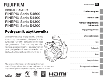 BL01614-E02 DIGITAL CAMERA FINEPIX FINEPIX FINEPIX FINEPIX Seria Seria Seria Seria PL Przed rozpoczęciem S4500 S4400 S4300 S4200 Podręcznik użytkownika Dziękujemy za zakup tego produktu. W niniejszym podręczniku opisano, jak używać aparatu cyfrowego FUJIFILM i dołączonego do niego oprogramowania. Przed rozpoczęciem użytkowania aparatu dokładnie i ze zrozumieniem przeczytaj podręcznik oraz ostrzeżenia z rozdziału „Dla własnego bezpieczeństwa” (str. ii). Pierwsze kroki Podstawy fotografowania i odtwarzania Więcej o fotografowaniu Więcej o odtwarzaniu Filmy Połączenia Menu Uwagi techniczne Aby uzyskać informacje o produktach pokrewnych, odwiedź naszą witrynę internetową znajdującą się pod adresem http://www.fujifilm.com/products/digital_cameras/index.html Rozwiązywanie problemów Załącznik Dla własnego bezpieczeństwa Przed rozpoczęciem użytkowania przeczytaj poniższe uwagi OSTRZEŻENIE Należy uważać, aby do aparatu nie dostała się ciecz lub inne przedmioty. W przypadku dostania się cieczy lub innych przedmiotów do aparatu należy wyłączyć aparat, wyjąć akumulator i odłączyć zasilacz sieciowy. Kontynuowanie używania aparatu może spowodować pożar lub porażenie prądem. • Skontaktuj się ze sprzedawcą firmy FUJIFILM. Uwagi dotyczące bezpieczeństwa • Upewnij się, że aparat jest obsługiwany poprawnie. Przed rozpoczęciem użytkowania przeczytaj niniejsze uwagi dotyczące bezpieczeństwa oraz Podręcznik użytkownika. • Po przeczytaniu niniejszych uwag dotyczących bezpieczeństwa przechowuj je w bezpiecznym miejscu. Informacje o symbolach Przedstawione poniżej oznaczenia są używane w niniejszym dokumencie do wskazania stopnia obrażeń lub uszkodzeń mogących wynikać w przypadku zignorowania towarzyszących im informacji i niepoprawnego użycia urządzenia. OSTRZEŻENIE Oznaczenie wskazuje prawdopodobieństwo wystąpienia śmierci lub poważnych obrażeń w przypadku zignorowania informacji. Oznaczenie wskazuje prawdopodobieństwo wystąpienia obrażeń fizycznych lub uszkodzenia przedmiotów w przypadku zignorowaPRZESTROGA nia informacji. Przedstawione poniżej oznaczenia są używane do wskazania rodzaju informacji, z którą należy się zapoznać. Trójkątne oznaczenia informują o konieczności zwrócenia uwagi na daną informację („Ważne”). Okrągłe oznaczenia z przekreśleniem informują o zakazie wykonywania danej czynności („Zabronione”). Wypełnione koła ze znakiem wykrzyknika informują o konieczności wykonania danej czynności („Wymagane”). OSTRZEŻENIE Odłącz od gniazda zasilania. ii W przypadku wystąpienia problemu należy wyłączyć aparat, wyjąć akumulator i odłączyć zasilacz sieciowy. Jeśli z aparatu wydostaje się dym, są wyświetlane nietypowe kolory lub jeśli aparat jest w innym nietypowym stanie, jego dalsze użytkowanie może spowodować pożar lub porażenie prądem. • Skontaktuj się ze sprzedawcą firmy FUJIFILM. Nie wolno używać w łazience lub pod prysznicem. Nie wolno używać aparatu w łazience lub pod prysznicem. Może to spowodować pożar lub porażenie prądem. Nigdy nie rozmontowywać ani nie modyfikować (nigdy nie otwierać obudowy). Nieprzestrzeganie tego zalecenia może prowadzić do pożaru lub Nie wolno demontować. porażenia prądem. W przypadku gdy obudowa pęknie, w wyniku na przykład upadku, nie dotykać odkrytych części. Nieprzestrzeganie tego zalecenia może prowadzić do porażenia prąNie dotykać dem lub uszkodzenia ciała. Natychmiastowo wyjąć baterię, uważając części weaby nie zostać porażonym prądem lub się nie zranić się, a następnie wnętrznych zanieść produkt do miejsca zakupu po poradę. Nie należy wymieniać, nagrzewać, zbytnio zawijać ani wyciągać przewodu zasilania ani umieszczać na nim ciężki przedmiotów. Czynności te mogą spowodować uszkodzenie przewodu i pożar lub porażenie prądem. • W przypadku uszkodzenia przewodu, skontaktuj się ze sprzedawcą firmy FUJIFILM. Nie umieszczaj aparatu na niestabilnej powierzchni. W przeciwnym razie aparat może spaść lub przechylić się i spowodować obrażenia. Nie należy robić zdjęć, będąc w ruchu. Nie należy używać aparatu podczas chodzenia ani prowadzenia pojazdu. Może to spowodować upadek użytkownika lub wypadek drogowy. Nie wolno dotykać metalowych części aparatu w czasie burzy. Może to spowodować porażenie prądem wywołane przez ładunek elektryczny piorunu. Nie używaj akumulatora w sposób inny niż opisany. Włóż akumulator dostosowując oznaczenia „+” i „-” do odpowiednich oznaczeń w aparacie. Dla własnego bezpieczeństwa OSTRZEŻENIE Nie przegrzewaj, nie modyfikuj ani nie demontuj akumulatora. Nie upuszczaj akumulatora ani nie narażaj go na wstrząsy. Nie przechowuj akumulatora z metalowymi produktami. Do ładowania akumulatora nie używaj ładowarek innych niż określone dla modelu. Każde z tych działań może spowodować wybuch akumulatora lub wyciek, co może doprowadzić do pożaru lub odniesienia obrażeń. Używaj tylko akumulatora i zasilaczy sieciowych określonych dla tego aparatu. Nie używaj napięć innych niż wskazane. Używanie innych źródeł zasilania może doprowadzić do pożaru. Jeśli dojdzie do wycieku z akumulatora, a ciecz dostanie się do oczu, lub zetknie ze skórą czy ubraniem, przemyj dany obszar czystą wodą i skontaktuj się z lekarzem lub natychmiast zadzwoń na numer alarmowy. Do ładowania akumulatora nie używaj innych ładowarek niż tutaj określone. Ładowarka akumulatorów Ni-MH jest zaprojektowana dla akumulatorów FUJIFILM HR-AA Ni-MH. Używanie ładowarki do ładowania typowych akumulatorów lub akumulatorów innych typów może spowodować wyciek, przegrzanie lub wybuch. Ryzyko wybuchu w przypadku błędnej wymiany akumulatora. Wymieniać tylko na taki sam akumulator lub akumulator równoważnego typu. Nie używać w obecności przedmiotów łatwopalnych, gaz