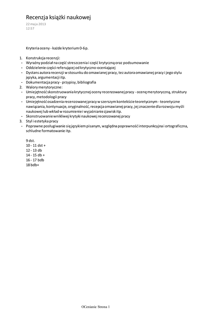 Recenzja książki naukowej 22 maja 2013 12:57 Kryteria oceny - każde kryterium 0-6 p. 1. 2. - 3. - Konstrukcja recenzji: Wyraźny podział na część streszczenia i część krytyczną oraz podsumowanie Oddzielenie części referującej od krytyczno-oceniającej Dystans autora recenzji w stosunku do omawianej pracy, tez autora omawianej pracy i jego stylu języka, argumentacji itp. Dokumentacja pracy - przypisy, bibliografia Walory merytoryczne: Umiejętność skonstruowania krytycznej oceny recenzowanej pracy - ocenę merytoryczną, struktury pracy, metodologii pracy Umiejętność osadzenia recenzowanej pracy w szerszym kontekście teoretycznym - teoretyczne nawiązania, kontynuacje, oryginalność, recepcja omawianej pracy, jej znaczenie dla rozwoju myśli naukowej lub wkład w rozumienie i wyjaśnianie zjawisk itp. Skonstruowanie wnikliwej krytyki naukowej recenzowanej pracy Styl i estetyka pracy Poprawne posługiwanie się językiem pisanym, względna poprawność interpunkcyjna i ortograficzna, schludne formatowanie itp. 9 dst. 10 - 11 dst + 12 - 13 db 14 - 15 db + 16 - 17 bdb 18 bdb+ OCenianie Strona 1