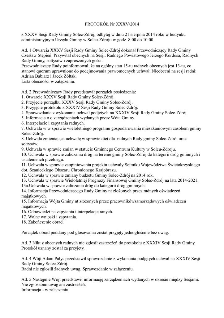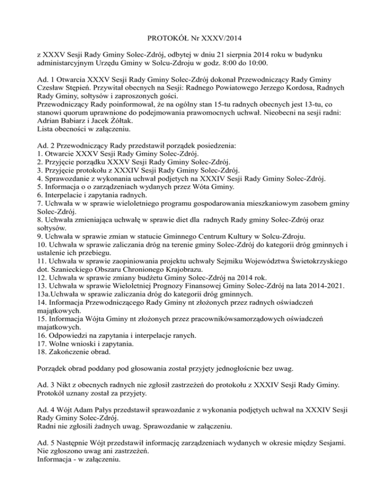 PROTOKÓŁ Nr XXXV/2014 z XXXV Sesji Rady Gminy Solec-Zdrój, odbytej w dniu 21 sierpnia 2014 roku w budynku administarcyjnym Urzędu Gminy w Solcu-Zdroju w godz. 8:00 do 10:00. Ad. 1 Otwarcia XXXV Sesji Rady Gminy Solec-Zdrój dokonał Przewodniczący Rady Gminy Czesław Stępień. Przywitał obecnych na Sesji: Radnego Powiatowego Jerzego Kordosa, Radnych Rady Gminy, sołtysów i zaproszonych gości. Przewodniczący Rady poinformował, że na ogólny stan 15-tu radnych obecnych jest 13-tu, co stanowi quorum uprawnione do podejmowania prawomocnych uchwał. Nieobecni na sesji radni: Adrian Babiarz i Jacek Żółtak. Lista obecności w załączeniu. Ad. 2 Przewodniczący Rady przedstawił porządek posiedzenia: 1. Otwarcie XXXV Sesji Rady Gminy Solec-Zdrój. 2. Przyjęcie porządku XXXV Sesji Rady Gminy Solec-Zdrój. 3. Przyjęcie protokołu z XXXIV Sesji Rady Gminy Solec-Zdrój. 4. Sprawozdanie z wykonania uchwał podjetych na XXXIV Sesji Rady Gminy Solec-Zdrój. 5. Informacja o o zarządzeniach wydanych przez Wóta Gminy. 6. Interpelacie i zapytania radnych. 7. Uchwała w w sprawie wieloletniego programu gospodarowania mieszkaniowym zasobem gminy Solec-Zdrój. 8. Uchwała zmieniająca uchwałę w sprawie diet dla radnych Rady gminy Solec-Zdrój oraz sołtysów. 9. Uchwała w sprawie zmian w statucie Gminnego Centrum Kultury w Solcu-Zdroju. 10. Uchwała w sprawie zaliczania dróg na terenie gminy Solec-Zdrój do kategorii dróg gminnych i ustalenie ich przebiegu. 11. Uchwała w sprawie zaopiniowania projektu uchwały Sejmiku Województwa Świetokrzyskiego dot. Szanieckiego Obszaru Chronionego Krajobrazu. 12. Uchwała w sprawie zmiany budżetu Gminy Solec-Zdrój na 2014 rok. 13. Uchwała w sprawie Wieloletniej Prognozy Finansowej Gminy Solec-Zdrój na lata 2014-2021. 13a.Uchwała w sprawie zaliczania dróg do kategorii dróg gminnych. 14. Informacja Przewodniczącego Rady Gminy nt złożonych przez radnych oświadczeń majątkowych. 15. Informacja Wójta Gminy nt złożonych przez pracownikówsamorządowych oświadczeń majatkowych. 16. Odpowiedzi na zapytania i interpelacje ranych. 17. Wolne wnioski i zapytania. 18. Zakończenie obrad. Porządek obrad poddany pod głosowania został przyjęty jednogłoścnie bez uwag. Ad. 3 Nikt z obecnych radnych nie zgłosił zastrzeżeń do protokołu z XXXIV Sesji Rady Gminy. Protokół uznany został za przyjety. Ad. 4 Wójt Adam Pałys przedstawił sprawozdanie z wykonania podjętych uchwał na XXXIV Sesji Rady Gminy Solec-Zdrój. Radni nie zgłosili żadnych uwag. Sprawozdanie w załączeniu. Ad. 5 Następnie Wójt przedstawił informację zarządzeniach wydanych w okresie między Sesjami. Nie zgłoszono uwag ani zastrzeżeń. Informacja - w załączeniu. Ad 6 W interpelacjach i zapytaniach radnych głos zabrali: Radny Czesław Zeliasz: - do powiatu: zgłasza do remontu drogę Piestrzec do Zołczy Ugory "Ściegna" droga popękana znisczona - czy te pomiary, które wykonywane są obecnie na wsi tj. obmiary budynków mieszkanlych i gospodarczych będą przekazane do podatków, - jakie są szanse na zwrot utraconych dochodów za warzywa i owoce. Radny Jerzy Łukasiewicz - do powiatu: o ograniczenie prędkości oraz wstawienie lustra na wylocie drogi z Włosnowic. W tej sprawie wysyłał pismo do Zarządu Dróg do Buska-Zdroju ale dostał odpowiedź odmowną. - do powiatu: poszerzenie drogi do Żukowa na wysokości chodnika, - dlaczego nie było informacji dla radnych i sołtysa ze Zborowa o odbiorze tej drogi. - na gminnych zawodach sportowo-pożarniczych tylko drużyna za Zborowa nie otrzymała pucharu Pan Radny Łukasiewicz wręczył Wójtowi 20,00 zł mówiąc"Na puchar daje 20,00 zł proszę kupić chłopakom puchar, bo wszystkim się należy tylko Zborowowi nie" Radny Włodzimierz Grabda: - do powiatu: na zakręcie drogi z Solca na Strażnik często dochodzi do wypadków, jest potrzeba zabezpieczenia go np. barierkami. - prośba o oddelegowanie dwóch panów z prac interwencyjnych do wykoszenia krzewów - nie świeci latarnia pod świetlica wiejską Radny Jan Żubrowski: - czy szkoły przygotowane sa na przyjście dzieci, czy były wykonywane remonty w szkołach podczas wakacji, - czy darmowe podręczniki dotarły do szkół dla 6-latków - Państwo ma dołożyc 75,00 zł do podręczników, czy takie pieniądze wpłynęły do naszej gminy - zauważył, że został uwzględniony wniosek sołtysa z Piasku Małego o dodatkowy kurs autobusu szkolnego, trasa Nr 2 busa ma bardzo napiete godziny, - czy wszystkie dzieci w szkole będa objęte dożywianiem bez względu na dochód - czy ustawa sejmowa programu dla rodzin wielodzietnych obowiązuje, czy radni muszą podejmować osobną uchwałę, ile rodzin by się kwalifikowało z naszej gminy, czy jakaś rodzina otrzyłała juz kartę dużej rodziny - na XXXIV seji poruszana była kwestia zabezbieczenia przepustu na strażnik, prace zostały wykonane jednak jeden słupek zabezpieczający zaginął, - zabezpieczyć zakręt za Solcem w kierunku Strażnika - w okresie wakcji zostały zniszczone 2 ławki pod szkołą - przy parkinkgu obok cmaentarza jest uschnięty kasztan Radny Józef Nowak: - do powiatu: między Kikowem a Sułkowicami zniszczone są oznakowania, - do powiatu: od Ogrodniczej w stronę Kikowa ściągnąć z poboczy muł - obok sklepu po wykopach na kanalizację zrobił się dół, trzeba to poprawić Radny Czesław Zeliasz: - do powiatu: dokończyć drogę Zborów-Piestrzec oraz droga Magierów-Piestrzec jest nieprzejezdna Radny Jan Powroźnik: - podziękowania remont drogi Zborów- Żuków - zgłasza remont drogi obok świetlicy Radny Jerzy Kopeć: - remont drogi do Angelusa Radny Stanisław Doktór: - odmulenie Rzeki Rzoski - lampy w Wełninie od "Klucza" do Kulisia oraz "na stawku" nie świecą sie 2 tygodnie - do powiatu: wykonwaca Piotrowski, który robi chodnik w Wełninie od 2 miesięcy nie pojawił się na placu budowy, przez wykopy po ulewach pozalewało ludziom podwórka - pan Grabo