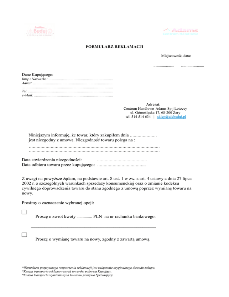FORMULARZ REKLAMACJI Miejscowość, data: ..................... ........................ Dane Kupującego: Imię i Nazwisko: ................................................................... Adres: ................................................................................... ............................................................................................... Tel. ........................................................................................ e-Mail: .................................................................................. Adresat: Centrum Handlowe Adams Sp.j Łotoccy ul. Górnośląska 17, 68-200 Żary tel. 514 514 634 | [email protected] Niniejszym informuję, że towar, który zakupiłem dnia ………………… jest niezgodny z umową. Niezgodność towaru polega na : ………………………………………………………………………………………… ………………………………………………………………………………………… Data stwierdzenia niezgodności: ………………………………… Data odbioru towaru przez kupującego: ………………………………... Z uwagi na powyższe żądam, na podstawie art. 8 ust. 1 w zw. z art. 4 ustawy z dnia 27 lipca 2002 r. o szczególnych warunkach sprzedaży konsumenckiej oraz o zmianie kodeksu cywilnego doprowadzenia towaru do stanu zgodnego z umową poprzez wymianę towaru na nowy. Prosimy o zaznaczenie wybranej opcji: Proszę o zwrot kwoty ................ PLN na nr rachunku bankowego: _________________________________________________________________ Proszę o wymianę towaru na nowy, zgodny z zawartą umową. *Warunkiem pozytywnego rozpatrzenia reklamacji jest załączenie oryginalnego dowodu zakupu. *Koszta transportu reklamowanych towarów pokrywa Kupujący. *Koszta transportu wymienionych towarów pokrywa Sprzedający.