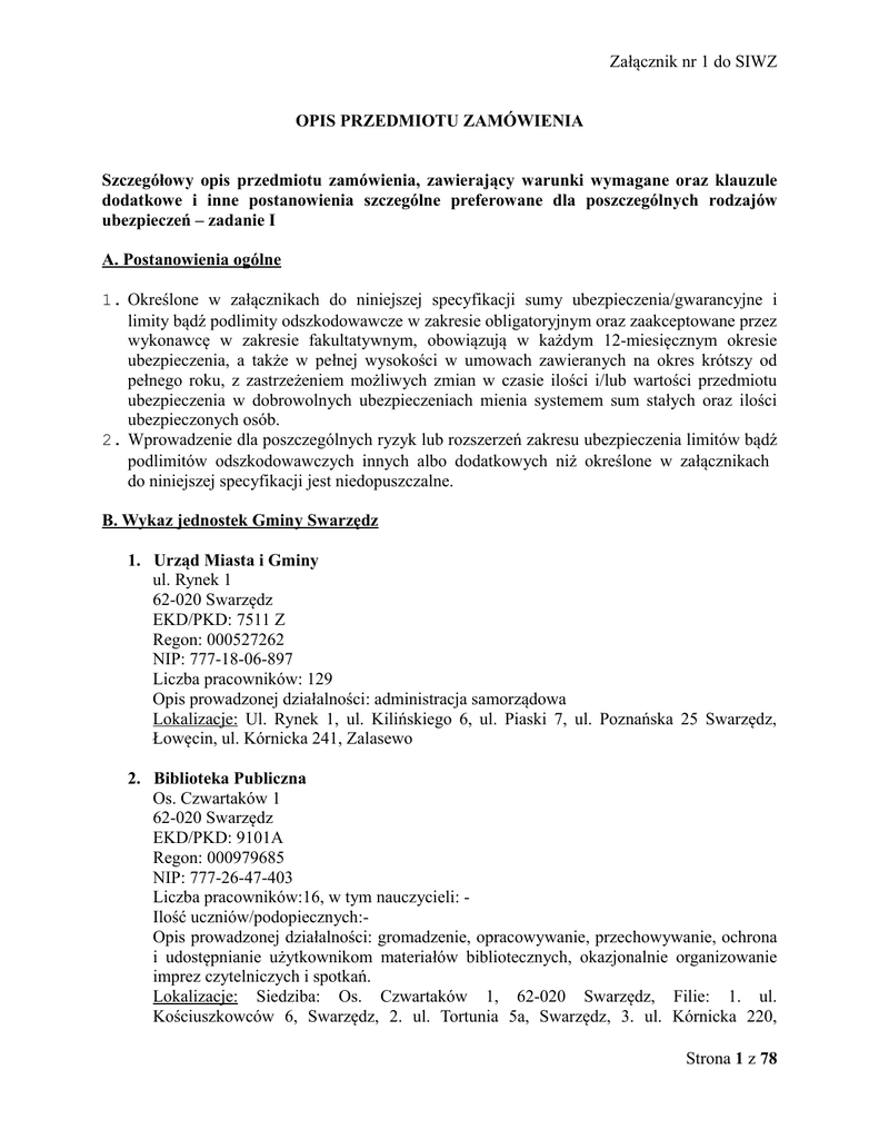 Załącznik nr 1 do SIWZ OPIS PRZEDMIOTU ZAMÓWIENIA Szczegółowy opis przedmiotu zamówienia, zawierający warunki wymagane oraz klauzule dodatkowe i inne postanowienia szczególne preferowane dla poszczególnych rodzajów ubezpieczeń – zadanie I A. Postanowienia ogólne 1. Określone w załącznikach do niniejszej specyfikacji sumy ubezpieczenia/gwarancyjne i limity bądź podlimity odszkodowawcze w zakresie obligatoryjnym oraz zaakceptowane przez wykonawcę w zakresie fakultatywnym, obowiązują w każdym 12-miesięcznym okresie ubezpieczenia, a także w pełnej wysokości w umowach zawieranych na okres krótszy od pełnego roku, z zastrzeżeniem możliwych zmian w czasie ilości i/lub wartości przedmiotu ubezpieczenia w dobrowolnych ubezpieczeniach mienia systemem sum stałych oraz ilości ubezpieczonych osób. 2. Wprowadzenie dla poszczególnych ryzyk lub rozszerzeń zakresu ubezpieczenia limitów bądź podlimitów odszkodowawczych innych albo dodatkowych niż określone w załącznikach do niniejszej specyfikacji jest niedopuszczalne. B. Wykaz jednostek Gminy Swarzędz 1. Urząd Miasta i Gminy ul. Rynek 1 62-020 Swarzędz EKD/PKD: 7511 Z Regon: 000527262 NIP: 777-18-06-897 Liczba pracowników: 129 Opis prowadzonej działalności: administracja samorządowa Lokalizacje: Ul. Rynek 1, ul. Kilińskiego 6, ul. Piaski 7, ul. Poznańska 25 Swarzędz, Łowęcin, ul. Kórnicka 241, Zalasewo 2. Biblioteka Publiczna Os. Czwartaków 1 62-020 Swarzędz EKD/PKD: 9101A Regon: 000979685 NIP: 777-26-47-403 Liczba pracowników:16, w tym nauczycieli: Ilość uczniów/podopiecznych:Opis prowadzonej działalności: gromadzenie, opracowywanie, przechowywanie, ochrona i udostępnianie użytkownikom materiałów bibliotecznych, okazjonalnie organizowanie imprez czytelniczych i spotkań. Lokalizacje: Siedziba: Os. Czwartaków 1, 62-020 Swarzędz, Filie: 1. ul. Kościuszkowców 6, Swarzędz, 2. ul. Tortunia 5a, Swarzędz, 3. ul. Kórnicka 220, Strona 1 z 78 Zalasewo, 4. ul. Akacjowa 14, Uzarzewo, 5. ul. Szkolna 3, Paczkowo, 6. ul. Dworcowa 2, Kobylnica 3. Gimnazjum im. M.Kopernika w Zalasewie ul. Planetarna 7 62-020 Swarzędz EKD/PKD: 8531A Regon: 639617250 NIP: 777-23-90-803 Liczba pracowników: 65, w tym nauczycieli: 49 Ilość uczniów/podopiecznych: Opis prowadzonej działalności: działalność organizowanie imprez szkolnych Lokalizacje: ul. Planetarna 7, 62-020 Swarzędz edukacyjna, zajęcia pozalekcyjne, 4. Gimnazjum Nr 2 ul. Polna 21 62-020 Swarzędz EKD/PKD: 8531A Regon: 639617272 NIP: 777-23-89-970 Liczba pracowników: 81, w tym nauczycieli: 63 Ilość uczniów/podopiecznych: Opis prowadzonej działalności: działalność dydaktyczno – wychowawcza Lokalizacje: ul. Polna 21, 62-020 Swarzędz 5. Gimnazjum Nr 3 im. Polskich Noblistów Os. Czwartaków 1 62-020 Swarzędz EKD/PKD: 8031A Regon: 639610991 NIP: 777-23-83-097 Liczba pracowników: 70, w tym nauczycieli: 46 Ilość uczniów/podopiecznych: Opis prowadzonej działalności: administracja samorządowa Lokalizacje: Os. Czwartaków 1, 62-020 Swarzędz 6. Ośrodek Kultury ul. Piaski 4 62-020 Swarzędz EKD/PKD: 9004Z, 9231F Regon: 000753870 NIP: 777-17-93-255 Liczba pracowników:9, w tym nauczycieli: Ilość uczniów/podopiecznych: Opis prowadzonej działalności: kółka zainteresowań, sekcje, organizacja imprez Lokalizacje: ul. Piaski 4, 62-020 Swarzędz 7. Ośrodek Pomocy Społecznej ul. Poznańska 25, 62-020 Swarzędz Strona 2 z 78 62-020 Swarzędz EKD/PKD: 8532C Regon: 631000187 NIP: 777-14-01-574 Liczba pracowników: 69, w tym nauczycieli: Ilość uczniów/podopiecznych:Opis prowadzonej działalności: opieka społeczna Lokalizacje: ul. Poznańska 25, ul. Działkowa 61A, os. Czwartaków 9 (świetlica terapeutyczna „Nasza Dziupla”), ul. Piaski 4 (Miejsko – Gminny Ośrodek Wsparcia), 62020 Swarzędz 8. Swarzędzkie Centrum Sportu i Rekreacji ul. Kosynierów 1 62-020 Swarzędz EKD/PKD: 8551Z Regon: 300962712 NIP: 777-26-60-800 Liczba pracowników: 65, w tym nauczycieli:Ilość uczniów/podopiecznych:Opis prowadzonej działalności: działalność sportowo - rekreacyjna Lokalizacje: ul. Kosynierów 1, ul. Św. Marcin 1, 62-020 Swarzędz 9. Przedszkole Nr 1 ul. Zamkowa 26 62-020 Swarzędz EKD/PKD: b/d Regon: 632049451 NIP: 777-18-86-287 Liczba pracowników: 20, w tym nauczycieli: 9 Ilość uczniów/podopiecznych:Opis prowadzonej działalności: opiekuńczo- wychowawcza-dydaktyczna Lokalizacje: ul. Zamkowa 26, 62-020 Swarzędz 10. Przedszkole Nr 2 Os. Czwartaków 8 62-020 Swarzędz EKD/PKD: 8010A Regon: 632049400 NIP: 777-17-90-920 Liczba pracowników: 24, w tym nauczycieli: 12 Ilość uczniów/podopiecznych: Opis prowadzonej działalności: działalność, opiekuńczo - wychowawcza Lokalizacje: Os. Czwartaków 8, 62-020 Swarzędz 11. Przedszkole Nr 3 ul. Kórnicka 21, 62-020 Swarzędz 62-020 Swarzędz EKD/PKD: 8010A Regon: 632049362 NIP: 777-18-21-715 Strona 3 z 78 Liczba pracowników: 17, w tym nauczycieli: b/d Ilość uczniów/podopiecznych: Opis prowadzonej działalności: administracja samorządowa Lokalizacje: ul. Kórnicka 21, 62-020 Swarzędz 12. Przedszkole Nr 4 „Bajkowy Świat” Os. Mielżyńskiego 19 62-020 Swarzędz EKD/PKD: 853212 Regon: 639798724 NIP: 777-25-16-285 Liczba pracowników: 33, w tym nauczycieli: 14 Ilość uczniów/podopiecznych:175 Opis prowadzonej działalności: przedszkole Lokalizacje: Os. Mielżyńskiego 19, 62-020 Swarzędz, Filia Os. Raczyńskiego 19, 62-020 Swarzędz 13. Przedszkole Nr 5 „Zielona Półnutka” Os. Kościuszkowców 2 62-020 Swarzędz EKD/PKD: 8010A Regon: 632049385 NIP: 777-18-98-238 Liczba pracowników: 45, w tym nauczycieli: 23 Ilość uczniów/podopiecznych: Opis prowadzonej działalności: opiekuńczo - wychowawcza Lokalizacje: Os. Kościuszkowców 2, 62-020 Swarzędz 14. Przedszkole w Kobylnicy ul. Poznańska 55 62-006 Kobylnica EKD/PKD: 8510Z Regon: 632049422 NIP: 777-21-49-527 Liczba pracowników: 11, w tym nauczycieli: 5 Ilość uczniów/podopiecznych: Opis prowadzonej d