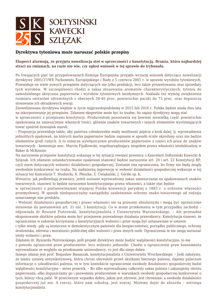 Dyrektywa tytoniowa może naruszać polskie przepisy Eksperci alarmują, że przyjęta nowelizacja stoi w sprzeczności z konstytucją. Branża, która najbardziej straci na zmianach, na razie nie wie, czy zgłosi wniosek w tej sprawie do trybunału. Po trwających pięć lat przygotowaniach Komisja Europejska przyjęła wczoraj wniosek dotyczący nowelizacji dyrektywy 2001/37/WE Parlamentu Europejskiego i Rady z 5 czerwca 2001 r. w sprawie wyrobów tytoniowych. Przewiduje on wiele nowych przepisów dotyczących nie tylko produkcji, lecz także prezentowania oraz sprzedaży tych wyrobów. W szczególności chodzi o zakaz stosowania aromatów charakterystycznych, tytoniu do samodzielnego skręcania papierosów i wyrobów tytoniowych bezdymnych. Nakłada też wymóg zwiększenia rozmiaru ostrzeżeń zdrowotnych z obecnych 30-40 proc. powierzchni paczki do 75 proc. oraz dopuszcza stosowanie ich obrazkowych wersji. Znowelizowana dyrektywa wejdzie w życie najprawdopodobniej w 2015 lub 2016 r. Polska będzie miała dwa lata na inkorporowanie jej przepisów. Zdaniem ekspertów może być to trudne, bo zapisy dyrektywy mogą stać w sprzeczności z przepisami konstytucji. Producentom pozostawia się bowiem niewielką część powierzchni opakowania na umieszczenie własnych treści, głównie znaków towarowych i innych elementów wyróżniających towar spośród dziesiątek marek. – Propozycja przewiduje także, aby państwa członkowskie miały możliwość pójścia o krok dalej, tj. wprowadzenia jednolitych opakowań, na których marka papierosów będzie zapisana w sposób ściśle określony oraz nie będzie elementów grafi cznych. A to oznacza wywłaszczenie producentów papierosów z części ich praw do znaków towarowych – komentuje mec. Marcin Fijałkowski, współzarządzający zespołem prawa własności intelektualnej w Baker & McKenzie. Na naruszenie przepisów konstytucji wskazują w tej sytuacji również prawnicy z Kancelarii Sołtysiński Kawecki & Szlęzak. Ich zdaniem ustandaryzowanie opakowań stanowić będzie naruszenie art. 20 i art. 22 Konstytucji RP, czyli norm dotyczących wolności działalności gospodarczej. Zostanie ona ograniczona, bo firmy nie będą mogły swobodnie konkurować na rynku. Na nadmierną ingerencję w wolność działalności gospodarczej wskazuje w tej sytuacji też Kancelaria T. Studnicki, K. Płeszka, Z. Ćwiąkalski, J. Górski sp. k. Wreszcie, jak podkreślają prawnicy, jeżeli zostanie wprowadzony zakaz umieszczania na opakowaniach znaków towarowych, stanowić to będzie naruszenie konstytucyjnego prawa własności, a także stać będzie w sprzeczności z postanowieniami wiążącej Polskę konwencji paryskiej z 1883 r. o ochronie własności przemysłowej. W sposób niedopuszczalny nastąpiłoby uzależnienie ochrony znaku towarowego od rodzaju oznaczanego nim produktu. – Wolność działalności gospodarczej i prawo własności nie są prawami absolutnymi i mogą być ograniczone stosownie do postanowień art. 31 ust. 3 konstytucji. Co w moim przekonaniu w tym przypadku zachodzi – odpowiada dr Ryszard Piotrowski, konstytucjonalista z Uniwersytetu Warszawskiego. – Ale przesadne eksponowanie skutków palenia może być przejawem przesadnego działania prawodawcy. Konstytucja stanowi, że ograniczenia w zakresie korzystania z konstytucyjnych wolności i praw mogą być ustanawiane w ustawie i tylko wtedy, gdy są konieczne w demokratycznym państwie dla bezpieczeństwa, porządku publicznego, ochrony środowiska, zdrowia i moralności publicznej albo wolności i praw innych osób. Ograniczenia te nie mogą naruszać istoty wolności i praw. Zdaniem dr. Ryszarda Piotrowskiego, jeśli projekt dyrektywy może budzić wątpliwości konstytucyjne, to nie z powodu ograniczeń praw producentów, lecz wolności jednostki. Chodzi o ograniczenie praw konsumenta wprowadzane ze względu na przekonanie ustawodawcy, co jest dla niego dobre. Innego zdania jest prof. Bogusław Banaszak, konstytucjonalista z Uniwersytetu Wrocławskiego. – Jeśli założymy, że mamy ustawę antynikotynową, która chroni obywateli przed skutkami biernego palenia, dajemy palaczom informacje o szkodliwości palenia, to w tym kontekście ograniczenie swobody działalności gospodarczej budzi wątpliwości konstytucyjne – mówi prawnik. – Bo albo wprowadzamy całkowity zakaz palenia i zakazujemy obrotu papierosami, albo dopuszczamy go i pozwalamy producentom w warunkach swobody gospodarczej konkurować o tych, którzy chcą palić. W przeciwnym wypadku dobro, jakim jest zdrowie, jest chronione, a swoboda działalności gospodarczej już nie. A rzeczy, które nam szkodzą, jest więcej. Możemy dojść do absurdu – ostrzega konstytucjonalista. Koncerny tytoniowe, które na skutek nowych zapisów dyrektywy ucierpią najbardziej, nie zabierają na razie głosu. – Nie wiemy jeszcze, jaki będzie ostateczny kształt przepisów, które będą obowiązywać w Polsce. Nie możemy oceniać w związku z tym, jakie ewentualne kroki podejmowałaby firma w tym zakresie – mówi Joanna Grabowska z Imperial Tobacco Polska. Dlaczego Bruksela chce zmienić przepisy w sprawie wyrobów tytoniowych. Od czasu przyjęcia obowiązującej jeszcze dyrektywy pojawiły się nowe dowody dotyczące szkodliwości środków aromatyzujących stosowanych w wyrobach tytoniowych oraz skuteczności ostrzeżeń zdrowotnych. Na szczeblu międzynarodowym UE i wszystkie jej państwa członkowskie ratyfikowały ramową konwencję Światowej Organizacji Zdrowia o ograniczeniu użycia tytoniu, która weszła w życie w lutym 2005 r. W związku z tym niektóre z obowiązujących przepisów dotychczasowej dyrektywy zdezaktualizowały się.